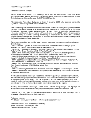 Raport bieżący nr 27/2013 Powołanie Członka Zarządu Zarząd ELEKTROBUDOWY SA informuje, że w dniu 16 października 2013 roku Rada Nadzorcza Spółki podjęła uchwałę o powołaniu z dniem 1 stycznia 2014 roku Pana Adama Świgulskiego na Członka Zarządu ELEKTROBUDOWY SA. Równocześnie Pan Adam Świgulski z dniem 1 stycznia 2014 roku obejmie stanowisko Dyrektora Finansowego ELEKTROBUDOWY SA. Pan Adam Świgulski posiada wykształcenie wyższe. W roku 1996 uzyskał tytuł magistra na kierunku Finanse i Rachunkowość Przedsiębiorstw na Akademii Ekonomicznej w Poznaniu. Dodatkowo ukończył studia podyplomowe: w roku 1998 w zakresie rachunkowości i finansów na Akademii Ekonomicznej w Poznaniu oraz w roku 2002 w zakresie zarządzania wartością firmy w Szkole Głównej Handlowej w Warszawie. W roku 2011 ukończył z wyróżnieniem Studia Executive Master of Business Administration w Wielkopolskiej Szkole Biznesu i Nottingham Trent University. Zajmowane wcześniej stanowiska wraz z opisem przebiegu pracy zawodowej pana Adama Świgulskiego: • 2011 – obecnie Dyrektor ds. Finansów. Prokurent. Przedsiębiorstwo Budowy Kopalń PeBeKa S.A., Grupa Kapitałowa KGHM Polska Miedź S.A. • 2010 – 2011 Dyrektor ds. Handlu i Finansów. Prokurent. Przedsiębiorstwo Budowy Kopalń PeBeKa S.A., Grupa Kapitałowa KGHM Polska Miedź S.A. • 2008 – 2010 Kierownik projektu wdrożenia systemu ERP (mySAP). Przedsiębiorstwo Budowy Kopalń PeBeKa S.A., Grupa Kapitałowa KGHM Polska Miedź S.A. • 2004 - 2010 Główny Specjalista ds. Controllingu i Finansów. Przedsiębiorstwo Budowy Kopalń PeBeKa S.A., Grupa Kapitałowa KGHM Polska Miedź S.A. • 1997 - 2004 Kierownik Działu Finansów. Przedsiębiorstwo Budowy Kopalń PeBeKa S.A., Grupa Kapitałowa KGHM Polska Miedź S.A. • 1996 – 1997 Specjalista w dziale controllingu. Przedsiębiorstwo Budowy Kopalń PeBeKa S.A., Grupa Kapitałowa KGHM Polska Miedź S.A. Ponadto: • 2005-2006 Nauczyciel akademicki. Uczelnia Zawodowa Zagłębia Miedziowego w Lubinie. • 1999-2004 Pośrednictwo finansowe i usługowe prowadzenie ksiąg rachunkowych. Własna działalność gospodarcza. Według oświadczenia złożonego przez Pana Adama Świgulskiego Spółce nie prowadzi on, ani nie uczestniczy w prowadzeniu działalności, która byłaby konkurencyjna w stosunku do działalności ELEKTROBUDOWY SA, nie uczestniczy w innej spółce konkurencyjnej, jako wspólnik spółki cywilnej, spółki osobowej lub jako członek organu spółki kapitałowej oraz nie uczestniczy w innej konkurencyjnej osobie prawnej, jako członek jej organu. Według oświadczenia złożonego przez Pana Adama Świgulskiego nie figuruje on w Rejestrze Dłużników Niewypłacalnych prowadzonym na podstawie ustawy o KRS. Zgodnie z § 5 ust.1 pkt. 22 Rozporządzenia Ministra Finansów z dnia 19 lutego 2009 r. w sprawie informacji bieżących i okresowych. Podstawa prawna: Art. 56 ust. 1 pkt 2 Ustawy o ofercie - informacje bieżące i okresowe Nazwiska i imiona osób składających podpisy: Jacek Faltynowicz – Prezes Zarządu, Sławomir Wołek - Członek Zarządu.