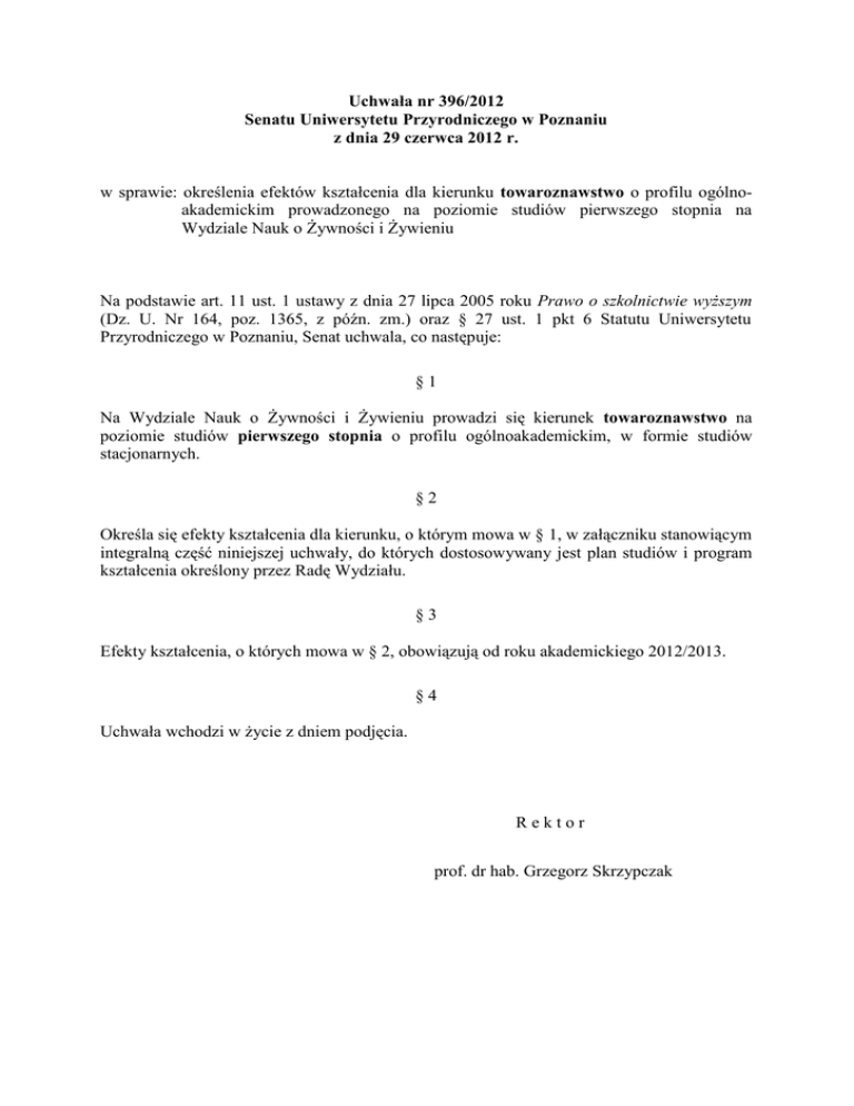 Uchwała nr 396/2012 Senatu Uniwersytetu Przyrodniczego w Poznaniu z dnia 29 czerwca 2012 r. w sprawie: określenia efektów kształcenia dla kierunku towaroznawstwo o profilu ogólnoakademickim prowadzonego na poziomie studiów pierwszego stopnia na Wydziale Nauk o Żywności i Żywieniu Na podstawie art. 11 ust. 1 ustawy z dnia 27 lipca 2005 roku Prawo o szkolnictwie wyższym (Dz. U. Nr 164, poz. 1365, z późn. zm.) oraz § 27 ust. 1 pkt 6 Statutu Uniwersytetu Przyrodniczego w Poznaniu, Senat uchwala, co następuje: §1 Na Wydziale Nauk o Żywności i Żywieniu prowadzi się kierunek towaroznawstwo na poziomie studiów pierwszego stopnia o profilu ogólnoakademickim, w formie studiów stacjonarnych. §2 Określa się efekty kształcenia dla kierunku, o którym mowa w § 1, w załączniku stanowiącym integralną część niniejszej uchwały, do których dostosowywany jest plan studiów i program kształcenia określony przez Radę Wydziału. §3 Efekty kształcenia, o których mowa w § 2, obowiązują od roku akademickiego 2012/2013. §4 Uchwała wchodzi w życie z dniem podjęcia. Rektor prof. dr hab. Grzegorz Skrzypczak Załącznik do uchwały nr 396/2012 Senatu UP Efekty kształcenia dla kierunku studiów towaroznawstwo i ich odniesienie do efektów obszarowych Wydział prowadzący kierunek: Wydział Nauk o Żywności i Żywieniu Poziom kształcenia: studia I stopnia Profil kształcenia: ogólnoakademicki Forma kształcenia: studia stacjonarne Przyporządkowanie kierunku do: obszaru kształcenia: nauki społeczne; nauki rolnicze, leśne i weterynaryjne dziedziny nauki: nauki ekonomiczne; nauki rolnicze dyscypliny naukowej: towaroznawstwo Tytuł zawodowy uzyskiwany przez absolwenta: inżynier Liczba punktów ECTS konieczna do uzyskania tytułu zawodowego: 210 Odniesienie Odniesienie do do efektów Symbol Opis efektów kształcenia dla kierunku kompetencji obszarowych inżynierskich WIEDZA zna i rozumie podstawowe pojęcia S1A_W01 ekonomiczne oraz znaczenie ekonomii TO1A_W01 InzA_W03 i innych nauk społecznych R1A_W02 w towaroznawstwie S1A_W09 ma wiedzę o poglądach na temat struktur TO1A_W02 i instytucji ekonomicznych, społecznych S1A_W04 InzA_W03 i kulturowych i o ich historycznej ewolucji R1A_W02 S1A_W05 zna i rozumie zasady podejmowania decyzji TO1A_W03 InzA_W03 rynkowych konsumenta i producenta R1A_W02 S1A_W02 S1A_W03 zna i rozumie mechanizmy funkcjonowania TO1A_W04 InzA_W03 rynków branżowych S1A_W07 R1A_W02 zna i rozumie podstawowe metody analizy S1A_W06 TO1A_W05 zjawisk i procesów rynkowych w mikroInzA_W03 R1A_W02 i makroskali S1A_W02 S1A_W07 zna i rozumie struktury organizacyjne InzA_W03 TO1A_W06 przedsiębiorstw działających w ramach S1A_W08 InzA_W04 gospodarki rynkowej R1A_W02 R1A_W09 S1A_W05 zna i rozumie zasady zarządzania TO1A_W07 przedsiębiorstwami działającymi w ramach InzA_W04 S1A_W07 gospodarki rynkowej R1A_W09 1 TO1A_W08 TO1A_W09 TO1A_W10 TO1A_W11 TO1A_W12 TO1A_W13 TO1A_W14 TO1A_W15 TO1A_W16 TO1A_W17 TO1A_W18 TO1A_W19 TO1A_W20 TO1A_W21 TO1A_W22 zna podstawy prawne założenia i funkcjonowania działalności gospodarczej oraz zasady opracowania biznes planu zna zasady planowania strategii marketingowej przedsiębiorstwa zna pojęcie marki oraz jej rolę w kształtowaniu pozycji rynkowej przedsiębiorstwa zna i rozumie implikacje marketingowe różnic między rynkami produktów konsumenckich i przemysłowych ma podstawową wiedzę prawną w zakresie bezpieczeństwa żywności, jakości handlowej artykułów rolno-spożywczych i ochrony konsumenta rozumie prawne skutki podejmowanych działań rozumie podstawowe pojęcia z zakresu prawa zna i rozumie podstawowe pojęcia i zasady z zakresu ochrony własności przemysłowej i prawa autorskiego rozumie pojęcie innowacyjności i jej rolę w gospodarce rynkowej rozumie istotę zagrożeń środowiskowych i ochrony środowiska naturalnego zna podstawowe wielkości fizyczne i chemiczne oraz rozumie zjawiska fizyczne i procesy chemiczne zachodzące w przyrodzie zna metody matematycznego opisu zjawisk fizycznych i chemicznych wskazuje na zagrożenia fizyczne, chemiczne i mikrobiologiczne żywności w cyklu produkcyjnym zna i rozumie procesy jednostkowe, jakie towarzyszą fizycznemu, chemicznemu i biologicznemu przetwarzaniu surowców w procesach wytwarzania produktów zna i rozumie zjawiska i procesy biochemiczne i mikrobiologiczne stosowane w technice oraz występujące w życiu codziennym S1A_W02 S1A_W07 S1A_W11 R1A_W02 R1A_W09 InzA_W04 S1A_W06 InzA_W04 S1A_W02 InzA_W03 S1A_W03 InzA_W03 S1A_W07 R1A_W02 InzA_W03 S1A_W08 R1A_W02 S1A_W07 R1A_W02 S1A_W07 S1A_W10 R1A_W08 InzA_W03 InzA_W03 InzA_W03 R1A_W09 InzA_W03 R1A_W06 InzA_W03 R1A_W01 R1A_W01 R1A_W03 R1A_W03 InzA_W02 R1A_W03 R1A_W04 InzA_W02 InzA_W05 2 TO1A_W23 TO1A_W24 TO1A_W25 TO1A_W26 TO1A_W27 TO1A_W28 TO1A_W29 TO1A_W30 TO1A_W31 TO1A_W32 TO1A_W33 TO1A_W34 TO1A_W35 TO1A_W36 TO1A_W37 ma wiedzę z zakresu sensorycznych i instrumentalnych metod oceny jakości surowców i produktów oraz statystycznego opisu danych doświadczalnych wskazuje metody analizy porównawczej produktów żywnościowych i przemysłowych wskazuje rodzaje i źródła surowców stosowanych w produkcji żywności i artykułów przemysłowych zna właściwości surowców i określa ich dobór do zastosowań technicznych i technologicznych oraz wskazuje metody ich identyfikacji w produktach zna metody i warunki przechowywania towarów oraz ich wpływ na jakość produktów zna rodzaje i właściwości materiałów opakowaniowych i potrafi dobrać je do danego produktu czyta rysunki i schematy maszyn, urządzeń i układów technicznych i technologicznych zna czynniki determinujące jakość produktów w całym cyklu ich życia rozumie znaczenie systemowego podejścia w zarządzaniu jakością zna zasady funkcjonowania i projektowania systemów zarządzania jakością w przedsiębiorstwach produkcyjnych i usługowych rozumie zasady stosowania statystycznej kontroli procesów i jej rolę w kształtow