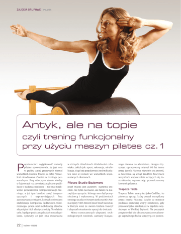 ZAJĘCIA GRUPOWE | PILATES Antyk, ale na topie czyli trening funkcjonalny przy uyciu maszyn pilates cz.1 opularnoÊç i wyjàtkowoÊç metody pilates spowodowa∏a, ˝e jest ona w grafiku zaj´ç grupowych niemal wszystkich klubów fitness w ca∏ej Polsce. Jest nieodzowna równie˝ w treningu personalnym. Przy obecnym stanie wiedzy o fizjoterapii co potwierdzajà liczne publikacje i badania naukowe – nie ma mo˝liwoÊci prowadzenia kompleksowego treningu, a ju˝ tym bardziej zaj´ç terapeutycznych i usprawniajàcych bez zastosowania çwiczeƒ, których celem jest stabilizacja kompleksu l´dêwiowo-miednicznego, praca nad mobilizacjà stawów, si∏à mi´Êni i ich elastycznoÊcià. Te w∏aÊnie cele, b´dàce podstawà dzia∏aƒ metody pilates, sprawi∏y, ˝e jest ona stosowana P | trainer 1/013 w ró˝nych dziedzinach dzia∏alnoÊci cz∏owieka, takich jak: sport, rekreacja, rehabilitacja. Stàd te˝ popularnoÊç techniki pilates oraz jej rozwój we wszystkich wspomnianych obszarach. Pilates Studio Equipment Josef Pilates jest autorem systemu çwiczeƒ, nie tylko na macie, ale tak˝e na niezwyk∏ym sprz´cie, którego sam by∏ pomys∏odawcà i wykonawcà. W podziemiach swojego studia w Nowym Jorku na 8th Avenue (przy 56th Street) Josef mia∏ warsztat, w którym wraz ze swoim bratem tworzy∏ i ulepsza∏ nieustannie sprz´t do çwiczeƒ. Mimo nowoczesnych ulepszeƒ, technologicznych nowinek, zamiany klasycz- nego drewna na aluminium, designu itp. sprz´t opracowany niemal 80 lat temu przez Josefa Pilatesa niewiele si´ zmieni∏, a çwiczenia sà wcià˝ êród∏em fascynacji wszystkich wspó∏czeÊnie uczàcych si´ instruktorów, wyznaczajàc ponadczasowy kierunek pilatesa. Trapeze Table Trapeze Table, znany te˝ jako Cadillac, to pierwszy sprz´t, który zosta∏ wymyÊlony przez Josefa Pilatesa. Mia∏o to miejsce podczas pierwszej wojny Êwiatowej, gdy pracowa∏ jako sanitariusz w szpitalu wojskowym w Wielkiej Brytanii. Na poczàtek przytwierdzi∏ do obramowania metalowego szpitalnego ∏ó˝ka spr´˝yny, co pozwo- PILATES li∏o mu na usprawnianie pacjentów, którzy nie byli w stanie si´ z niego podnieÊç. Widzàc niezwyk∏e efekty zastosowanej przez siebie metody, doda∏ pe∏ne obramowanie ∏ó˝ka, do którego przytwierdzi∏ pionowe rury, a na nich umieszcza∏ coraz to nowe systemy rurek poziomych, pasków skórzanych i spr´˝yn. Ka˝da z modyfikacji powstawa∏a na drodze poszukiwania nowych çwiczeƒ i mo˝liwoÊci ruchowych. Tak powsta∏ Cadillac król wÊród wszystkich sprz´tów, nieodzowny w ka˝dym profesjonalnym studio pilatesa. To wyjàtkowe „∏o˝e” cudownie sprawdza si´ w uczeniu ludzi na wszystkich poziomach zaawansowania w pilatesie. To jednoczeÊnie najwi´kszy ze sprz´tów do pilatesa, który daje mo˝liwoÊç unoszenia cz´Êci. 1 „hanging up”) podparcia przy u˝yciu tower bar (patrz zdj. 2 „paraket”) lub rolldown bar. W tak niezwyk∏ych pozycjach wykonuje si´ wiele çwiczeƒ, które dziÊ okreÊla si´ mianem treningu funkcjonalnego, gdzie ca∏e cia∏o zmaga si´ z grawitacjà. W powstajàcych dziÊ nowoczesnych formach treningu, takich jak choçby systemy podwieszane, odnajdujemy bardzo wiele elementów çwiczeƒ, które od wielu lat daje pilates przy u˝yciu Cadillaca. Trapeze Table | ZAJĘCIA GRUPOWE Reformer Reformer Reformer, podobnie jak Cadillac, ma kszta∏t zbli˝ony do ∏ó˝ka, jednak w odró˝nieniu od Trapeze Table posiada ruchomà platform´. System spr´˝yn i linek (u Josefa Pilatesa by∏y to paski skórzane) pozwala na wykonywanie wielu kombinacji çwiczeƒ, a dzi´ki ruchomej platformie wiele z nich przybiera charakter tzw. çwiczeƒ równowa˝nych. Reformer gwarantuje zajmujàce i efektywne treningi dostosowane do indywidualnych potrzeb klientów. åwiczenia na tym sprz´cie wp∏ywajà doskonale na zwi´kszenie si∏y i elastycznoÊci mi´Êni, a dzi´ki zastosowaniu jumping board (dodatkowej pionowej platformy) mo˝na wykonywaç dynamiczne çwiczenia cardio, poprawiajàce kondycj´. W∏aÊnie przy u˝yciu jumping board wykonuje si´ na Reformerze podskoki na jednej lub obu nogach w le˝eniu tyłem, bokiem lub w kl´ku na platformie. Podło˝enie pod biodra małych piłeczek Franklina, stawi dodatkowe wyzwanie dla równowagi. To znów kolejne przykłady treningu funkcjonalnego, podobnie jak i cała gama çwiczeƒ na Reformerze w pozycji stojàcej, gdzie jedna stopa znajduje si´ na ruchomej platformie, a druga na przykład na footbar – çwiczenie „splits front” (patrz zdj. 3). Jeszcze wi´kszym wyzwaniem jest wykonanie pompek, lub utrzymanie pozycji podporu Wunda Chair trainer 1/013 | 3 ZAJĘCIA GRUPOWE | PILATES Aneta Figurska - współwłaściciel Szkoły Open Mind, prezenter i szkoleniowiec, twórca licznych programów szkoleniowych fitness i pilates. Właściciel Open Mind Pilates Studio w Szczecinie. www.fitness-om.pl, www-pilates-om.pl Spine Corrector Ladder Barrel wyzwanie dla ca∏ego cia∏a. Jest to doskona∏y sprz´t do wzmacniania nie tylko si∏y mi´Êni, ale te˝ przez swój wyjàtkowy kszta∏t do poprawy elastycznoÊci. Wszystkie çwiczenia anga˝ujà ca∏e cia∏o, czego doskona∏ym przyk∏adem jest çwiczenie „horseback” – naÊladujàce jazd´ konnà (patrz zdj. 7). Wygi´cia do ty∏u ze skr´tem (patrz zdj. 8) i zmodyfikowany „swan” mobilizujà w sposób funkcjonalny nasz kr´gos∏up. Spine Corrector przodem, gdy znajdujàca si´ pod ciałem platforma jest ruchoma (patrz zdj.4) „control front”. z wielu przyk∏adów tak kompleksowego, a zarazem funkcjonalnego çwiczenia, sà: „forward lunge” (patrz zdj. 5) czy te˝ „teaser” (patrz zdj. 6). Wunda Chai r Cudowne krzes∏o to, obok Trapeze Table, jeden z pierwszych sprz´tów, jakie wynalaz∏ Josef Pilates. Zaprojektowa∏ zresztà kilka typów takich krzese∏. Oryginalne krzes∏o mia∏o jednà spr´˝yn´ po∏àczonà z jednym peda∏em. DziÊ tych spr´˝yn mo˝e byç kilka, a peda