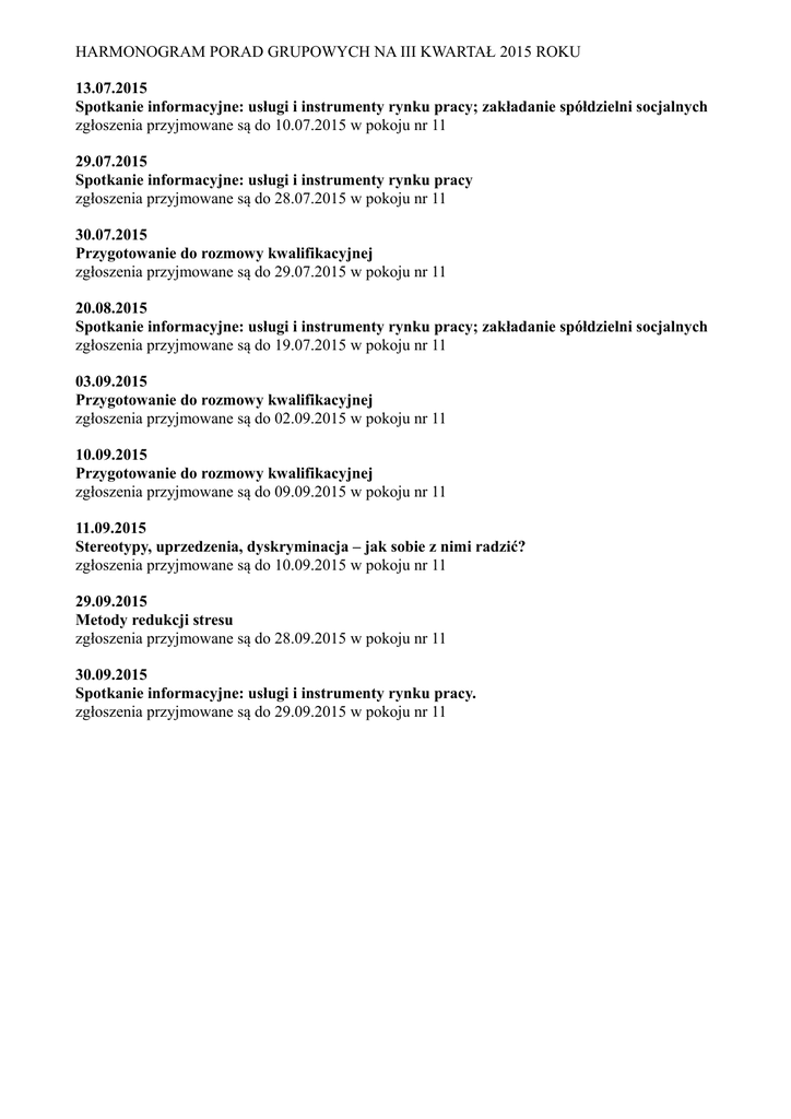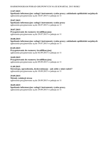 HARMONOGRAM PORAD GRUPOWYCH NA III KWARTAŁ 2015 ROKU 13.07.2015 Spotkanie informacyjne: usługi i instrumenty rynku pracy; zakładanie spółdzielni socjalnych zgłoszenia przyjmowane są do 10.07.2015 w pokoju nr 11 29.07.2015 Spotkanie informacyjne: usługi i instrumenty rynku pracy zgłoszenia przyjmowane są do 28.07.2015 w pokoju nr 11 30.07.2015 Przygotowanie do rozmowy kwalifikacyjnej zgłoszenia przyjmowane są do 29.07.2015 w pokoju nr 11 20.08.2015 Spotkanie informacyjne: usługi i instrumenty rynku pracy; zakładanie spółdzielni socjalnych zgłoszenia przyjmowane są do 19.07.2015 w pokoju nr 11 03.09.2015 Przygotowanie do rozmowy kwalifikacyjnej zgłoszenia przyjmowane są do 02.09.2015 w pokoju nr 11 10.09.2015 Przygotowanie do rozmowy kwalifikacyjnej zgłoszenia przyjmowane są do 09.09.2015 w pokoju nr 11 11.09.2015 Stereotypy, uprzedzenia, dyskryminacja – jak sobie z nimi radzić? zgłoszenia przyjmowane są do 10.09.2015 w pokoju nr 11 29.09.2015 Metody redukcji stresu zgłoszenia przyjmowane są do 28.09.2015 w pokoju nr 11 30.09.2015 Spotkanie informacyjne: usługi i instrumenty rynku pracy. zgłoszenia przyjmowane są do 29.09.2015 w pokoju nr 11