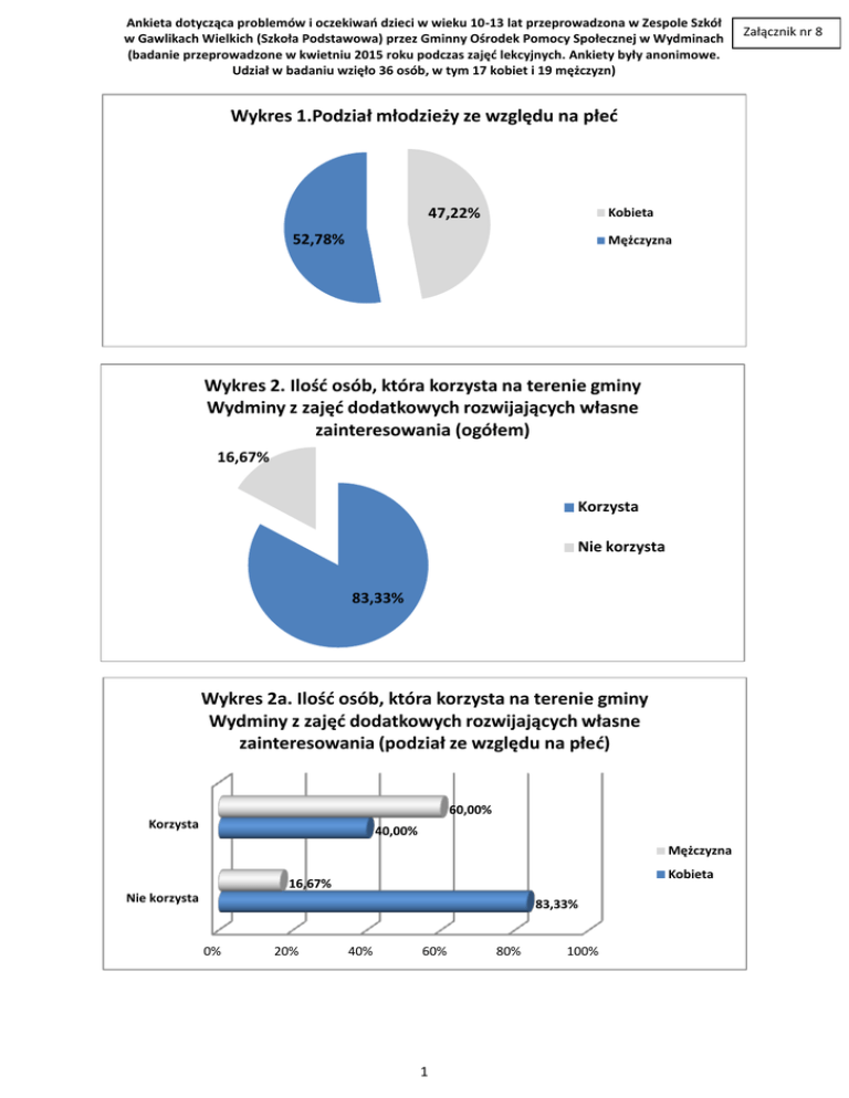 Ankieta dotycząca problemów i oczekiwań dzieci w wieku 10-13 lat przeprowadzona w Zespole Szkół w Gawlikach Wielkich (Szkoła Podstawowa) przez Gminny Ośrodek Pomocy Społecznej w Wydminach (badanie przeprowadzone w kwietniu 2015 roku podczas zajęć lekcyjnych. Ankiety były anonimowe. Udział w badaniu wzięło 36 osób, w tym 17 kobiet i 19 mężczyzn) Wykres 1.Podział młodzieży ze względu na płeć 47,22% Kobieta 52,78% Mężczyzna Wykres 2. Ilość osób, która korzysta na terenie gminy Wydminy z zajęć dodatkowych rozwijających własne zainteresowania (ogółem) 16,67% Korzysta Nie korzysta 83,33% Wykres 2a. Ilość osób, która korzysta na terenie gminy Wydminy z zajęć dodatkowych rozwijających własne zainteresowania (podział ze względu na płeć) 60,00% Korzysta 40,00% Mężczyzna Kobieta 16,67% Nie korzysta 83,33% 0% 20% 40% 60% 1 80% 100% Załącznik nr 8 Ankieta dotycząca problemów i oczekiwań dzieci w wieku 10-13 lat przeprowadzona w Zespole Szkół w Gawlikach Wielkich (Szkoła Podstawowa) przez Gminny Ośrodek Pomocy Społecznej w Wydminach (badanie przeprowadzone w kwietniu 2015 roku podczas zajęć lekcyjnych. Ankiety były anonimowe. Udział w badaniu wzięło 36 osób, w tym 17 kobiet i 19 mężczyzn) Wykres 3. Dodatkowe zajęcia, w których młodzież bierze udział (ogółem) 7,27% Przygoda ze sceną Młodzi odkrywcy 5,45% dziennikarskie 5,45% 21,82% matematyka 5,45% przyrodnicze 18,18% sportowe 20,00% język obcy 16,36% język polski 0% 10% 20% 30% Liczba udzielonych odpowiedzi: 55 Wykres 4. Dodatkowe zajęcia, w których młodzież chciałaby uczestniczyć (ogółem) 18,18% Sportowe Dziennikarskie Literackie Teatralne Fotograficzne Grafika komputerowa Nauka gry na instrumencie Plastyczne Rękodzieło artystyczne Na basenie Wokalne i emisji głosu Kabaretowe Taniec z ogniem Korepetycje Filmowe Taneczne Szachowe Modelarskie 4,04% 0,00% 5,05% 3,03% 5,05% 8,08% 11,11% 5,05% 11,11% 3,03% 2,02% 0,00% 4,04% 7,07% 10,10% 0,00% 3,03% 0% 5% 10% Liczba udzielonych odpowiedzi: 99 2 15% 20% Załącznik nr 8 Ankieta dotycząca problemów i oczekiwań dzieci w wieku 10-13 lat przeprowadzona w Zespole Szkół w Gawlikach Wielkich (Szkoła Podstawowa) przez Gminny Ośrodek Pomocy Społecznej w Wydminach (badanie przeprowadzone w kwietniu 2015 roku podczas zajęć lekcyjnych. Ankiety były anonimowe. Udział w badaniu wzięło 36 osób, w tym 17 kobiet i 19 mężczyzn) Wykres 5.Odsetek osób, które mają w gminie Wydminy odpowiednie warunki do realizacji swoich zainteresowań pozaszkolnych (ogółem) 5,56% 5,56% tak raczej tak 36,11% raczej nie nie 52,78% Wykres 5a. Odsetek osób, które mają w gminie Wydminy odpowiednie warunki do realizacji swoich zainteresowań pozaszkolnych (podział ze względu na płeć) 53,85% 46,15% tak raczej tak 63,16% 36,84% 0,00% raczej nie 100,00% Kobieta 0,00% nie 0% Mężczyzna 100,00% 20% 40% 60% 3 80% 100% Załącznik nr 8 Ankieta dotycząca problemów i oczekiwań dzieci w wieku 10-13 lat przeprowadzona w Zespole Szkół w Gawlikach Wielkich (Szkoła Podstawowa) przez Gminny Ośrodek Pomocy Społecznej w Wydminach (badanie przeprowadzone w kwietniu 2015 roku podczas zajęć lekcyjnych. Ankiety były anonimowe. Udział w badaniu wzięło 36 osób, w tym 17 kobiet i 19 mężczyzn) Wykres 6. Czy czujesz sie bezpiecznie w szkole i na ulicy? (ogółem) 2,78% tak nie 97,22% Wykres 6a. Czy czujesz się bezpiecznie w szkole i na ulicy? (podział ze względu na płeć) 51,43% tak 48,57% Mężczyzna Kobieta 100,00% nie 0,00% 0% 20% 40% 60% 80% 4 100% Załącznik nr 8 Ankieta dotycząca problemów i oczekiwań dzieci w wieku 10-13 lat przeprowadzona w Zespole Szkół w Gawlikach Wielkich (Szkoła Podstawowa) przez Gminny Ośrodek Pomocy Społecznej w Wydminach (badanie przeprowadzone w kwietniu 2015 roku podczas zajęć lekcyjnych. Ankiety były anonimowe. Udział w badaniu wzięło 36 osób, w tym 17 kobiet i 19 mężczyzn) Wykres 7. Sytuacja zawodowa rodziców (ogółem) 2,78% oboje rodzice bezrobotni 41,67% jeden rodzic pracuje 55,56% oboje rodzice pracują 0% 20% 40% 60% Wykres 8. Relacja młodzieży z rodzicami (ogółem) 4,26% nie rozumieją mnie 2,13% nie mają dla mnie czasu 6,38% często się kłócimy 55,32% dużo rozmawiamy ze sobą 31,91% są dla mnie autorytetem 0% 20% 40% 60% Liczba udzielonych odpowiedzi: 47 Wykres 8a. Relacja młodzieży z rodzicami (podział ze względu na płeć) 100,00% Nie rozumieją mnie 0,00% 0,00% Nie mają dla mnie czasu 100,00% 66,67% Często się kłócimy Mężczyzna 33,33% Kobieta 57,69% Dużo rozmawiamy ze sobą 42,31% 53,33% 46,67% Są dla mnie autorytetem 0% 20% 40% 5 60% 80% 100% Załącznik nr 8 Ankieta dotycząca problemów i oczekiwań dzieci w wieku 10-13 lat przeprowadzona w Zespole Szkół w Gawlikach Wielkich (Szkoła Podstawowa) przez Gminny Ośrodek Pomocy Społecznej w Wydminach (badanie przeprowadzone w kwietniu 2015 roku podczas zajęć lekcyjnych. Ankiety były anonimowe. Udział w badaniu wzięło 36 osób, w tym 17 kobiet i 19 mężczyzn) Załącznik nr 8 Wykres 9.Czy uważasz, że rodzice stawiają wygórowane żądania w stosunku do swoich dzieci? (ogółem) 16,67% Tak Nie 83,33% Wykres 10. Czy masz czas na naukę, zabawę i spotkania z rówieśnikami? (ogółem) 2,78% 5,56% Tak Nie Brak odpowiedzi 91,67% 6 Ankieta dotycząca problemów i oczekiwań dzieci w wieku 10-13 lat przeprowadzona w Zespole Szkół w Gawlikach Wielkich (Szkoła Podstawowa) przez Gminny Ośrodek Pomocy Społecznej w Wydminach (badanie przeprowadzone w kwietniu 2015 roku podczas zajęć lekcyjnych. Ankiety były anonimowe. Udział w badaniu wzięło 36 osób, w tym 17 kobiet i 19 mężczyzn) Załącznik nr 8 Wykres 11. Czy masz z kim porozmawiać o swoich problemach? (ogółem) 2,78% 2,78% Tak Nie Brak odpowiedzi 94,44% Wykres 11a. Czy masz z kim porozmawiać o swoich problemach? (podział ze względu na płeć) 52,94% 47,06% Tak 0,00% Mężczyzna Nie 100,00% 100,00% Brak odpowiedzi 0,00% 0% 20% 40