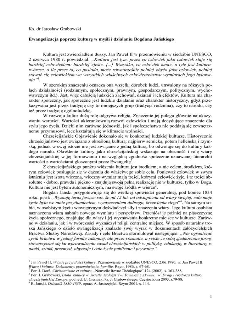 1 Ks. dr Jarosław Grabowski Ewangelizacja poprzez kulturę w myśli