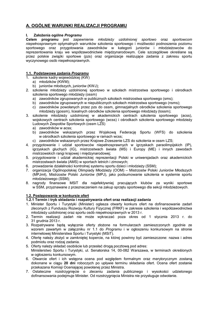 A. OGÓLNE WARUNKI REALIZACJI PROGRAMU I. Założenia ogólne Programu Celem programu jest zapewnienie młodzieży uzdolnionej sportowo oraz sportowcom niepełnosprawnym optymalnych warunków szkolenia sportowego i możliwości podnoszenia poziomu sportowego oraz przygotowania zawodników w kategorii juniorów i młodzieżowców do reprezentowania kraju we współzawodnictwie międzynarodowym. Cele szczegółowe określane są przez polskie związki sportowe (pzs) oraz organizacje realizujące zadania z zakresu sportu wyczynowego osób niepełnosprawnych. 1.1. Podstawowe zadania Programu 1. szkolenie kadry wojewódzkiej (KW) a) młodzików (KWM); b) juniorów młodszych, juniorów (KWJ); 2. szkolenie młodzieży uzdolnionej sportowo w szkołach mistrzostwa sportowego i ośrodkach szkolenia sportowego młodzieży (ossm) a) zawodników zgrupowanych w publicznych szkołach mistrzostwa sportowego (sms); b) zawodników zgrupowanych w niepublicznych szkołach mistrzostwa sportowego (nsms); c) zawodników powołanych przez pzs do ossm, gimnazjalnych ośrodków szkolenia sportowego młodzieży (gossm), licealnych ośrodków szkolenia sportowego młodzieży (lossm); 3. szkolenie młodzieży uzdolnionej w akademickich centrach szkolenia sportowego (acss), wojskowych centrach szkolenia sportowego (wcss) i ośrodkach szkolenia sportowego młodzieży Ludowych Zespołów Sportowych (ossm LZS) a) zawodników w acss; b) zawodników wskazanych przez Wojskową Federację Sportu (WFS) do szkolenia w ośrodkach szkolenia sportowego w ramach wcss; c) zawodników wskazanych przez Krajowe Zrzeszenie LZS do szkolenia w ossm LZS; 4. przygotowanie i udział sportowców niepełnosprawnych w igrzyskach paraolimpijskich (IP), igrzyskach głuchych (IG), mistrzostwach świata (MS) i Europy (ME) i innych zawodach mistrzowskich rangi krajowej i międzynarodowej; 5. przygotowanie i udział akademickiej reprezentacji Polski w uniwersjadach oraz akademickich mistrzostwach świata (AMS) w sportach letnich i zimowych; 6. prowadzenie działalności kontrolnej systemu sportu dzieci i młodzieży (SSM); 7. organizacja Ogólnopolskiej Olimpiady Młodzieży (OOM) – Mistrzostw Polski Juniorów Młodszych (MPJmł), Mistrzostw Polski Juniorów (MPJ), jako podsumowanie szkolenia w systemie sportu młodzieżowego (SSM); 8. nagrody finansowe MSiT dla najefektywniej pracujących klubów za wyniki sportowe w SSM, przyznawane z przeznaczeniem na zakup sprzętu sportowego dla sekcji młodzieżowych. 1.2. Postępowanie w konkursie ofert 1.2.1 Termin i tryb składania i rozpatrywania ofert oraz realizacji zadania 1. Minister Sportu i Turystyki (Minister) ogłasza otwarty konkurs ofert na dofinansowanie zadań zleconych z Funduszu Rozwoju Kultury Fizycznej (FRKF) w zakresie szkolenia i współzawodnictwa młodzieży uzdolnionej oraz sportu osób niepełnosprawnych w 2013 r. 2. Termin realizacji zadań nie może wykraczać poza okres od 1 stycznia 2013 r. do 31 grudnia 2013 r. 3. Rozpatrywane będą wyłącznie oferty złożone na formularzach zamieszczonych zgodnie ze wzorem zawartym w załączniku nr 1.1 do Programu i w ogłoszeniu konkursowym na stronie internetowej Ministerstwa Sportu i Turystyki (MSiT). 4. Ofertę należy złożyć w zamkniętej kopercie, na której powinny być zamieszczone: nazwa i adres podmiotu oraz rodzaj zadania. 5. Oferty należy składać osobiście lub przesłać drogą pocztową pod adres: Ministerstwo Sportu i Turystyki, ul. Senatorska 14, 00-082 Warszawa, w terminach określonych w ogłoszeniu konkursowym. 6. Otwarcie ofert i ich wstępna ocena pod względem formalnym oraz merytorycznym zostaną dokonane w ciągu 20 dni roboczych po upływie terminu składania ofert. Ocena ofert zostanie przekazana Komisji Oceniającej powołanej przez Ministra. 7. Ostateczne rozstrzygnięcie o zleceniu zadania publicznego i wysokości udzielonego dofinansowania podejmuje Minister. Od rozstrzygnięcia Ministra nie przysługuje odwołanie. 8. Całościowe lub częściowe wyniki konkursu zostaną zamieszczone na tablicy ogłoszeń, w Biuletynie Informacji Publicznej MSiT www.bip.msit.gov.pl oraz na stronie internetowej MSiT www.msport.gov.pl. 9. Zlecenie realizacji zadania publicznego nastąpi w formie jego wspierania wraz z udzieleniem dotacji na dofinansowanie na podstawie ustawy o działalności pożytku publicznego o wolontariacie z dnia 24 kwietnia 2003 r. (Dz. U. 2010 Nr 234, poz. 1536, z późn. zm.), art. 47 i art. 151 ustawy z dnia 27 sierpnia 2009 r. o finansach publicznych (Dz. U. Nr 157, poz. 1240 z późn. zm.); rozporządzenia Ministra Sportu i Turystyki z dnia 23 sierpnia 2010 r. w sprawie dofinansowania zadań ze środków Funduszu Rozwoju Kultury Fizycznej (Dz.U. Nr 156, poz. 1051). 10. W części szczegółowej Programu określono Oferentów uprawnionych do realizacji zadania. 1.2.2 Kryteria stosowane przy rozpatrywaniu ofert: 1. Spełnienie wymogów formalnych - Oferent winien przedłożyć kompletny i prawidłowo wypełniony formularz oferty (wraz ze wszystkimi wymaganymi załącznikami), podpisany przez osoby upoważnione do składania oświadczeń woli, w terminie określonym w ogłoszeniu. 2. Zgodność zakresu merytorycznego projektu z obszarami zadań i priorytetami określonymi w konkursie oraz znaczenie projektu dla realizacji zadań państwowych z tego obszaru. 3. Zasięg działania oferentów oraz stan zasobów kadrowych i rzeczowych, wskazujących na możliwość realizacji zadania. 4. Cele statutowe Oferenta ukierunkowane na realizację zadań z zakresu szkolenia młodzieży uzdolnionej sportowo. 5. Doświadczenie Oferenta w realizacji zadań publicznych podobnego rodzaju (ocena oparta będzie na danych zawartych w ofercie, jak i na dotychczasowej współpracy w realizacji podobnych zadań). 6. Zakres wykorzystania w realizacji zadania potencjału wolontariuszy. 7. Udział w finansowaniu zadania środków własnych, środków jednostek samorządu terytorialnego, funduszy UE oraz innych źródeł.
