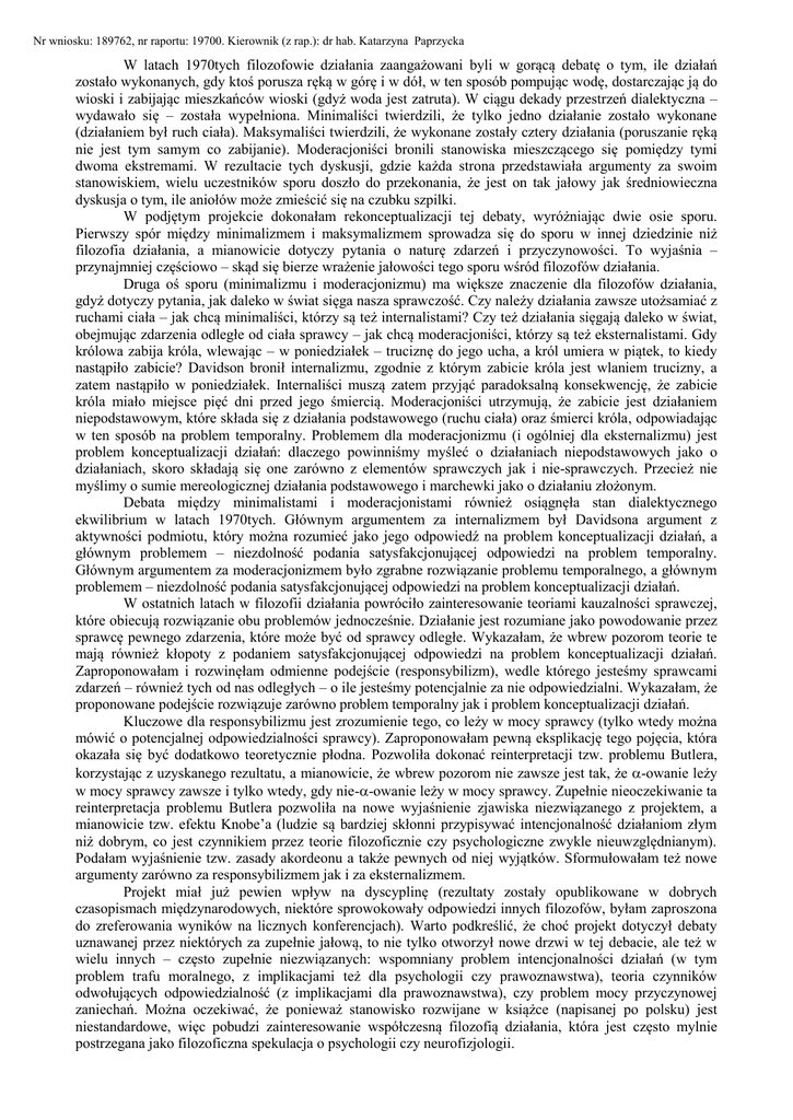 Nr wniosku: 189762, nr raportu: 19700. Kierownik (z rap.): dr hab. Katarzyna Paprzycka W latach 1970tych filozofowie działania zaangażowani byli w gorącą debatę o tym, ile działań zostało wykonanych, gdy ktoś porusza ręką w górę i w dół, w ten sposób pompując wodę, dostarczając ją do wioski i zabijając mieszkańców wioski (gdyż woda jest zatruta). W ciągu dekady przestrzeń dialektyczna – wydawało się – została wypełniona. Minimaliści twierdzili, że tylko jedno działanie zostało wykonane (działaniem był ruch ciała). Maksymaliści twierdzili, że wykonane zostały cztery działania (poruszanie ręką nie jest tym samym co zabijanie). Moderacjoniści bronili stanowiska mieszczącego się pomiędzy tymi dwoma ekstremami. W rezultacie tych dyskusji, gdzie każda strona przedstawiała argumenty za swoim stanowiskiem, wielu uczestników sporu doszło do przekonania, że jest on tak jałowy jak średniowieczna dyskusja o tym, ile aniołów może zmieścić się na czubku szpilki. W podjętym projekcie dokonałam rekonceptualizacji tej debaty, wyróżniając dwie osie sporu. Pierwszy spór między minimalizmem i maksymalizmem sprowadza się do sporu w innej dziedzinie niż filozofia działania, a mianowicie dotyczy pytania o naturę zdarzeń i przyczynowości. To wyjaśnia – przynajmniej częściowo – skąd się bierze wrażenie jałowości tego sporu wśród filozofów działania. Druga oś sporu (minimalizmu i moderacjonizmu) ma większe znaczenie dla filozofów działania, gdyż dotyczy pytania, jak daleko w świat sięga nasza sprawczość. Czy należy działania zawsze utożsamiać z ruchami ciała – jak chcą minimaliści, którzy są też internalistami? Czy też działania sięgają daleko w świat, obejmując zdarzenia odległe od ciała sprawcy – jak chcą moderacjoniści, którzy są też eksternalistami. Gdy królowa zabija króla, wlewając – w poniedziałek – truciznę do jego ucha, a król umiera w piątek, to kiedy nastąpiło zabicie? Davidson bronił internalizmu, zgodnie z którym zabicie króla jest wlaniem trucizny, a zatem nastąpiło w poniedziałek. Internaliści muszą zatem przyjąć paradoksalną konsekwencję, że zabicie króla miało miejsce pięć dni przed jego śmiercią. Moderacjoniści utrzymują, że zabicie jest działaniem niepodstawowym, które składa się z działania podstawowego (ruchu ciała) oraz śmierci króla, odpowiadając w ten sposób na problem temporalny. Problemem dla moderacjonizmu (i ogólniej dla eksternalizmu) jest problem konceptualizacji działań: dlaczego powinniśmy myśleć o działaniach niepodstawowych jako o działaniach, skoro składają się one zarówno z elementów sprawczych jak i nie-sprawczych. Przecież nie myślimy o sumie mereologicznej działania podstawowego i marchewki jako o działaniu złożonym. Debata między minimalistami i moderacjonistami również osiągnęła stan dialektycznego ekwilibrium w latach 1970tych. Głównym argumentem za internalizmem był Davidsona argument z aktywności podmiotu, który można rozumieć jako jego odpowiedź na problem konceptualizacji działań, a głównym problemem – niezdolność podania satysfakcjonującej odpowiedzi na problem temporalny. Głównym argumentem za moderacjonizmem było zgrabne rozwiązanie problemu temporalnego, a głównym problemem – niezdolność podania satysfakcjonującej odpowiedzi na problem konceptualizacji działań. W ostatnich latach w filozofii działania powróciło zainteresowanie teoriami kauzalności sprawczej, które obiecują rozwiązanie obu problemów jednocześnie. Działanie jest rozumiane jako powodowanie przez sprawcę pewnego zdarzenia, które może być od sprawcy odległe. Wykazałam, że wbrew pozorom teorie te mają również kłopoty z podaniem satysfakcjonującej odpowiedzi na problem konceptualizacji działań. Zaproponowałam i rozwinęłam odmienne podejście (responsybilizm), wedle którego jesteśmy sprawcami zdarzeń – również tych od nas odległych – o ile jesteśmy potencjalnie za nie odpowiedzialni. Wykazałam, że proponowane podejście rozwiązuje zarówno problem temporalny jak i problem konceptualizacji działań. Kluczowe dla responsybilizmu jest zrozumienie tego, co leży w mocy sprawcy (tylko wtedy można mówić o potencjalnej odpowiedzialności sprawcy). Zaproponowałam pewną eksplikację tego pojęcia, która okazała się być dodatkowo teoretycznie płodna. Pozwoliła dokonać reinterpretacji tzw. problemu Butlera, korzystając z uzyskanego rezultatu, a mianowicie, że wbrew pozorom nie zawsze jest tak, że -owanie leży w mocy sprawcy zawsze i tylko wtedy, gdy nie--owanie leży w mocy sprawcy. Zupełnie nieoczekiwanie ta reinterpretacja problemu Butlera pozwoliła na nowe wyjaśnienie zjawiska niezwiązanego z projektem, a mianowicie tzw. efektu Knobe’a (ludzie są bardziej skłonni przypisywać intencjonalność działaniom złym niż dobrym, co jest czynnikiem przez teorie filozoficznie czy psychologiczne zwykle nieuwzględnianym). Podałam wyjaśnienie tzw. zasady akordeonu a także pewnych od niej wyjątków. Sformułowałam też nowe argumenty zarówno za responsybilizmem jak i za eksternalizmem. Projekt miał już pewien wpływ na dyscyplinę (rezultaty zostały opublikowane w dobrych czasopismach międzynarodowych, niektóre sprowokowały odpowiedzi innych filozofów, byłam zaproszona do zreferowania wyników na licznych konferencjach). Warto podkreślić, że choć projekt dotyczył debaty uznawanej przez niektórych za zupełnie jałową, to nie tylko otworzył nowe drzwi w tej debacie, ale też w wielu innych – często zupełnie niezwiązanych: wspomniany problem intencjonalności działań (w tym problem trafu moralnego, z implikacjami też dla psychologii czy prawoznawstwa), teoria czynników odwołujących odpowiedzialność (z implikacjami dla prawoznawstwa), czy problem mocy przyczynowej zaniechań. Można oczekiwać, że pon