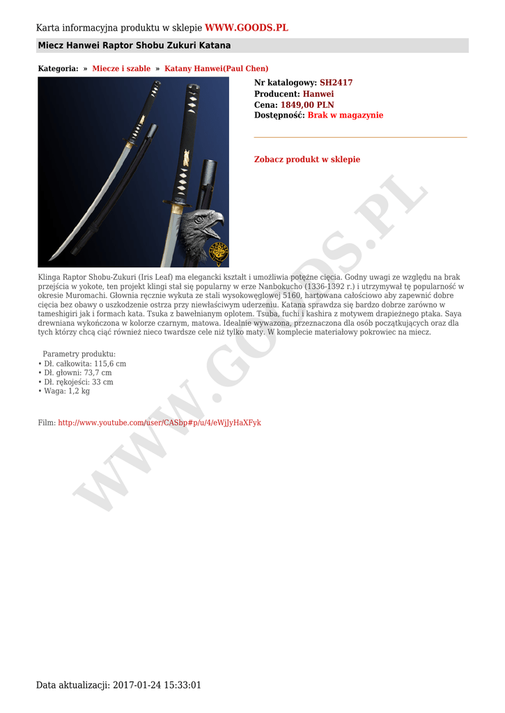 Karta informacyjna produktu w sklepie WWW.GOODS.PL Miecz Hanwei Raptor Shobu Zukuri Katana Kategoria: » Miecze i szable » Katany Hanwei(Paul Chen) Nr katalogowy: SH2417 Producent: Hanwei Cena: 1849,00 PLN Dostępność: Brak w magazynie S. PL Zobacz produkt w sklepie W .G Parametry produktu: • Dł. całkowita: 115,6 cm • Dł. głowni: 73,7 cm • Dł. rękojeści: 33 cm • Waga: 1,2 kg O O D Klinga Raptor Shobu-Zukuri (Iris Leaf) ma elegancki kształt i umożliwia potężne cięcia. Godny uwagi ze względu na brak przejścia w yokote, ten projekt klingi stał się popularny w erze Nanbokucho (1336-1392 r.) i utrzymywał tę popularność w okresie Muromachi. Głownia ręcznie wykuta ze stali wysokowęglowej 5160, hartowana całościowo aby zapewnić dobre cięcia bez obawy o uszkodzenie ostrza przy niewłaściwym uderzeniu. Katana sprawdza się bardzo dobrze zarówno w tameshigiri jak i formach kata. Tsuka z bawełnianym oplotem. Tsuba, fuchi i kashira z motywem drapieżnego ptaka. Saya drewniana wykończona w kolorze czarnym, matowa. Idealnie wywazona, przeznaczona dla osób początkujących oraz dla tych którzy chcą ciąć również nieco twardsze cele niż tylko maty. W komplecie materiałowy pokrowiec na miecz. W W Film: http://www.youtube.com/user/CASbp#p/u/4/eWjJyHaXFyk Data aktualizacji: 2017-01-24 15:33:01