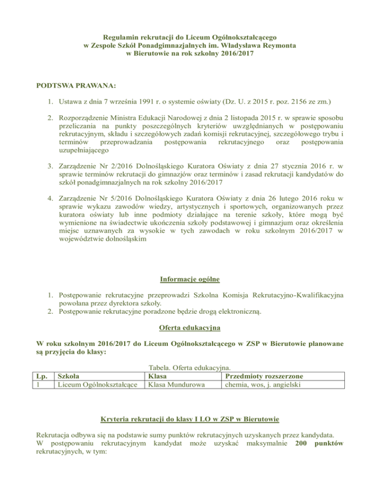 Regulamin rekrutacji do Liceum Ogólnokształcącego w Zespole Szkół Ponadgimnazjalnych im. Władysława Reymonta w Bierutowie na rok szkolny 2016/2017 PODTSWA PRAWANA: 1. Ustawa z dnia 7 września 1991 r. o systemie oświaty (Dz. U. z 2015 r. poz. 2156 ze zm.) 2. Rozporządzenie Ministra Edukacji Narodowej z dnia 2 listopada 2015 r. w sprawie sposobu przeliczania na punkty poszczególnych kryteriów uwzględnianych w postępowaniu rekrutacyjnym, składu i szczegółowych zadań komisji rekrutacyjnej, szczegółowego trybu i terminów przeprowadzania postępowania rekrutacyjnego oraz postępowania uzupełniającego 3. Zarządzenie Nr 2/2016 Dolnośląskiego Kuratora Oświaty z dnia 27 stycznia 2016 r. w sprawie terminów rekrutacji do gimnazjów oraz terminów i zasad rekrutacji kandydatów do szkół ponadgimnazjalnych na rok szkolny 2016/2017 4. Zarządzenie Nr 5/2016 Dolnośląskiego Kuratora Oświaty z dnia 26 lutego 2016 roku w sprawie wykazu zawodów wiedzy, artystycznych i sportowych, organizowanych przez kuratora oświaty lub inne podmioty działające na terenie szkoły, które mogą być wymienione na świadectwie ukończenia szkoły podstawowej i gimnazjum oraz określenia miejsc uznawanych za wysokie w tych zawodach w roku szkolnym 2016/2017 w województwie dolnośląskim Informacje ogólne 1. Postępowanie rekrutacyjne przeprowadzi Szkolna Komisja Rekrutacyjno-Kwalifikacyjna powołana przez dyrektora szkoły. 2. Postępowanie rekrutacyjne poradzone będzie drogą elektroniczną. Oferta edukacyjna W roku szkolnym 2016/2017 do Liceum Ogólnokształcącego w ZSP w Bierutowie planowane są przyjęcia do klasy: Lp. 1 Szkoła Liceum Ogólnokształcące Tabela. Oferta edukacyjna. Klasa Przedmioty rozszerzone Klasa Mundurowa chemia, wos, j. angielski Kryteria rekrutacji do klasy I LO w ZSP w Bierutowie Rekrutacja odbywa się na podstawie sumy punktów rekrutacyjnych uzyskanych przez kandydata. W postępowaniu rekrutacyjnym kandydat może uzyskać maksymalnie 200 punktów rekrutacyjnych, w tym: - 80 punktów za oceny wymienione na świadectwie ukończenia gimnazjum 100 punktów za wyniki egzaminu gimnazjalnego. 20 punktów za osiągnięcia wymienione na świadectwie ukończenia gimnazjum Punkty za oceny na świadectwie Zasady naliczania punktów rekrutacyjnych za oceny wymienione na świadectwie ukończenia gimnazjum Szkoła Lp. Tabela. Punkty za oceny Przedmioty i maksymalna liczba punktów Liceum Ogólnokształcące – Klasa Mundurowa j. polski - 20 punktów j. obcy - 20 punktów matematyka - 20 punktów chemia - 20 punktów Maksymalnie 80 punktów 1 Przeliczenie ocen na świadectwie na punkty rekrutacyjne jest następujące: - Ocena celująca - 20 punktów, Ocena bardzo dobra - 16punktów, Ocena dobra - 12punktów, Ocena dostateczna - 8 punktów, Ocena dopuszczająca - 2 punkty Punkty za wyniki egzaminu gimnazjalnego Liczba punktów rekrutacyjnych uzyskanych za wynik egzaminu gimnazjalnego jest proporcjonalna do wyniku tego egzaminu wyrażonego w procentach. Liczba ta jest równa maksymalnie 20, zgodnie z poniższą tabelą Tabela. Maksymalna ilość punktów za wyniki egzaminu gimnazjalnego Egzamin gimnazjalny Wynik egzaminu gimnazjalnego w % Punkty rekrutacyjne Język polski Historia i wiedza o społeczeństwie Matematyka Przedmioty przyrodnicze (biologia, chemia, fizyka, geografia) Język obcy na poziomie podstawowym (do roku szkolnego 2017/2018) 100% 100% 20 pkt. 20 pkt. 100% 100% 20 pkt. 20 pkt. 100% 20 pkt. Maksymalnie 100% Punkty za osiągnięcia wymienione na świadectwie ukończenia gimnazjum Zasady naliczania punktów rekrutacyjnych za osiągnięcia wymienione na świadectwie ukończenia gimnazjum podane są w poniższej tabeli. Tabela. Punkty za osiągnięcia Kryterium Punkty rekrutacyjne Osiągnięcia w zakresie aktywności społecznej, w tym na rzecz środowiska szkolnego, w szczególności w formie wolontariatu Świadectwo ukończenia gimnazjum z wyróżnieniem Osiągnięcia w olimpiadach i konkursach 2 pkt. 5 pkt. do 13 pkt. Maksymalnie 20 pkt Punkty za olimpiady, konkursy i zawody Kandydat otrzymuje punkty rekrutacyjne za osiągnięcia wymienione na świadectwie ukończenia gimnazjum. 1) Za uzyskanie w zawodach wiedzy będących konkursem o zasięgu ponadwojewódzkim organizowanym przez kuratorów oświaty na podstawie zawartych porozumień: a. tytułu finalisty konkursu przedmiotowego –przyznaje się 10 punktów, b. tytułu laureata konkursu tematycznego lub interdyscyplinarnego –przyznaje się 7 punktów, c. tytułu finalisty konkursu tematycznego lub interdyscyplinarnego –przyznaje się 5 punktów. 2) Za uzyskanie w zawodach wiedzy będących konkursem o zasięgu międzynarodowym lub ogólnopolskim albo turniejem o zasięgu ogólnopolskim, przeprowadzanymi zgodnie z przepisami wydanymi na podstawie art. 32a ust. 4 i art. 22 ust. 2 pkt 8 ustawy: a. tytułu finalisty konkursu z przedmiotu lub przedmiotów artystycznych objętych ramowym planem nauczania szkoły artystycznej -przyznaje się 10 punktów, b. tytułu laureata turnieju z przedmiotu lub przedmiotów artystycznych nieobjętych ramowym planem nauczania szkoły artystycznej -przyznaje się 4 punkty, c. tytułu finalisty turnieju z przedmiotu lub przedmiotów artystycznych nieobjętych ramowym planem nauczania szkoły artystycznej -przyznaje się 3 punkty; 3) Za uzyskanie w zawodach wiedzy będących konkursem o zasięgu wojewódzkim organizowanym przez kuratora oświaty: a. dwóch lub więcej tytułów finalisty konkursu przedmiotowego –przyznaje się 10 punktów, b. dwóch lub więcej tytułów laureata konkursu tematycznego lub interdyscyplinarnego – przyznaje się 7 punktów, c. dwóch lub więcej tytułów finalisty konkursu tematycznego lub interdyscyplinarnego – przyznaje się 5 punktów, d. tytułu finalisty konkursu przedmiotowego –przyznaje się 7 punktów, e. tytułu laureata konkursu tematycznego lub interdyscyplinarnego –przyznaje się 5 punktów, f. tytułu finalisty konkurs