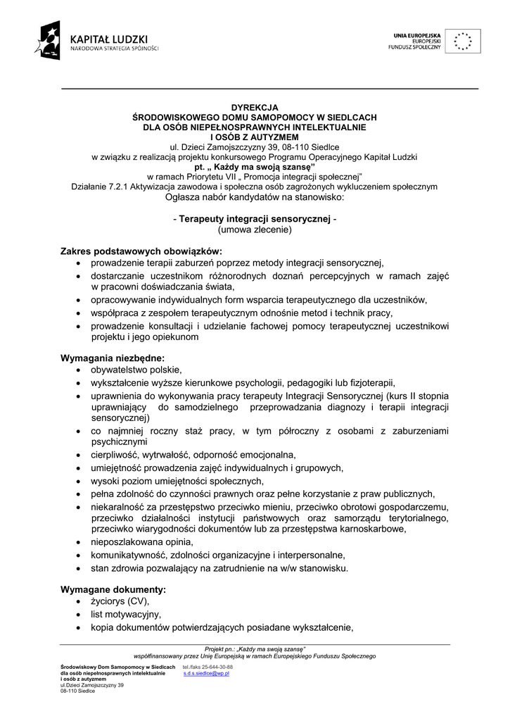DYREKCJA ŚRODOWISKOWEGO DOMU SAMOPOMOCY W SIEDLCACH DLA OSÓB NIEPEŁNOSPRAWNYCH INTELEKTUALNIE I OSÓB Z AUTYZMEM ul. Dzieci Zamojszczyzny 39, 08-110 Siedlce w związku z realizacją projektu konkursowego Programu Operacyjnego Kapitał Ludzki pt. „ Każdy ma swoją szansę” w ramach Priorytetu VII „ Promocja integracji społecznej” Działanie 7.2.1 Aktywizacja zawodowa i społeczna osób zagrożonych wykluczeniem społecznym Ogłasza nabór kandydatów na stanowisko: - Terapeuty integracji sensorycznej (umowa zlecenie) Zakres podstawowych obowiązków: prowadzenie terapii zaburzeń poprzez metody integracji sensorycznej, dostarczanie uczestnikom różnorodnych doznań percepcyjnych w ramach zajęć w pracowni doświadczania świata, opracowywanie indywidualnych form wsparcia terapeutycznego dla uczestników, współpraca z zespołem terapeutycznym odnośnie metod i technik pracy, prowadzenie konsultacji i udzielanie fachowej pomocy terapeutycznej uczestnikowi projektu i jego opiekunom Wymagania niezbędne: obywatelstwo polskie, wykształcenie wyższe kierunkowe psychologii, pedagogiki lub fizjoterapii, uprawnienia do wykonywania pracy terapeuty Integracji Sensorycznej (kurs II stopnia uprawniający do samodzielnego przeprowadzania diagnozy i terapii integracji sensorycznej) co najmniej roczny staż pracy, w tym półroczny z osobami z zaburzeniami psychicznymi cierpliwość, wytrwałość, odporność emocjonalna, umiejętność prowadzenia zajęć indywidualnych i grupowych, wysoki poziom umiejętności społecznych, pełna zdolność do czynności prawnych oraz pełne korzystanie z praw publicznych, niekaralność za przestępstwo przeciwko mieniu, przeciwko obrotowi gospodarczemu, przeciwko działalności instytucji państwowych oraz samorządu terytorialnego, przeciwko wiarygodności dokumentów lub za przestępstwa karnoskarbowe, nieposzlakowana opinia, komunikatywność, zdolności organizacyjne i interpersonalne, stan zdrowia pozwalający na zatrudnienie na w/w stanowisku. Wymagane dokumenty: życiorys (CV), list motywacyjny, kopia dokumentów potwierdzających posiadane wykształcenie, Projekt pn.: „Każdy ma swoją szansę” współfinansowany przez Unię Europejską w ramach Europejskiego Fundus zu Społec znego Środowiskowy Dom Samopomocy w Siedlcach dla osób niepełnosprawnych intelektualnie i osób z autyzmem ul.Dzieci Zamojszczyzny 39 08-110 Siedlce tel./faks 25-644-30-88 [email protected] kopia dokumentów potwierdzających doświadczenie zawodowe (świadectwa pracy), kopia dokumentów potwierdzających dodatkowe kwalifikacje (kursy, certyfikaty), kopia dowodu osobistego, oświadczenie kandydata o niekaralności za przestępstwa popełnione umyślnie, oświadczenie kandydata o korzystaniu z pełni praw publicznych, oświadczenie kandydata o stanie zdrowia pozwalającym na prace na wskazanym stanowisku (w przypadku zatrudnienia kandydat zostanie skierowany na badania lekarskie wstępne do wskazanego lekarza medycyny pracy). Wymagane dokumenty aplikacyjne (list motywacyjny i CV ) powinny być opatrzone klauzulą „Wyrażam zgodę na przetwarzanie danych osobowych zawartych w ofercie pracy dla potrzeb niezbędnych do realizacji procesu rekrutacji zgodnie z Ustawą z dnia 29.08.1997 o ochronie danych osobowych (Dz. U. z 2002 r. Nr 101, poz. 926 z późn. zm.)” i własnoręcznie podpisane. Osoby zainteresowane prosimy o złożenie w Biurze Projektu Środowiskowego Domu Samopomocy w Siedlcach dla osób niepełnosprawnych intelektualnie i osób z autyzmem ul. Dzieci Zamojszczyzny 39/5, 08-110 Siedlce, kompletu dokumentów w zamkniętej kopercie do dnia 10.02.2012r. do godziny 15.00 z dopiskiem: Nabór na stanowisko Terapeuta integracji sensorycznej (w przypadku przesłania pocztą decyduje data wpływu dokumentów). Po dokonaniu oceny formalnej oferty, na indywidualne rozmowy zaproszeni zostaną kandydaci, którzy spełniają wymogi formalne na ww. Stanowisko i zostną poinformowani telefonicznie o terminie rozmowy kwalifikacyjnej. Oferty osób niezakwalifikownych zostaną komisyjnie zniszczone. Dyrektor /-/ Magdalena Grudzień - Soszyńska Projekt pn.: „Każdy ma swoją szansę” współfinansowany przez Unię Europejską w ramach Europejskiego Fundus zu Społec znego Środowiskowy Dom Samopomocy w Siedlcach dla osób niepełnosprawnych intelektualnie i osób z autyzmem ul.Dzieci Zamojszczyzny 39 08-110 Siedlce tel./faks 25-644-30-88 [email protected]