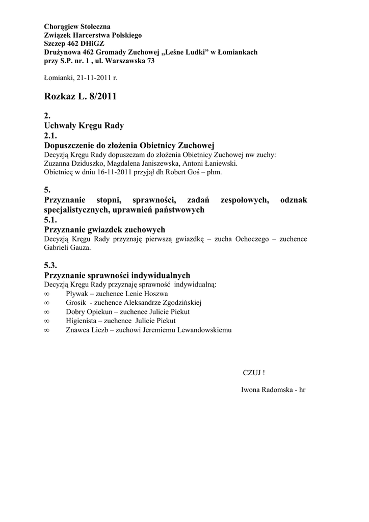 Chorągiew Stołeczna Związek Harcerstwa Polskiego Szczep 462 DHiGZ Drużynowa 462 Gromady Zuchowej „Leśne Ludki” w Łomiankach przy S.P. nr. 1 , ul. Warszawska 73 Łomianki, 21-11-2011 r. Rozkaz L. 8/2011 2. Uchwały Kręgu Rady 2.1. Dopuszczenie do złożenia Obietnicy Zuchowej Decyzją Kręgu Rady dopuszczam do złożenia Obietnicy Zuchowej nw zuchy: Zuzanna Dziduszko, Magdalena Janiszewska, Antoni Łaniewski. Obietnicę w dniu 16-11-2011 przyjął dh Robert Goś – phm. 5. Przyznanie stopni, sprawności, zadań specjalistycznych, uprawnień państwowych 5.1. Przyznanie gwiazdek zuchowych zespołowych, odznak Decyzją Kręgu Rady przyznaję pierwszą gwiazdkę – zucha Ochoczego – zuchence Gabrieli Gauza. 5.3. Przyznanie sprawności indywidualnych Decyzją Kręgu Rady przyznaję sprawność indywidualną: • Pływak – zuchence Lenie Hoszwa • Grosik - zuchence Aleksandrze Zgodzińskiej • Dobry Opiekun – zuchence Julicie Piekut • Higienista – zuchence Julicie Piekut • Znawca Liczb – zuchowi Jeremiemu Lewandowskiemu CZUJ ! Iwona Radomska - hr