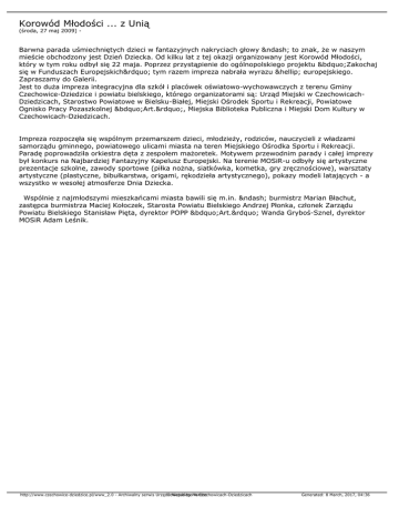 Korowód Młodości ... z Unią (środa, 27 maj 2009) - Barwna parada uśmiechniętych dzieci w fantazyjnych nakryciach głowy – to znak, że w naszym mieście obchodzony jest Dzień Dziecka. Od kilku lat z tej okazji organizowany jest Korowód Młodości, który w tym roku odbył się 22 maja. Poprzez przystąpienie do ogólnopolskiego projektu „Zakochaj się w Funduszach Europejskich” tym razem impreza nabrała wyrazu … europejskiego. Zapraszamy do Galerii. Jest to duża impreza integracyjna dla szkół i placówek oświatowo-wychowawczych z terenu Gminy Czechowice-Dziedzice i powiatu bielskiego, którego organizatorami są: Urząd Miejski w CzechowicachDziedzicach, Starostwo Powiatowe w Bielsku-Białej, Miejski Ośrodek Sportu i Rekreacji, Powiatowe Ognisko Pracy Pozaszkolnej „Art.”, Miejska Biblioteka Publiczna i Miejski Dom Kultury w Czechowicach-Dziedzicach. Impreza rozpoczęła się wspólnym przemarszem dzieci, młodzieży, rodziców, nauczycieli z władzami samorządu gminnego, powiatowego ulicami miasta na teren Miejskiego Ośrodka Sportu i Rekreacji. Paradę poprowadziła orkiestra dęta z zespołem mażoretek. Motywem przewodnim parady i całej imprezy był konkurs na Najbardziej Fantazyjny Kapelusz Europejski. Na terenie MOSiR-u odbyły się artystyczne prezentacje szkolne, zawody sportowe (piłka nożna, siatkówka, kometka, gry zręcznościowe), warsztaty artystyczne (plastyczne, bibułkarstwa, origami, rękodzieła artystycznego), pokazy modeli latających - a wszystko w wesołej atmosferze Dnia Dziecka. Wspólnie z najmłodszymi mieszkańcami miasta bawili się m.in. – burmistrz Marian Błachut, zastępca burmistrza Maciej Kołoczek, Starosta Powiatu Bielskiego Andrzej Płonka, członek Zarządu Powiatu Bielskiego Stanisław Pięta, dyrektor POPP „Art.” Wanda Gryboś-Sznel, dyrektor MOSiR Adam Leśnik. http://www.czechowice-dziedzice.pl/www_2.0 - Archiwalny serwis Urzędu Powered Miejskiego by Mambo w Czechowicach-Dziedzicach Generated: 8 March, 2017, 04:36