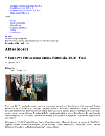 Przejdź do menu głównego ALT + 0 Przejdź do treści ALT + 1 Przejdź do wyszukiwarki ALT + W Mapa strony ALT + 2 Close Urząd Sport i turystyka Gospodarka Kultura i edukacja Gmina Aktualności do góry Strona Gminy Konopiska http://www.konopiska.pl/urzad/aktualnosci/idn:1347/printpdf Drukuj grafikę : tak / nie Aktualności V Szachowe Mistrzostwa Gminy Konopiska 2016 – Finał 12 stycznia 2017 kategoria: Sport i Turystyka 8 stycznia 2017r. nastąpiło rozstrzygnięcie i rozdanie nagród w V Szachowych Mistrzostwach Gminy Konopiska. W 2016 roku w Gminnym Centrum Kultury i Rekreacji zawodnicy rozegrali jedenaście turniejów szachowych, których głównym celem było wyłonienie mistrza gminy w kategoriach wiekowych: senior, junior i junior młodszy. Rywalizacja była równie zacięta jak w poprzednich latach. Po zakończeniu całorocznego cyklu zawodów, podliczono punkty z wszystkich rozgrywek i wyłoniono najlepszych zawodników. W kategorii „SENIOR” tytuł Mistrza Gminy Konopiska zdobył Sławomir Żukow, w kategorii „JUNIOR” Cyprian Danecki, natomiast w kategorii „Junior Młodszy” - Miłosz Kiedrzyński. „Najlepszą Kobietą” została Katarzyna Chmielarz, a „Najlepszą Juniorką” - Joanna Skalik. Końcowa klasyfikacja punktowa przedstawia się następująco: Kategoria „SENIOR”: 1. 2. 3. 4. 5. 6. 7. 8. Sławomir Żukow 299 pkt Mateusz Duda 281 pkt Jerzy Zasada 280 pkt Mirosław Gliński 267 pkt Stanisław Żugaj 257 pkt Józef Wawrzyńczak 226 pkt Grzegorz Morawiak 221 pkt Dariusz Sączek 107 pkt Kategoria „JUNIOR”: 1. Cyprian Danecki 218 pkt 2. Tomasz Marczak 204 pkt 3. Jacek Ankowski 175 pkt Kategoria „JUNIOR MŁODSZY”: 1. 2. 3. 4. 5. Miłosz Kiedrzyński 180 pkt Oskar Chmielarz 161 pkt Hubert Popiel 150 pkt Jakub Wałek 93 pkt Adrian Wróż 46 pkt „Najlepsza Kobieta” - Katarzyna Chmielarz 198 pkt „Najlepsza Juniorka” - Joanna Skalik 107 pkt Zawodnicy z największą ilością zdobytych punktów otrzymali pamiątkowe dyplomy, puchary i upominki wręczone przez Zastępcę Wójta Gminy Panią Zofię Kuśmierską i Dyrektor Gminnego Centrum Kultury i Rekreacji Panią Iwonę Lisek. Po rozdaniu nagród przystąpiono do pierwszego turnieju rozpoczynającego cykl Mistrzostw Szachowych Gminy Konopiska na 2017 rok. Zapraszamy wszystkich chętnych szachistów z terenu naszej gminy do udziału w tegorocznych spotkaniach, które będą się odbywały w następujących terminach: 5 lutego, 26 lutego, 19 marca, 9 kwietnia, 7 maja, 28 maja, 11 czerwca, 2 lipiec, 3 września, 24 września, 15 października, 5 listopada, 19 listopada, 10 grudnia. M. Łyszczarz/GCKiR 12 sty 2017 V Szachowe Mistrzostwa Gminy Konopiska 2016 – Finał V V V V V Szachowe Szachowe Szachowe Szachowe Szachowe Mistrzostwa Mistrzostwa Mistrzostwa Mistrzostwa Mistrzostwa Gminy Gminy Gminy Gminy Gminy Konopiska Konopiska Konopiska Konopiska Konopiska 2016 2016 2016 2016 2016 – – – – – Finał Finał Finał Finał Finał V V V V V V V Szachowe Szachowe Szachowe Szachowe Szachowe Szachowe Szachowe Mistrzostwa Mistrzostwa Mistrzostwa Mistrzostwa Mistrzostwa Mistrzostwa Mistrzostwa powrót do listy aktualności Gminy Gminy Gminy Gminy Gminy Gminy Gminy Konopiska Konopiska Konopiska Konopiska Konopiska Konopiska Konopiska 2016 2016 2016 2016 2016 2016 2016 – – – – – – – Finał Finał Finał Finał Finał Finał Finał