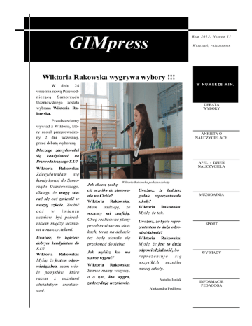 NAZWA FIRMY GIMpress R OK 2015, N UME R 11 W RZ ES I E Ń , PA Ź D ZI E R NI K Wiktoria Rakowska wygrywa wybory !!! W N U M E R Z E MI N . W dniu 24 września nową Przewodniczącą Samorząd u Uczniowskiego została wybrana Wiktoria Rakowska. DEBATA WYBORY Przedstawiamy wywiad z Wiktorią, który został przeprowadzony 2 dni wcześniej, przed debatą wyborczą. ANKIETA O NAUCZYCIELACH Dlaczego zdecydowałaś się kandydować na Przewodniczącego S.U? Wiktoria APEL - DZIEŃ NAUCZYCIELA Rakowska: Zdecydowałam się kandydować do Samorządu Uczniowskiego, dlatego że mogę starać się coś zmienić w naszej szkole. Zrobić coś w imieniu uczniów, być pośrednikiem między uczniami a nauczycielami. Uważasz, że będziesz dobrym kandydatem do S.U? Wiktoria Rakowska: Myślę, że jestem odpowiedzialna, mam wiele pomysłów, które razem z uczniami chciałabym zrealizować. Wiktoria Rakowska podczas debaty Jak chcesz zachęcić uczniów do głosowania na Ciebie? Wiktoria Rakowska: Mam nadzieję, że wszyscy mi zaufają. Chcę realizować plany przedstawione na ulotkach, teraz na debacie też będę starała się przekonać do siebie. Jak myślisz kto szanse wygrać? Wiktoria ma Rakowska: Szanse mamy wszyscy, a o tym, kto wygra, zadecydują uczniowie. Uważasz, że będziesz godnie reprezentowała szkołę? Wiktoria Rakowska: MUZODAJNIA Myślę, że tak. Uważasz, że bycie reprezentantem to duża odpowiedzialność? Wiktoria Rakowska: Myślę, że jest to duża odpowiedzialność, bo reprezentuje się wszystkich uczniów naszej szkoły. Natalia Janiak Aleksandra Podlipna SPORT WYWIADY INFORMACJE PEDAGOGA R OK 2 015, N UME R 11 S TR. 2 Debata wyborcza - nasze opinie 22 września 2015 r. na hali gimnastycznej odbyła się Debata Wyborcza. Rozpoczęła ją krótka prezentacja multimedialna na temat Samorządu Uczniowskiego. Następnie przeszliśmy do drugiego etapu spotkania, a mianowicie do przedstawienia osób startujących w wyborach na przewodniczącego Samorządu. Każda z nich miała tzw. "swoje 5 minut", aby zaprezen- Debata wyborcza borczego. wałem zgłosić się do Samorzą- tować nam swój program wyDebata du Uczniowskiego, ponieważ ogólnie była dobrze zorganizo- chciałem pokazać uczniom, że wana, ale sądzę, że kandydaci Samorząd Uczniowski nie jest nie byli dostatecznie przygoto- w stanie spełnić tak dużo, jak wani. Myślę, że największą nam się wydaje. Większość szansę na wygraną ma Wiktoria kandydatów wiele obiecuje, a Rakowska. nie zwraca uwagi na to, że nie Laura borczy. Wreszcie nadszedł czas na ostatnią część dyskusji. Kandydaci odpowiadali na wiele kontrowersyjnych pytań. Było to dla nich nie lada wyzwanie, uczniowie kwestionowali ich pomysły oraz poruszali wiele zagadnień związanych ze stanowiskiem przewodniczącego Samorządu Uczniowskiego. Na koniec prowadzący, pan Maciej Gryczewski, Tuchelman: poradzą sobie z takimi wyzwaGosia Kubarska: Przede wszystkim było dużo przekomarzania się. Mam mylne odczu- Wiktoria Spieler: Kandyduję cia co do tej debaty, jednak na stanowisko Przewodniczącej najbardziej przekonująca była SU, ponieważ myślę, że nadaję Wiktoria Rakowska. się do tej roli. Lubię uczestni- pożegnał wszystkich i zachęcił do głosowania w wyborach. Poniżej przedstawiamy opinie uczestników debaty czyć w życiu szkoły. Lena Dobrynowicz: Było dużo emocji. Nie mam swojego faworyta. na temat jej organizacji, kandydatów i ich programu wy- niami. Agata Gołąb Natalia Janiak, Aleksandra Podlipna Piotrek Błogowski: Zdecydo- GI M PRE SS S TR. 3 Wybory Przewodniczącego Samorządu Uczniowskiego Tym samym Przewodniczącą SU została 24 września wybieraliśmy Przewodniczącego Samorządu Uczniowskiego. Wiktoria Rakowska. W dniu 13 października, W tym roku na to szczególne stanowi- podczas uroczystego apelu, Pani Dyrektor Joansko kandydowali: Piotr Błogowski z klasy na Urbańska oraz Opiekun SU Pani Małgorzata IIIa, Adriana Cybulska z klasy Ia, Wiktoria Sawczuk wręczyły Wiktorii symboliczny klucz Rakowska z klasy IIIa, Dawid Sęk z klasy do szkoły - atrybut przewodniczącego Samorządu Uczniowskiego. IIIa oraz Wiktoria Spieler z klasy IIb. Nad przebiegiem wyborów czuwała komisja wyborcza w składzie: Agata Gołąb, Weronika Synowiec, Kacper Misiek, Natalia Bednarczyk, Alicja Białas, Sandra Bagrowska, Aleksandra Kowalczyk, Natalia Krukowska, Lena Dobrynowicz, Aleksandra Kmetyk, Eliza Stefańska, Kewin Górski, Konrad Nakiela, Sandra Cieplicka, Oskar Talarczyk, Daria Wyroślak, Amelia Safarzyńska, Martyna Gładysz, Justyna Wojcieszko oraz Weronika Skowron. Redakcja Oddajemy swój głos Według listy uczniów uprawnionych do głosowania było 177 uczniów. Oddano 149 głosów, w tym 145 głosów ważnych. Frekwencja jak zwykle była wysoka i wyniosła 84%. Wg danych z protokołu wyborów wynika, że: Piotr Błogowski otrzymał 33.79% (49 głosów), Adriana Cybulska 4.83% (7), Wiktoria Rakowska 38.62% (56), Dawid Sęk 1.37% (2), a Wiktoria Spieler 21.38% (31). Komisja podczas liczenia głosów R OK 2 015, N UME R 11 S TR. 4 Ankieta na Dzień Nauczyciela W dniu 14 października obchodzony jest Dzień Edukacji Narodowej, nazywany Dniem Nauczyciela. Z Nauczyciel najsympatyczniejszy: Małgorzata Sawczuk - 25 gł. Aleksandra Gryczewska - 18 gł. Maciej Gryczewski - 16 gł. Agata Michalska - 12 gł. tej okazji wszystkim nauczycielom naszego Gimnazjum, a także pozostałym pracownikom szkoły, życzymy wszystkiego co najlepsze. Przedstawiamy również wyniki ankiety dotyczącej naszych nauczycieli. Ankieta została przeprowadzona w czwartek 15 października i obejmowała 6 kate- Nauczyciel najzabawniejszy Maciej Gryczewski - 30 gł. Aleksandra Gryczewska - 25 gł. Małgorzata Sawczuk- 24 gł. Agata Michalska i Artur Stąporek - 19 gł. Nauczyciel najbardziej surowy Mariola Koźmińska - 50 gł. Maciej Gryczewski - 25 gł. Józef Romanowski - 10 gł. Piotr Pawłowski - 8 gł. Nauczyciel, któremu najbardziej ufasz