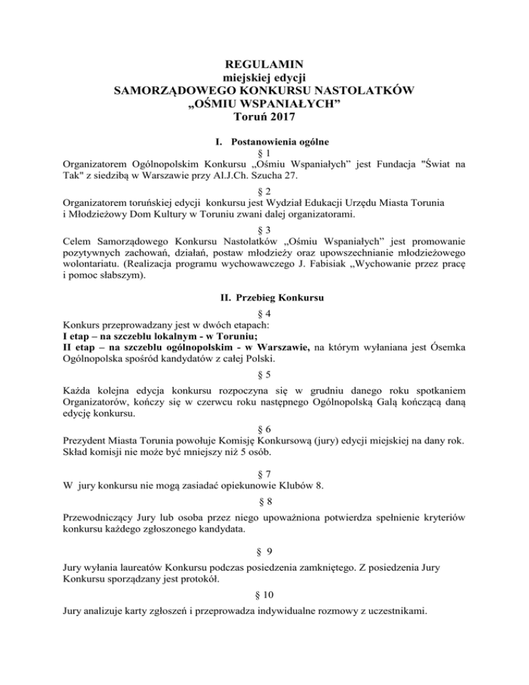 REGULAMIN miejskiej edycji SAMORZĄDOWEGO KONKURSU NASTOLATKÓW „OŚMIU WSPANIAŁYCH” Toruń 2017 I. Postanowienia ogólne §1 Organizatorem Ogólnopolskim Konkursu „Ośmiu Wspaniałych” jest Fundacja "Świat na Tak" z siedzibą w Warszawie przy Al.J.Ch. Szucha 27. §2 Organizatorem toruńskiej edycji konkursu jest Wydział Edukacji Urzędu Miasta Torunia i Młodzieżowy Dom Kultury w Toruniu zwani dalej organizatorami. §3 Celem Samorządowego Konkursu Nastolatków „Ośmiu Wspaniałych” jest promowanie pozytywnych zachowań, działań, postaw młodzieży oraz upowszechnianie młodzieżowego wolontariatu. (Realizacja programu wychowawczego J. Fabisiak „Wychowanie przez pracę i pomoc słabszym). II. Przebieg Konkursu §4 Konkurs przeprowadzany jest w dwóch etapach: I etap – na szczeblu lokalnym - w Toruniu; II etap – na szczeblu ogólnopolskim - w Warszawie, na którym wyłaniana jest Ósemka Ogólnopolska spośród kandydatów z całej Polski. §5 Każda kolejna edycja konkursu rozpoczyna się w grudniu danego roku spotkaniem Organizatorów, kończy się w czerwcu roku następnego Ogólnopolską Galą kończącą daną edycję konkursu. §6 Prezydent Miasta Torunia powołuje Komisję Konkursową (jury) edycji miejskiej na dany rok. Skład komisji nie może być mniejszy niż 5 osób. §7 W jury konkursu nie mogą zasiadać opiekunowie Klubów 8. §8 Przewodniczący Jury lub osoba przez niego upoważniona potwierdza spełnienie kryteriów konkursu każdego zgłoszonego kandydata. § 9 Jury wyłania laureatów Konkursu podczas posiedzenia zamkniętego. Z posiedzenia Jury Konkursu sporządzany jest protokół. § 10 Jury analizuje karty zgłoszeń i przeprowadza indywidualne rozmowy z uczestnikami. § 11 Jury wyłania nie więcej niż 8 laureatów na każdym etapie konkursu. § 12 Jury może przyznać równorzędne wyróżnienia. § 13 Do eliminacji ogólnopolskich zgłaszana jest 1 osoba spośród laureatów lokalnych z kategorii indywidualnej „ÓSEMKA”. § 14 Przewodniczący jury przekazuje protokół z eliminacji do Fundacji w Warszawie w terminie przewidzianym w kalendarzu prac. III. Warunki Uczestnictwa § 15 W konkursie może uczestniczyć młodzież w wieku 14 - 19 lat - uczniowie toruńskich szkół (gimnazjum i szkoły ponadgimnazjalne). § 16 Dopuszczone są dwie formy zgłoszeń: indywidualne lub grupowe. § 17 Kandydatów do konkursu może wychowawca klasy, pedagog, dyrektor szkoły lub placówki, rodzice, koleżanki i koledzy, a także kandydat może zgłosić się sam. § 18 Kandydaci mogą uczestniczyć w eliminacjach na szczeblu lokalnym i ogólnopolskim. Jury spośród kandydatów wybiera nie więcej niż 8 osób edycji lokalnej. Spośród laureatów edycji lokalnej jury nominuje reprezentanta do edycji ogólnopolskiej. § 19 Warunki zgłoszenia grupowego: - zgłoszenia rozpatrywane są tylko na szczeblu lokalnym, - zgłoszenie grupy do Konkursu może być wielokrotne pod warunkiem rozwoju prowadzonej przez nią działalności, - grupa nie może liczyć mniej niż 3 osoby. § 20 W konkursie tylko jeden raz można być laureatem lokalnym i ogólnopolskim. Osoby wyróżnione mogą brać udział w konkursie ponownie. § 21 Warunkiem zgłoszenia kandydata jest przekazanie do najbliższego lokalnego organizatora konkursu w terminie przewidzianym w kalendarzu prac następujących dokumentów: kartę uczestnictwa, którą należy wypełnić elektronicznie i umieścić na nośniku elektronicznym, np. płycie CD, pendrive,(które będą zwrócone kandydatowi), zdjęcie kandydata (najlepiej w formie elektronicznej, załączniki potwierdzające działalność kandydata ( poświadczone ksero ). § 22 Kandydat swoją działalność może przedstawić w formie prezentacji audiowizualnej lub załączyć zdjęcia na płycie CD. IV. Kryteria i formy oceny kandydata § 23 Kryterium pracy: konsekwencja w realizacji podjętych prac, zaangażowanie i wysiłek w osiągnięciu celu, pozytywny efekt społeczny, wzorotwórczy charakter działań, wytrwałość w pokonywaniu trudności, motywy działania, minimum 1 rok pracy wolontariackiej. Kryterium postawy: Integralnym warunkiem pozytywnej kwalifikacji kandydata jest nienaganna postawa w życiu codziennym (m.in.: wysoka kultura osobista, brak nałogów). Postawą zasługującą na wyróżnienie jest odpowiedzialność, umiejętność współpracy z innymi, empatia, dyskrecja, życzliwość, skuteczność działania). § 24 Przedstawione kryteria mają charakter pomocniczy i są jednym z elementów oceny kandydata. § 25 Formy działania zasługujące na nagrodzenie: podejmowanie różnych działań wolontariackich na rzecz społeczeństwa i środowiska lokalnego, zachęcanie rówieśników do działań prospołecznych, podejmowanie działań przeciw przemocy i agresji w szkole, aktywna postawa w przeciwdziałaniu uzależnieniom wśród młodzieży. V. Nagrody § 26 Najwyższym tytułem przyznawanym przez jury jest tytuł Laureata edycji Samorządowego Konkursu Nastolatków „8 Wspaniałych”. Spośród Laureatów Konkursu Jury wyłania jednego reprezentanta Torunia w ogólnopolskiej edycji. § 27 Jury nagradza laureatów edycji lokalnej dyplomem oraz znaczkiem. § 28 Na szczeblu ogólnopolskim laureaci otrzymują numerowane bursztynowe ósemki. § 29 Nagrodą dla grupy, staraniem organizatorów, powinno być zaprezentowanie dokonań nagrodzonej grupy społeczności lokalnej. § 30 Jury ma prawo przyznać wyróżnienia równorzędne oraz wyróżnienie specjalne. VI. Postanowienia końcowe § 31 Wszelkie zmiany dotyczące regulaminu i przebiegu konkursu organizator zamieści na swojej stronie internetowej. § 32 Organizator konkursu ma prawo do wykładni niniejszego regulaminu i rozstrzyganiu sporów przy jego stosowaniu.