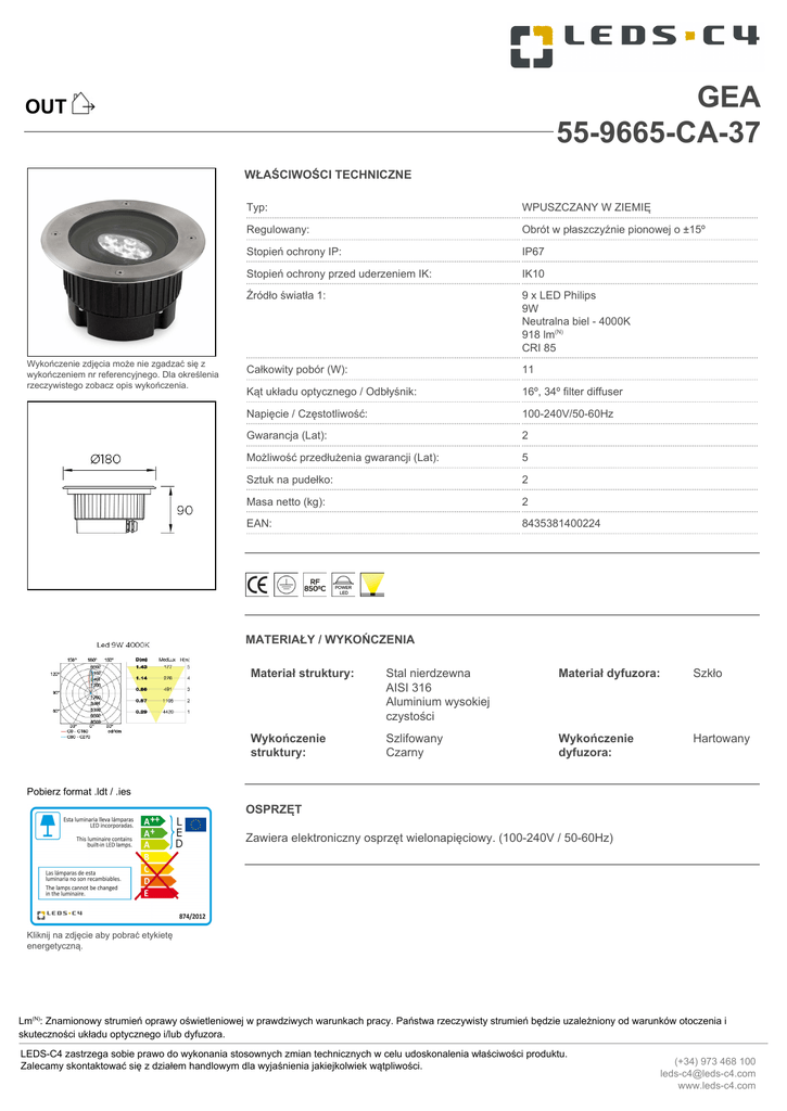GEA 55-9665-CA-37 OUT WŁAŚCIWOŚCI TECHNICZNE Wykończenie zdjęcia może nie zgadzać się z wykończeniem nr referencyjnego. Dla określenia rzeczywistego zobacz opis wykończenia. Typ: WPUSZCZANY W ZIEMIĘ Regulowany: Obrót w płaszczyźnie pionowej o ±15º Stopień ochrony IP: IP67 Stopień ochrony przed uderzeniem IK: IK10 Źródło światła 1: 9 x LED Philips 9W Neutralna biel - 4000K 918 lm(N) CRI 85 Całkowity pobór (W): 11 Kąt układu optycznego / Odbłyśnik: 16º, 34º filter diffuser Napięcie / Częstotliwość: 100-240V/50-60Hz Gwarancja (Lat): 2 Możliwość przedłużenia gwarancji (Lat): 5 Sztuk na pudełko: 2 Masa netto (kg): 2 EAN: 8435381400224 MATERIAŁY / WYKOŃCZENIA Materiał struktury: Stal nierdzewna AISI 316 Aluminium wysokiej czystości Materiał dyfuzora: Szkło Wykończenie struktury: Szlifowany Czarny Wykończenie dyfuzora: Hartowany Pobierz format .ldt / .ies OSPRZĘT Zawiera elektroniczny osprzęt wielonapięciowy. (100-240V / 50-60Hz) Kliknij na zdjęcie aby pobrać etykietę energetyczną. Lm(N): Znamionowy strumień oprawy oświetleniowej w prawdziwych warunkach pracy. Państwa rzeczywisty strumień będzie uzależniony od warunków otoczenia i skuteczności układu optycznego i/lub dyfuzora. LEDS-C4 zastrzega sobie prawo do wykonania stosownych zmian technicznych w celu udoskonalenia właściwości produktu. Zalecamy skontaktować się z działem handlowym dla wyjaśnienia jakiejkolwiek wątpliwości. (+34) 973 468 100 [email protected] www.leds-c4.com DOSTĘPNE AKCESORIA OPCJONALNE 71-9744-05-05 Materiał struktury: Polipropylen Wykończenie struktury: Szary LEDS-C4 zastrzega sobie prawo do wykonania stosownych zmian technicznych w celu udoskonalenia właściwości produktu. Zalecamy skontaktować się z działem handlowym dla wyjaśnienia jakiejkolwiek wątpliwości. (+34) 973 468 100 [email protected] www.leds-c4.com LED´S C4 REF. ENSAYO REFERENCIA 524/2015 55-9665-CA-37 POTENCIA POTENCIA POTENCIA COSENO DE POTENCIA (W) NOMINAL (W) APARENTE (VA) REACTIVA (VAR) PHI (PF) 9 10,63 19,96 16,96 0,534 CURRENT (A) 0,086 Luminaire Code 55-9665-CA-37 Name Uplight GEA led 9x1W Line - LEDS C4 LEDS Measurem. Code 55-9665-CA-37 Name Uplight GEA led 9x1W Date 10-09-2015 Luminaire Flux 837.48 lm Luminaire Power Lamps Flux 837.50 lm Maximum value Lamp Code 55-9665-CA-37 Number 1 Position Universal 9.00 W Efficacy 93.05 lm/W 7216.45 cd Position C=0.00 G=0.00 Height Height 3 mm 0 mm 100.00% CG Double Symmetrical Round Recessed Luminaire Round Luminous Area Diam. Diam. Horizontal Luminous Area Emitting area on Plane 0° Emitting area on Plane 90° 0.011310 m2 0.000000 m2 0.000000 m2 Emitting area on Plane 180° Emitting area on Plane 270° Glare area at 76° 0.000000 m2 0.000000 m2 0.002736 m2 Coordinate system Date Measurement Distance CG 10-09-2015 6.44 Symmetry Type Maximum Gamma Angle Measurement Flux Double Symmetrical 90 837.50 lm Operator Temperature Humidity Notes Asselum T2 24.00 °C 57.00 % Source voltage Source current Photocell 230.00 V Line - LEDS C4 LEDS C.I.E. F UTE 186 mm 120 mm Efficiency Code 55-9665-CA-37 Luminaire Lamps Name Lámpara 9 leds 9W 91 95 99 100 100 1.00 A Prc Flux [lm] 837.50 D DIN 5040 B NBN Pow. [W] 9.00 Q.ty 1 A60 BZ 1 Diam=186mm Incasso 90 Gamma Angles 180° 120° 0 2000 105° 105° 180 270 90° 90° C Halfplanes 180.0 0.0 270.0 90.0 2000 75° 75° 4000 60° 60° 6000 ULOR 0.00 % DLOR 100.00 % RN 45° 45° 8000 0.00 % cd 10000 30° LITESTAR (c)OxyTech Srl www.oxytech.it 15° 0° 15° 30° Page 1 55-9665 55-9666 55-9667 08-01-13 OUTDOOR 55-9663 55-9665 55-9667 OFF 25cm 10l / 15min ON 09-04-15