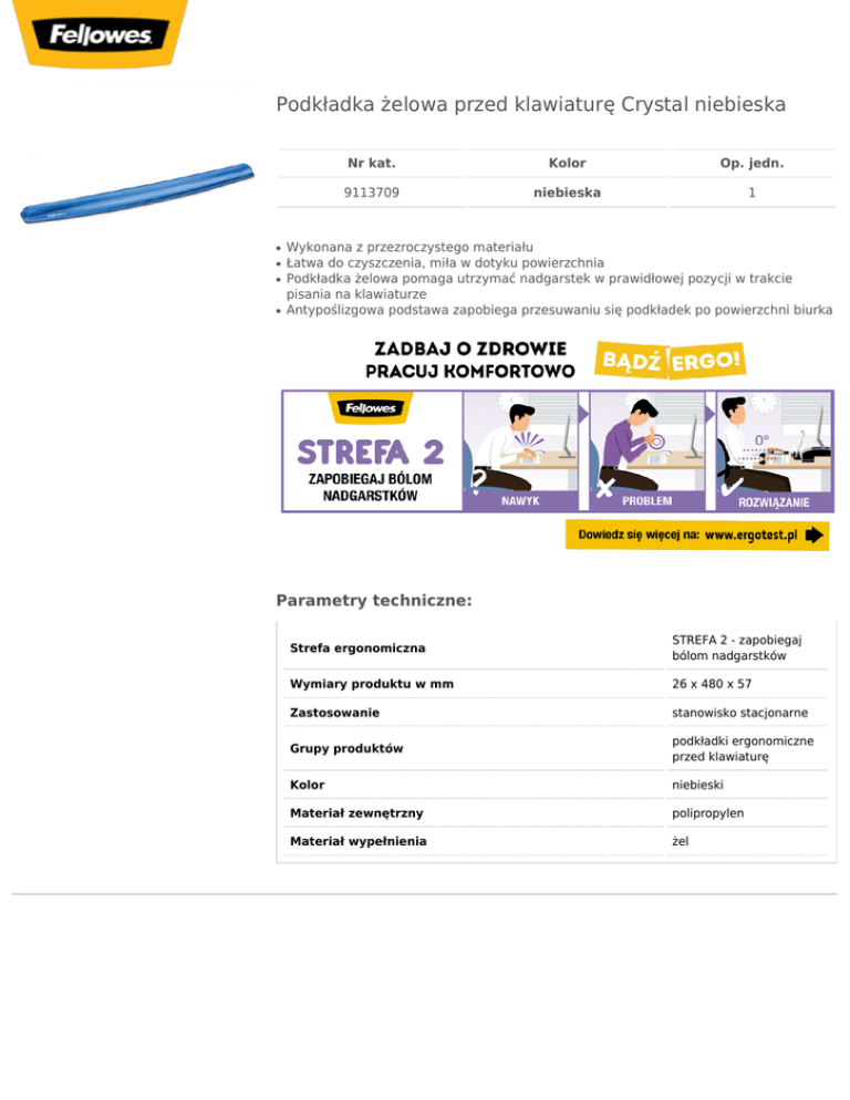 Podkładka żelowa przed klawiaturę Crystal niebieska ● ● ● ● Nr kat. Kolor Op. jedn. 9113709 niebieska 1 Wykonana z przezroczystego materiału Łatwa do czyszczenia, miła w dotyku powierzchnia Podkładka żelowa pomaga utrzymać nadgarstek w prawidłowej pozycji w trakcie pisania na klawiaturze Antypoślizgowa podstawa zapobiega przesuwaniu się podkładek po powierzchni biurka Parametry techniczne: Strefa ergonomiczna STREFA 2 - zapobiegaj bólom nadgarstków Wymiary produktu w mm 26 x 480 x 57 Zastosowanie stanowisko stacjonarne Grupy produktów podkładki ergonomiczne przed klawiaturę Kolor niebieski Materiał zewnętrzny polipropylen Materiał wypełnienia żel
