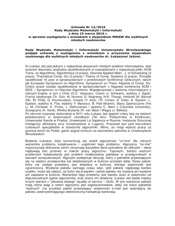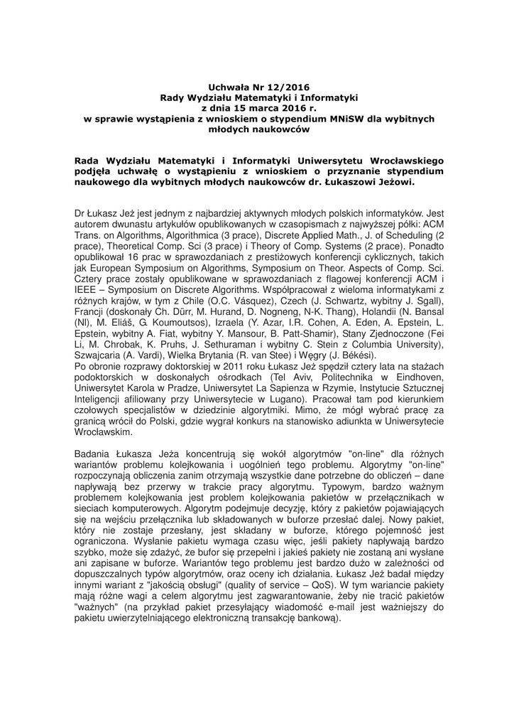 Uchwała Nr 12/2016 Rady Wydziału Matematyki i Informatyki z dnia 15 marca 2016 r. w sprawie wystąpienia z wnioskiem o stypendium MNiSW dla wybitnych młodych naukowców Rada Wydziału Matematyki i Informatyki Uniwersytetu Wrocławskiego podjęła uchwałę o wystąpieniu z wnioskiem o przyznanie stypendium naukowego dla wybitnych młodych naukowców dr. Łukaszowi Jeżowi. Dr Łukasz Jeż jest jednym z najbardziej aktywnych młodych polskich informatyków. Jest autorem dwunastu artykułów opublikowanych w czasopismach z najwyższej półki: ACM Trans. on Algorithms, Algorithmica (3 prace), Discrete Applied Math., J. of Scheduling (2 prace), Theoretical Comp. Sci (3 prace) i Theory of Comp. Systems (2 prace). Ponadto opublikował 16 prac w sprawozdaniach z prestiżowych konferencji cyklicznych, takich jak European Symposium on Algorithms, Symposium on Theor. Aspects of Comp. Sci. Cztery prace zostały opublikowane w sprawozdaniach z flagowej konferencji ACM i IEEE – Symposium on Discrete Algorithms. Współpracował z wieloma informatykami z różnych krajów, w tym z Chile (O.C. Vásquez), Czech (J. Schwartz, wybitny J. Sgall), Francji (doskonały Ch. Dürr, M. Hurand, D. Nogneng, N-K. Thang), Holandii (N. Bansal (Nl), M. Eliáš, G. Koumoutsos), Izraela (Y. Azar, I.R. Cohen, A. Eden, A. Epstein, L. Epstein, wybitny A. Fiat, wybitny Y. Mansour, B. Patt-Shamir), Stany Zjednoczone (Fei Li, M. Chrobak, K. Pruhs, J. Sethuraman i wybitny C. Stein z Columbia University), Szwajcaria (A. Vardi), Wielka Brytania (R. van Stee) i Węgry (J. Békési). Po obronie rozprawy doktorskiej w 2011 roku Łukasz Jeż spędził cztery lata na stażach podoktorskich w doskonałych ośrodkach (Tel Aviv, Politechnika w Eindhoven, Uniwersytet Karola w Pradze, Uniwersytet La Sapienza w Rzymie, Instytucie Sztucznej Inteligencji afiliowany przy Uniwersytecie w Lugano). Pracował tam pod kierunkiem czołowych specjalistów w dziedzinie algorytmiki. Mimo, że mógł wybrać pracę za granicą wrócił do Polski, gdzie wygrał konkurs na stanowisko adiunkta w Uniwersytecie Wrocławskim. Badania Łukasza Jeża koncentrują się wokół algorytmów "on-line" dla różnych wariantów problemu kolejkowania i uogólnień tego problemu. Algorytmy "on-line" rozpoczynają obliczenia zanim otrzymają wszystkie dane potrzebne do obliczeń – dane napływają bez przerwy w trakcie pracy algorytmu. Typowym, bardzo ważnym problemem kolejkowania jest problem kolejkowania pakietów w przełącznikach w sieciach komputerowych. Algorytm podejmuje decyzję, który z pakietów pojawiających się na wejściu przełącznika lub składowanych w buforze przesłać dalej. Nowy pakiet, który nie zostaje przesłany, jest składany w buforze, którego pojemność jest ograniczona. Wysłanie pakietu wymaga czasu więc, jeśli pakiety napływają bardzo szybko, może się zdażyć, że bufor się przepełni i jakieś pakiety nie zostaną ani wysłane ani zapisane w buforze. Wariantów tego problemu jest bardzo dużo w zależności od dopuszczalnych typów algorytmów, oraz oceny ich działania. Łukasz Jeż badał między innymi wariant z "jakością obsługi" (quality of service – QoS). W tym wariancie pakiety mają różne wagi a celem algorytmu jest zagwarantowanie, żeby nie tracić pakietów "ważnych" (na przykład pakiet przesyłający wiadomość e-mail jest ważniejszy do pakietu uwierzytelniającego elektroniczną transakcję bankową). Dla problemów tego typu Łukasz Jeż opracował wiele algorytmów. Precyzyjny opis jego osiągnięć zająłby zbyt wiele miejsca, dlatego to co napiszę będzie popularnym przybliżeniem faktycznych wyników. Łukasz Jeż podał między innymi najlepszy (tracący najmniej ważnych pakietów) ogólny algorytm zrandomizowany (losowy), znacznie lepszy od wcześniej znanych algorytmów rozwiązujących problemy dla zagadnień szczegółowych (parametrem mogą być na przykład założenia dotyczące sposobu generowania napływających pakietów). Wśród algorytmów Jeża są takie, które rozwiązują problemy ze zmiennym kosztem obsługi różnych pakietów i takie w których dopuszczalne opóźnienia pakietów nie są znane. Wszystkie liczne wyniki uzyskane przez dra Łukasza Jeża są bardzo wartościowe i zostały bardzo życzliwie przyjęte przez informatyków zajmujących się algorytmiką w Europie i poza nią. Po powrocie do Polski ze zdobytą za granicami wiedzą, doświaczeniem i kontaktami Łukasz Jeż stał się ważnym badaczem wzbogacającym wrocławskie środowisko informatyczne. Jest on doskonałym kandydatem do stypendium dla wybitnych młodych naukowców. Nie mam wątpliwości, że doskonale wykorzysta dobre warunki do pracy, które takie stypendium mu zapewni.