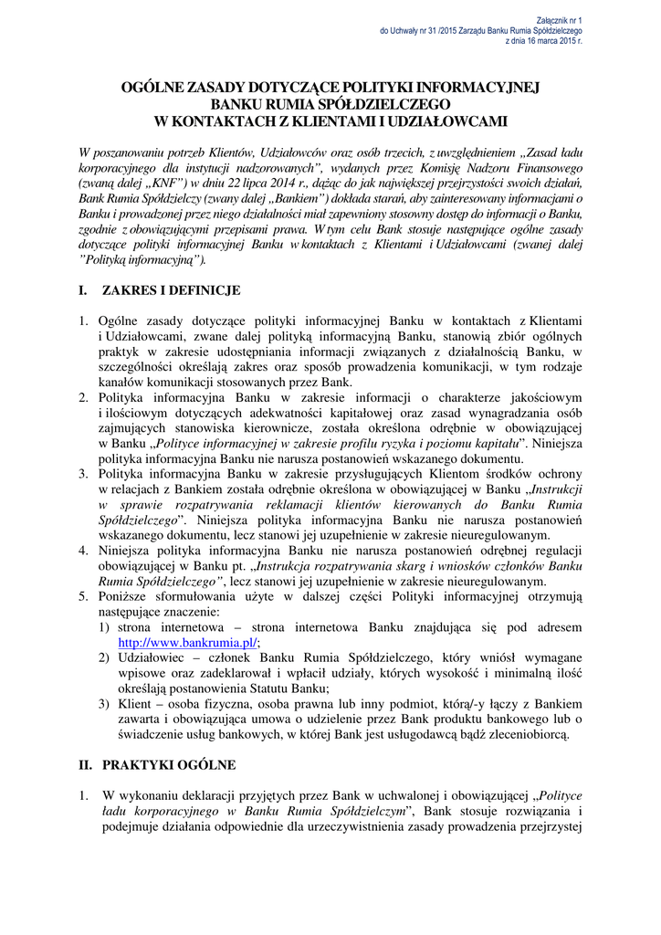 Załącznik nr 1 do Uchwały nr 31 /2015 Zarządu Banku Rumia Spółdzielczego z dnia 16 marca 2015 r. OGÓLNE ZASADY DOTYCZĄCE POLITYKI INFORMACYJNEJ BANKU RUMIA SPÓŁDZIELCZEGO W KONTAKTACH Z KLIENTAMI I UDZIAŁOWCAMI W poszanowaniu potrzeb Klientów, Udziałowców oraz osób trzecich, z uwzględnieniem „Zasad ładu korporacyjnego dla instytucji nadzorowanych”, wydanych przez Komisję Nadzoru Finansowego (zwaną dalej „KNF”) w dniu 22 lipca 2014 r., dążąc do jak największej przejrzystości swoich działań, Bank Rumia Spółdzielczy (zwany dalej „Bankiem”) dokłada starań, aby zainteresowany informacjami o Banku i prowadzonej przez niego działalności miał zapewniony stosowny dostęp do informacji o Banku, zgodnie z obowiązującymi przepisami prawa. W tym celu Bank stosuje następujące ogólne zasady dotyczące polityki informacyjnej Banku w kontaktach z Klientami i Udziałowcami (zwanej dalej ”Polityką informacyjną”). I. ZAKRES I DEFINICJE 1. Ogólne zasady dotyczące polityki informacyjnej Banku w kontaktach z Klientami i Udziałowcami, zwane dalej polityką informacyjną Banku, stanowią zbiór ogólnych praktyk w zakresie udostępniania informacji związanych z działalnością Banku, w szczególności określają zakres oraz sposób prowadzenia komunikacji, w tym rodzaje kanałów komunikacji stosowanych przez Bank. 2. Polityka informacyjna Banku w zakresie informacji o charakterze jakościowym i ilościowym dotyczących adekwatności kapitałowej oraz zasad wynagradzania osób zajmujących stanowiska kierownicze, została określona odrębnie w obowiązującej w Banku „Polityce informacyjnej w zakresie profilu ryzyka i poziomu kapitału”. Niniejsza polityka informacyjna Banku nie narusza postanowień wskazanego dokumentu. 3. Polityka informacyjna Banku w zakresie przysługujących Klientom środków ochrony w relacjach z Bankiem została odrębnie określona w obowiązującej w Banku „Instrukcji w sprawie rozpatrywania reklamacji klientów kierowanych do Banku Rumia Spółdzielczego”. Niniejsza polityka informacyjna Banku nie narusza postanowień wskazanego dokumentu, lecz stanowi jej uzupełnienie w zakresie nieuregulowanym. 4. Niniejsza polityka informacyjna Banku nie narusza postanowień odrębnej regulacji obowiązującej w Banku pt. „Instrukcja rozpatrywania skarg i wniosków członków Banku Rumia Spółdzielczego”, lecz stanowi jej uzupełnienie w zakresie nieuregulowanym. 5. Poniższe sformułowania użyte w dalszej części Polityki informacyjnej otrzymują następujące znaczenie: 1) strona internetowa – strona internetowa Banku znajdująca się pod adresem http://www.bankrumia.pl/; 2) Udziałowiec – członek Banku Rumia Spółdzielczego, który wniósł wymagane wpisowe oraz zadeklarował i wpłacił udziały, których wysokość i minimalną ilość określają postanowienia Statutu Banku; 3) Klient – osoba fizyczna, osoba prawna lub inny podmiot, którą/-y łączy z Bankiem zawarta i obowiązująca umowa o udzielenie przez Bank produktu bankowego lub o świadczenie usług bankowych, w której Bank jest usługodawcą bądź zleceniobiorcą. II. PRAKTYKI OGÓLNE 1. W wykonaniu deklaracji przyjętych przez Bank w uchwalonej i obowiązującej „Polityce ładu korporacyjnego w Banku Rumia Spółdzielczym”, Bank stosuje rozwiązania i podejmuje działania odpowiednie dla urzeczywistnienia zasady prowadzenia przejrzystej 2. 3. 4. 5. III. polityki informacyjnej, uwzględniającej uzasadnione potrzeby swoich Udziałowców oraz Klientów. Bank dąży do ułatwienia dostępu do informacji związanych z jego działalnością oraz do ich prezentowania w sposób przejrzysty, rzetelny i kompletny. Nie udostępnia się informacji objętych tajemnicą bankową, tajemnicą przedsiębiorstwa lub innych danych dla których prawo powszechnie obowiązujące lub interes Banku wymagają poufności. Polityka informacyjna Banku ma na celu zagwarantowanie wysokich standardów komunikacji, służących kształtowaniu wizerunku Banku jako uczciwej i rzetelnej instytucji zaufania publicznego. Podstawowym sposobem przekazywania przez Bank informacji związanych z jego działalnością jest udostępnianie materiałów i informacji w siedzibie Centrali Banku, w Oddziałach oraz na stronie internetowej Banku, chyba że przepis powszechnie obowiązującego prawa przewiduje inaczej. W ramach realizacji celów Polityki informacyjnej, o których mowa w ustępach 2 i 3 bieżącego punktu, Bank podejmuje ponadto następujące działania: a) corocznie udostępnia Klientom i Udziałowcom w siedzibie Centrali i Oddziałów Banku sporządzone w formie pisemnej raporty zawierające informacje finansowe, pod nazwą „Informacja z zakresu profilu ryzyka i poziomu kapitału”, co unormowane jest regulacją wskazaną w punkcie I ust. 2 niniejszego aktu; b) na podstawie przepisów odpowiednich ustaw składa i publikuje swoje sprawozdania finansowe w Krajowym Rejestrze Sądowym i w „Monitorze Spółdzielczym”. STRONA INTERNETOWA 1. Informacje zamieszczane na stronie internetowej Banku mają na celu umożliwienie uzyskania łatwego dostępu do informacji na temat oferty produktowej Banku w celu wyboru produktów i usług dopasowanych do indywidualnych potrzeb Klientów oraz realizację obowiązków informacyjnych wynikających z przepisów prawa, z zastrzeżeniem określonym w ust.3. 2. Strona internetowa Banku zawiera między innymi: 1) podstawowe informacje o Banku, Spółdzielczej Grupie Bankowej i banku zrzeszającym – SGB S.A.; 2) skład osobowy Zarządu oraz Rady Nadzorczej Banku, z wyszczególnieniem imion i nazwisk oraz funkcji; 3) dane kontaktowe Banku z wyszczególnieniem formy kontaktu; 4) wykaz oddziałów Banku; 5) podstawowe informacje związane z ofertą produktową Banku; 6) stosowane stawki oprocentowania środków na rachunkach bankowych, kredytów i pożyczek; 7) stosowaną w Banku Taryfę opłat i prowizji; 8) informację o dostępności us