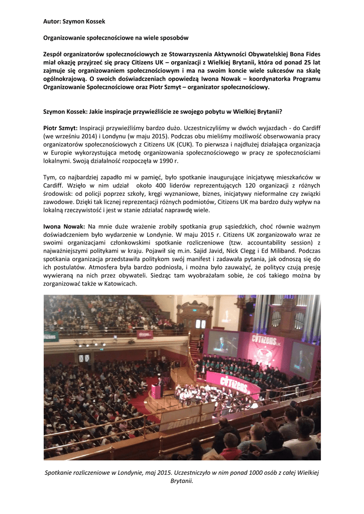 Autor: Szymon Kossek Organizowanie społecznościowe na wiele sposobów Zespół organizatorów społecznościowych ze Stowarzyszenia Aktywności Obywatelskiej Bona Fides miał okazję przyjrzeć się pracy Citizens UK – organizacji z Wielkiej Brytanii, która od ponad 25 lat zajmuje się organizowaniem społecznościowym i ma na swoim koncie wiele sukcesów na skalę ogólnokrajową. O swoich doświadczeniach opowiedzą Iwona Nowak – koordynatorka Programu Organizowanie Społecznościowe oraz Piotr Szmyt – organizator społecznościowy. Szymon Kossek: Jakie inspiracje przywieźliście ze swojego pobytu w Wielkiej Brytanii? Piotr Szmyt: Inspiracji przywieźliśmy bardzo dużo. Uczestniczyliśmy w dwóch wyjazdach - do Cardiff (we wrześniu 2014) i Londynu (w maju 2015). Podczas obu mieliśmy możliwość obserwowania pracy organizatorów społecznościowych z Citizens UK (CUK). To pierwsza i najdłużej działająca organizacja w Europie wykorzystująca metodę organizowania społecznościowego w pracy ze społecznościami lokalnymi. Swoją działalność rozpoczęła w 1990 r. Tym, co najbardziej zapadło mi w pamięć, było spotkanie inaugurujące inicjatywę mieszkańców w Cardiff. Wzięło w nim udział około 400 liderów reprezentujących 120 organizacji z różnych środowisk: od policji poprzez szkoły, kręgi wyznaniowe, biznes, inicjatywy nieformalne czy związki zawodowe. Dzięki tak licznej reprezentacji różnych podmiotów, Citizens UK ma bardzo duży wpływ na lokalną rzeczywistość i jest w stanie zdziałać naprawdę wiele. Iwona Nowak: Na mnie duże wrażenie zrobiły spotkania grup sąsiedzkich, choć równie ważnym doświadczeniem było wydarzenie w Londynie. W maju 2015 r. Citizens UK zorganizowało wraz ze swoimi organizacjami członkowskimi spotkanie rozliczeniowe (tzw. accountability session) z najważniejszymi politykami w kraju. Pojawił się m.in. Sajid Javid, Nick Clegg i Ed Miliband. Podczas spotkania organizacja przedstawiła politykom swój manifest i zadawała pytania, jak odnoszą się do ich postulatów. Atmosfera była bardzo podniosła, i można było zauważyć, że politycy czują presję wywieraną na nich przez obywateli. Siedząc tam wyobrażałam sobie, że coś takiego można by zorganizować także w Katowicach. Spotkanie rozliczeniowe w Londynie, maj 2015. Uczestniczyło w nim ponad 1000 osób z całej Wielkiej Brytanii. SZK: Wspomnieliście o zorganizowanym przez Citizens UK spotkaniu z politykami. Jak ludzie stojący u władzy traktują ten ruch? Jako przeciwnika, czy partnera do współpracy? Iwona: Citizens UK skupia tysiące ludzi, a taką siłę trudno lekceważyć. Dlatego też takie spotkania politycy traktują raczej jak spotkania z elektoratem. Nawet, jeżeli to dla nich trudne i mają inny punkt widzenia na dany temat, to presja jest tak ogromna, że siłą rzeczy nie mogą się od niego odcinać. I właśnie na tym polega ogromna moc tego ruchu. W każdej kwestii jest w stanie doprowadzić do rozmów i negocjacji na najwyższym szczeblu, i w konsekwencji do różnych zmian społecznych. SZK: Jakie kampanie społeczne udało się zrealizować organizacjom zreszonym w CUK? Piotr: Wśród dużych ogólnokrajowych kampanii społecznych, które realizowało CUK należy wymienić te dotyczące podniesienia płacy minimalnej dla pracowników najniższego szczebla sektora publicznego, skrócenie okresu przetrzymywania tzw. nielegalnych imigrantów w ośrodkach detencji, czy przypisanie każdemu seniorowi jednego opiekuna, który regularnie odwiedza chorego i zajmuje się jego potrzebami. Z lokalnych było to na przykład podniesienie standardu budynków w dzielnicy jednego z miast, gdzie zagrzybienie powodowało częste choroby u dzieci. SZK: Jakie dostrzegacie różnice między funkcjonowaniem organizacji z Citizens UK a katowickimi organizacjami pozarządowymi? Iwona: Ogromną różnicę widać pod względem finansowym. Każda organizacja należąca do Citizens UK płaci składkę, co pozwala finansować działalność ruchu. Dodatkowo często zdarza się tak, że organizacje z własnej woli wpłacają środki na jakąś kampanię, w której nie mają bezpośredniego interesu. Jest to dla nich po prostu kwestia poczucia odpowiedzialności społecznej i prestiżu. W Katowicach natomiast wiele organizacji korzysta ze środków unijnych lub, jak to ma miejsce w przypadku Bona Fides, funduszy norweskich. Jesteśmy więc uzależnieni od naszych grantodawców. Ponadto sporo ngos-ów otrzymuje pieniądze z urzędu miasta. Nasze Stowarzyszenie ze względu na specyfikę swoich działań (Bona Fides monitoruje działania instytucji publicznych, w tym urzędy miast – przyp. red.) nie ubiega się o dotacje finansowane przez lokalne władze. Z jednej strony pozwala to nam zachować niezależność i bezstronność, ale z drugiej ogranicza żróżnicowanie źródeł finansowania naszej działalności. Ponadto, Citizens UK aby aktywizować mieszkańców oraz członków swoich grup sąsiedzkich do działania, jest mocno nastawiony na agitację. Testuje swoich liderów, prosząc aby na dane spotkanie przyprowadziły minimum 5 osób. Pozwala mu to sprawdzić czy lider ma tzw. following, czyli czy podążają za nią inni ludzie, czy potrafi wywierać wpływ w swoim środowisku lokalnym itd. My nie działamy w taki sposób. Piotr: Należy wspomnieć też o tym, że CUK wykorzystuje organizowanie społecznościowe już od 25 lat, natomiast my w Katowicach pracujemy z mieszkańcami tą metodą zaledwie od 5. Co więcej, metoda nie jest wciąż popularna w Polsce. Stąd w tym momencie pracujemy nad strategią PR, aby organizacje z innych miast zajmujące się tematyką partycypacji społecznej, jak również mieszkańcy tych dzielnic Katowic, w których nie pracujemy, dowiedzieli się o tym, co fajnego robimy, i że mogą przy naszym wsparciu wprowadzać namacalne zmiany w swoim środowisku. SZK: Jak oceniacie Wasz wyjazd? Z czego jesteście zado
