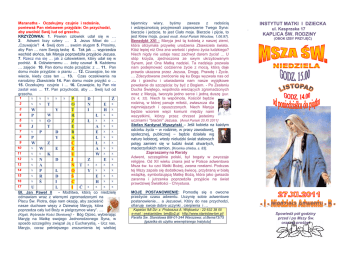 Maranatha - Oczekujmy czujnie i radośnie, ponieważ Pan niebawem przyjdzie: On przychodzi, aby uwolnić Swój lud od grzechu. KRZYŻÓWKA: 1. Pewien człowiek udał się w … 2. Adwent liczy cztery … 3. Jezus Mówi do …: „Czuwajcie”! 4. Swój dom … swoim sługom 5. Prosimy, aby Pan … nam Swoją łaskę 6. Tak jak … wyprzedza wschód słońca, tak Maryja poprzedziła przyjście Jezusa. 7. Rzecz ma się … jak z człowiekiem, który udał się w podróż. 8. Odźwiernemu … żeby czuwał 9. Każdemu … zajęcie 10. Pan domu może przyjdzie: z … 11. Pan domu może przyjdzie: o pianiu … 12. Czuwajcie, bo nie wiecie, kiedy czas ten … 13. Czas oczekiwania na narodziny Zbawiciela 14. Pan domu może przyjść o … 15. Oczekujmy czujnie i … 16. Czuwajcie, by Pan nie zastał was … 17. Pan przychodzi, aby … Swój lud od grzechu. 1 x x x 2 x x T 3 4 W P 5 x 6 J 7 x 8 9 x Y W x O T P P W D Y Z 10 x W 11 x x 12 x 13 x 14 x 15 x 16 x N A P R Ś 17 U E K D Ł D I L x P O T R Z E B A C Z U J N O Ś C I Ż D N I Ł E H x Ł x x x x x A E Ł Ł A W x x x x x x x x x x x x E x Z T Ć x x x x x Y x x x E H x x x x x x x x Bł. Jan Paweł II - Modlitwa, którą co niedzielę odmawiam wraz z wiernymi zgromadzonymi na Placu Św. Piotra, daje nam okazję, aby zacieśnić nasze duchowe więzy z Dziewicę Maryją, która poprzedza cały lud Boży w pielgrzymce wiary”. .... (Kigali, Wybrzeże Kości Słoniowej) - Bóg Ojciec, wybierając Maryję na Matkę swojego Jednorodzonego Syna, w sposób szczególny związał Ją z Eucharystią. - Ucz nas, Maryjo, coraz pełniejszego zrozumienia tej wielkiej tajemnicy wiary, byśmy zawsze z radością i wdzięcznością przyjmowali zaproszenie Twego Syna: bierzcie i jedzcie, to jest Ciało moje. Bierzcie i pijcie, to jest Krew moja. (przed modl. Anioł Pański Wrocław, 1.06.97). Benedykt XVI - Maryja jest tą kobietą z naszej ziemi, która otrzymała przywilej urodzenia Zbawiciela świata. Któż lepiej niż Ona zna wartość i piękno życia ludzkiego? Niech nigdy nie ustaje nasz zachwyt darem życia! … U stóp krzyża, zjednoczona ze swym ukrzyżowanym Synem, jest Ona Matką nadziei. Ta nadzieja pozwala nam podejmować codzienne życie z mocą, którą daje prawda ukazana przez Jezusa, Drogę, Prawdę i Życie. … Zdecydowane zwrócenie się ku Bogu wyzwala nas od zła i grzechu i uświadamia nam nasze wyjątkowe powołanie do szczęścia: by być z Bogiem. - Po Zesłaniu Ducha Świętego, wspólnota wierzących zgromadzonych wraz z Maryją, tworzyła jedno serce i jedną duszę (por. Dz 4, 32). Niech ta wspólnota, Kościół będzie rodziną, w której panuje miłość, zwłaszcza dla najmniejszych i opuszczonych. Niech Maryja będzie wzorem więzi komunii między nami wszystkimi, którzy przez chrzest jesteśmy uczniami i "braćmi" Jezusa. [Anioł Pański 20 XI 2011] Stefan Kardynał Wyszyński – Jeśli kobieta na każdym odcinku życia – w rodzinie, w pracy zawodowej, społecznej, publicznej – będzie działała wg natury kobiecej, wtedy nieludzki świat stalowych potęg zamieni się w ludzki świat otwartych, macierzyńskich ramion. [Kromka chleba, s. 83]. Zapraszamy na Roraty Adwent, szczególnie polski, był bogaty w zwyczaje religijne. Od XII wieku znana jest w Polsce adwentowa Msza św. ku czci Matki Bożej, zwana roratami. Podczas tej Mszy zapala się dodatkową świecę, przybraną w białą wstążkę, symbolizującą Matkę Bożą, która jako gwiazda zaranna i jutrzenka poprzedziła przyjście na świat prawdziwej Światłości - Chrystusa. INSTYTUT MATKI I DZIECKA . ul. Kasprzaka 17 KAPLICA ŚW. RODZINY (OBOK IZBY PRZYJĘĆ) MOJE POSTANOWIENIE: Pomodlę się o owocne przeżycie czasu adwentu. Uczynię sobie adwentowe postanowienie… a Jezusowi, Który do nas przychodzi, ofiaruję swoje dobre uczynki , cierpienia i … Kapelan IMi Dz- x. Proboszcz A. Wójtowicz - 22 632 38 00 e-mail : [email protected] http://www.stanislaw-bm.pl/ Parafia Św. Stanisława BM-01-244 Warszawa; ul.Bema73/75 [gazetka do użytku wewnętrznego Instytutu] Spowiedź pół godziny przed i po Mszy Św. oraz na prośbę. Okaż nam, Panie, łaske swoją i daj nam swoje zbawienie. (Ps 85, 8) Mk 13,33-37 Jezus powiedział do swoich uczniów: Uważajcie, czuwajcie, bo nie wiecie, kiedy czas ten nadejdzie. Bo rzecz ma się podobnie jak z człowiekiem, który udał się w podróż. Zostawił swój dom, powierzył swoim sługom staranie o wszystko, każdemu wyznaczył zajęcie, a odźwiernemu przykazał, żeby czuwał. Czuwajcie więc, bo nie wiecie, kiedy pan domu przyjdzie: z wieczora czy o północy, czy o pianiu kogutów, czy rankiem. By niespodzianie przyszedłszy, nie zastał was śpiących. Lecz co wam mówię, mówię wszystkim: Czuwajcie! Rozpoczynający się dzisiaj okres Adwentu jest przygotowaniem do świętowania wcielenia Syna Bożego w Narodzeniu Pańskim. Nierozerwalnie łączy się to z oczekiwaniem na Jego powtórne przyjście. Syn Boży po to bowiem stał się człowiekiem, aby dać nam udział w życiu Boga. … Dany nam został pewien określony czas, z którego będziemy musieli zdać rachunek. Ewangeliczne czuwanie, o którym dzisiaj słyszymy, nie oznacza bierności lub ucieczki od życia, nie ma też nic wspólnego z lękiem. Ten, kto czuwa, każdego dnia pamięta o ostatecznym celu swojego życia i w każdej chwili jest gotowy na spotkanie z Panem. [ks. Maciej Zachara MIC, „Oremus” Adwent 05, s. 4] KALENDARIUM: : 30 XI - śr - Święto św. Andrzeja Apostoła 03 XII - sb - Wsp. św. Franciszka Ksawerego, kapłana Żeby zobaczyć niewidzialne, trzeba … zamknąć oczy. Żeby usłyszeć niesłyszalne, trzeba nie tylko zamknąć uszy na wszystkie turkoty, łoskoty, klekoty, łomoty, ale zaprosić do serca taką ciszę, żeby nawet Boży szept usłyszeć. … Jak Maryja, która cała zamieniała się w słuch i cała stawała się modlitwą… Usłyszała każde słowo Anioła, którego nie usłyszał nikt inny, choć nie g