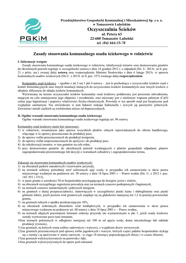 Przedsiębiorstwo Gospodarki Komunalnej i Mieszkaniowej Sp. z o. o. w Tomaszowie Lubelskim Oczyszczalnia Ścieków ul. Petera 63 22-600 Tomaszów Lubelski tel. (84) 664-35-70 Zasady stosowania komunalnego osadu ściekowego w rolnictwie I. Informacje wstępne Zasady stosowania komunalnego osadu ściekowego w rolnictwie, rekultywacji terenów oraz dostosowania gruntów do określonych potrzeb reguluje w szczególności ustawa z dnia 14 grudnia 2012 r. o odpadach (Dz. U. 2013r., nr 0, poz. 21 z późn. zm.) zwanej dalej ustawą oraz rozporządzenie Ministra Środowiska z dnia 6 lutego 2015r. w sprawie komunalnych osadów ściekowych (Dz.U. z 2015r. nr 0, poz. 257) zwanego dalej rozporządzeniem. Komunalny osad ściekowy - zgodnie z art.3 ust.1 pkt 4 ustawy - jest to pochodzący z oczyszczalni ścieków osad z komór fermentacyjnych oraz innych instalacji służących do oczyszczania ścieków komunalnych oraz innych ścieków o składzie zbliżonym do składu ścieków komunalnych. Wytwarzany na terenie oczyszczalni ścieków komunalny osad ściekowy poddawany jest procesom odwodnienia, mającym na celu zmniejszenie jego objętości i uwodnienia, oraz mieszany jest z mielonym wapnem palonym (CaO) celem jego higienizacji i poprawy właściwości fizyko-chemicznych. Powstały w ten sposób osad jest bezpieczny pod względem sanitarnym. Nie stwierdzono w nim bakterii rodzaju Salmonella i żywych jaj pasożytów jelitowych. Zawartości metali ciężkich są wielokrotnie niższe od dopuszczalnych. II. Ogólne warunki stosowania komunalnego osadu ściekowego Ogólne warunki stosowania komunalnego osadu ściekowego reguluje art. 96 ustawy. Komunalny osad ściekowy może być stosowany: 1) w rolnictwie, rozumianym jako uprawa wszystkich płodów rolnych wprowadzanych do obrotu handlowego, włączając w to uprawy przeznaczane do produkcji pasz, 2) do uprawy roślin przeznaczonych do produkcji kompostu, 3) do uprawy roślin nieprzeznaczonych do spożycia i do produkcji pasz. 4) do rekultywacji terenów, w tym gruntów na cele rolne, 5) przy dostosowaniu gruntów do określonych potrzeb wynikających z planów gospodarki odpadami, planów zagospodarowania przestrzennego lub decyzji o warunkach zabudowy i zagospodarowania terenu, Zakazuje się stosowania komunalnych osadów ściekowych: 1) na obszarach parków narodowych i rezerwatów przyrody, 2) na terenach ochrony pośredniej stref ochronnych ujęć wody, w przypadku ich ustanowienia w akcie prawa miejscowego wydanym na podstawie art. 58 ustawy z dnia 18 lipca 2001 r. – Prawo wodne (Dz. U. z 2012 r. poz. 145, 951 i 1513), 3) w pasie gruntu o szerokości 50 m bezpośrednio przylegającego do brzegów jezior i cieków, 4) na obszarach szczególnego zagrożenia powodzią oraz na terenach czasowo podtopionych i bagiennych, 5) na terenach czasowo zamarzniętych i pokrytych śniegiem, 6) na gruntach o dużej przepuszczalności, stanowiących w szczególności piaski luźne i słabogliniaste oraz piaski gliniaste lekkie, jeżeli poziom wód gruntowych znajduje się na głębokości mniejszej niż 1,5 m poniżej powierzchni gruntu, 7) na gruntach rolnych o spadku przekraczającym 10%, 8) na obszarach ochronnych zbiorników wód śródlądowych, w przypadku ich ustanowienia w akcie prawa miejscowego wydanym na podstawie art. 60 ustawy z dnia 18 lipca 2001 r. – Prawo wodne;, 9) na terenach objętych pozostałymi formami ochrony przyrody nie wymienionymi w pkt 1, jeżeli osady ściekowe zostały wytworzone poza tymi terenami, 10)na terenach położonych w odległości mniejszej niż 100 m od ujęcia wody, domu mieszkalnego lub zakładu produkcji żywności, 11) na gruntach, na których rosną rośliny sadownicze i warzywa, z wyjątkiem drzew owocowych, 12)na gruntach przeznaczonych pod uprawę roślin jagodowych i warzyw, których części jadalne bezpośrednio stykają się z ziemią i są spożywane w stanie surowym - w ciągu 18 miesięcy poprzedzających zbiory i w czasie zbiorów, 13)na gruntach wykorzystywanych na pastwiska i łąki, 14)na gruntach wykorzystywanych do upraw pod osłonami. III. Badania gruntu i komunalnego osadu ściekowego Przed stosowaniem komunalne osady ściekowe oraz grunty, na których mają one być stosowane, są poddane badaniom przez uprawnione laboratorium, na koszt wytwórcy komunalnych osadów ściekowych. Wyniki tych badań są załączone do tego dokumentu. IV. Dopuszczalne dawki komunalnych osadów ściekowych i warunki ich stosowania Dopuszczalne dawki komunalnych osadów ściekowych, które mogą być stosowane w ciągu roku na jednostkę powierzchni gruntu, pod warunkiem przestrzegania dopuszczalnej zawartości metali ciężkich w komunalnych osadach ściekowych, i zgodnie z rozporządzeniem nie mogą przekraczać: W rolnictwie oraz do rekultywacji gruntów na cele rolne — 3 Mg s.m./ha/rok (ton suchej masy/ha/rok); Do rekultywacji terenów na cele nierolne oraz przy dostosowywaniu gruntów do określonych potrzeb wynikających z planów gospodarki odpadami, planów zagospodarowania przestrzennego lub decyzji o warunkach zabudowy i zagospodarowania terenu, do uprawy roślin przeznaczonych do produkcji kompostu, do uprawy roślin nieprzeznaczonych do spożycia i do produkcji pasz — 15 Mg s.m./ha/rok. Przy jednokrotnym w ciągu dwóch albo trzech lat stosowaniu komunalnych osadów ściekowych w rolnictwie oraz do rekultywacji gruntów na cele rolne dopuszczalna dawka komunalnych osadów ściekowych może być skumulowana i nie może przekraczać odpowiednio 6 Mg s.m./ha/2 lata i 9 Mg s.m./ha/3 lata. Przy jednokrotnym w ciągu dwóch albo trzech lat stosowaniu komunalnych osadów ściekowych do rekultywacji terenów na cele nierolne oraz przy dostosowywaniu gruntów do określonych potrzeb wynikających z planów gospodarki odpadami, planów zagospodarowania przestrzennego lub decyzji o warunkach zabudowy i zagospodarowania terenu, do uprawy roślin przeznaczonych do produkcji kompostu, do uprawy roślin nieprzezna