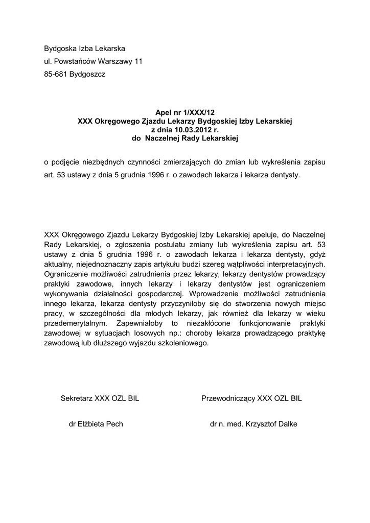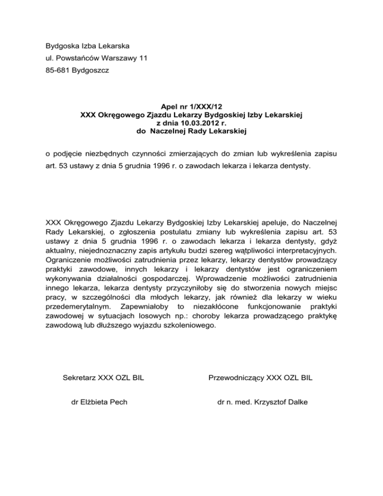Bydgoska Izba Lekarska ul. Powstańców Warszawy 11 85-681 Bydgoszcz Apel nr 1/XXX/12 XXX Okręgowego Zjazdu Lekarzy Bydgoskiej Izby Lekarskiej z dnia 10.03.2012 r. do Naczelnej Rady Lekarskiej o podjęcie niezbędnych czynności zmierzających do zmian lub wykreślenia zapisu art. 53 ustawy z dnia 5 grudnia 1996 r. o zawodach lekarza i lekarza dentysty. XXX Okręgowego Zjazdu Lekarzy Bydgoskiej Izby Lekarskiej apeluje, do Naczelnej Rady Lekarskiej, o zgłoszenia postulatu zmiany lub wykreślenia zapisu art. 53 ustawy z dnia 5 grudnia 1996 r. o zawodach lekarza i lekarza dentysty, gdyż aktualny, niejednoznaczny zapis artykułu budzi szereg wątpliwości interpretacyjnych. Ograniczenie możliwości zatrudnienia przez lekarzy, lekarzy dentystów prowadzący praktyki zawodowe, innych lekarzy i lekarzy dentystów jest ograniczeniem wykonywania działalności gospodarczej. Wprowadzenie możliwości zatrudnienia innego lekarza, lekarza dentysty przyczyniłoby się do stworzenia nowych miejsc pracy, w szczególności dla młodych lekarzy, jak również dla lekarzy w wieku przedemerytalnym. Zapewniałoby to niezakłócone funkcjonowanie praktyki zawodowej w sytuacjach losowych np.: choroby lekarza prowadzącego praktykę zawodową lub dłuższego wyjazdu szkoleniowego. Sekretarz XXX OZL BIL dr Elżbieta Pech Przewodniczący XXX OZL BIL dr n. med. Krzysztof Dalke