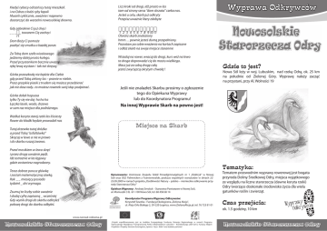 Kiedyś rybacy odrzańscy tutaj mieszkali. iStań na Odrze z łodzi ryby restauracji łapali tyłem do byłej pod gwiazda złotą Musieli cyklicznie, uważnieśw. i napewno I na wprost do kościoła Michała kieruj się piechotą dostarczyć do warzelni nowosolskiej drewno. Przy pomniku św. Jana klęknij na _ _ _ _ _ _ 9 6 Gdy zabraknie Ci już chęci Bo to hołd dla byłego placu św. Floriana _ _ _ _ _ towarem Cię zachęci 11 Gdy Boży starosta solny kościół ufundował Dom Ci pomoże Żadensię warzelnik żałował pozbyć smutku opracy każdejnie porze. 1 Świątynia dumą osady się stała Skieruj się na lewo, przez pasy w kierunku mostu zwodzonego ń tyłemIdź dowzdłuż byłej restauracji pod gwiazda złotą murunie długiego Górka przeszkodą będzie dla kieruj Ciebie się piechotą a wprost do kościoła św. Michała Skręć w prawo, na ulicę wielkiego gdy przed Tobą zielony las kompozytora – prawie w niebie. y pomniku św. Jana klęknij na _ _ _ _ _ _ Przez grząskie piaski z trudem się możesz przedzierać 9 6bankowego Przechodząc obok wejściarowerek domu jak nie dasz rady.. to możesz swój idąc podpierać. okiem na pierwszy herb miasta zwiedzanego to hołdRzuć dla byłego placu św. Floriana Górka hopsasa Dalej dołek nad Tobą _ _ _ _ _ góruje tylko Ty się nie daj 1ha ha ha y starosta solny kościół ufundował Łączka lasek, woda, drzewo Historii Urzędu Solnego wtóruje den warzelnik pracy nie w sam raz miejsce dlażałował podróżnego. iątynia dumą osady się stała Idąc przed siebie w zachodu stronę Wzdłuż koryta las liściasty hlubą Nowej Soli dostarej dziśrzeki pozostała Dojdziesz do miejsca, gdzie dawniej towary były wyłożone Rower do kładki będzie prowadził nas Gdy plac się skończy przejdziesz przez ulicę ając krzyż inapotkasz bliźniacze drzewo Tamdrzewko banku kamienicę Tutaj tutaj dróżka przed Tobąprzez “asfaltówka” eruj sięa na lewo, pasy w kierunku mostu zwodzonego Skręcaj w lewo a nie wdla prawo Gdzie dziś miejsce zarobku Twego wzdłuż muru długiego i do skarbu ruszaj żwawo. ęć w prawo, naodpoczynek ulicę kompozytora Dawniej dla _ _ _wielkiego _ _ _ _ _ _ _ znużonego 7 Pocztowym zwano ten budynek echodząc obok wejścia domu bankowego iZajazdem przez drogę uważnie pędź. Dla ludzi i koni miły odpoczynek Idź ostrożnie w las łęgowy uć okiem na pierwszy herb miasta zwiedzanego gdzie zostaniesz nagrodzony. lej nadTrzymając Tobą _ _się _ kierunku _ _ góruje zachodniego 1 porusz główką Teraz Dojdźdobrze do budynku poczty współczesnego torii Urzędu Solnego wtóruje iZa zostań matematyczną sówką. kamienicę chwilę miniesz balkonów Rok _ _ miesięcy posiada Następnie skręcisz przez swoją lewicę tydzień _ dni wymaga. c przed siebie w zachodu stronę W tę podążaj śmiało towary były wyłożone jdzieszZsumuj douliczkę miejsca, gdzie dawniej te liczby sobie uważnie Masz za sobą drogę prawie już całą y plac się skończy przejdziesz przez ulicę I dodaj cyfrę zapisaną _ wcześniej Kolejny „dom bankowy” miniesz po prawicy Gdy wynik drogi do skarbu odkryłeś m napotkasz banku kamienicę Lecz otwórz wrota następnej połowę drogi do skarbu odbyłeś.kamienicy zie dziś miejsce dla zarobku Twego Znajdziesz tu eksponaty z czasu minionego wniej odpoczynek _ _więc _ _sięgnij _ _po_ niego _ _ www.nomad-reklama.pl _ znużonego Jesteś prawie dla u celu, 7 _ _ _ _ _ _ _ _ _ 2 3 4 5 6 7 8 9 1Odnajdź 2 3 4 5„strażnika”, 6 7 8 9 10co 11 w Muzeum pracuje Otwórz skarb znaleziony On da Ci „klucz” nad którym piecze sprawuje hmm… pewnie jesteś dumą przepełniony. Jednak najpierw zdradź mu szczerzezapisane Pozostaw po sobie wrażenia na kartach Co odgadłeś literamiejsce po literze i odłóż skarb na–swoje starannie Za Tobą dom szefaSoli wioskowego I chlubą Nowej do dziś pozostała jedziemy dalej prosto kolego. Przed przystankiem bacznie uważaj Mijając krzyż i bliźniacze drzewo rękę lewą wystaw i tak też skręcaj. Przed mostkiem w lewo skręć Licz kroki od drogi, idź prosto w las tam od strony serca “dom skrzata” czeka nas. Dobierz litery, hasło z nich powstanie Jesteś u celu, skarb już odkryty Przeczytaj je razem – masz już rozwiązanie Przepisz uważnie litery zdobyte Nowosolskie Starorzecza Odry azdem Pocztowym zwano solnym ten budynekpo Nowej Soli” „Szlakiem Zostawnawrower, księdze po sobie ślad kurs weź na lewo Wsiadaj wracaj do drogi, taBo droga doprowadzi do mostu to pamiątka nacię wiele lat wielkiego. Masz sobą drogęczy całą Czyśjuż Tyzamiejscowy gościem wśród nas jesteś zwycięzcą okrytym chwałą Pamięć o Tobie przetrwa przez! czas Dobierz litery, hasło z nich powstanie Przeczytaj je razem – masz już rozwiązanie _ _ _ _ _ _ _ _ _ Jeśli nie znalazłeś Skarbu prosimy Miejsce na skarb o zgłoszenie tego 1 Jeśli 2 3nie 4 znalazłeś 5do 6Opiekuna 7 8Skarbu 9Wy- prosimy o zgłoszenie prawy lub do Koordynatora Protego do Opiekuna Wyprawy Odnajdź „strażnika”, co w Muzeum pracuje gramu! Na innej Wyprawie Skarb lub do Koordynatora Programu! On dajest! Ci „klucz” nad którym piecze sprawuje na pewno Jednak najpierw zdradź mu szczerze Na innej Wyprawie Skarb na pewno jest! Co odgadłeś – litera po literze Więcej informacji o Wyprawach Zostaw w księdze po sobie ślad Odkrywców w regionie Powiatu Bo to pamiątka na wiele lat Miejsce na Skarb Nowosolskiego można znaleźć Czyś Ty miejscowy czy gościem wśród nas na stronach Pamięć o Tobie przetrwa przez czas www.powiat-nowosolski.pl lub www.WyprawaOdkrywcow.pl Jeśli nie znalazłeś Skarbu prosimy Miejsce na skarb Data ........................ o zgłoszenie tego do Opiekuna Wyprawy lub do Koordynatora ProOpracowanie: gramu! Na Zespołu innej Szkół Wyprawie Skarb Nr 1 “Elektryk” w Nowej Soli, OSZ PalmUczniowie Ponadgimnazjalnych nicken z Furstenwalde oraz pracownicy Muzeum Miejskiego w Nowej Soli w ramach prona pewno jest! jektu 