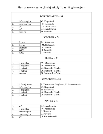 Plan pracy w czasie „Białej szkoły” klas III gimnazjum PONIEDZIAŁEK s. 34 1. 2. 3. 4. 5. informatyka informatyka wf wf historia G. Kopański G. Kopański J. Łuczakowski J. Łuczakowski B. Sawicka WTOREK s. 34 1. 2. 3. 4. 5. fizyka fizyka biologia WOS WOS M. Kołeczek M. Kołeczek E. Bałata J. Sawicki J. Sawicki ŚRODA s. 34 1. 2. 3. 4. 5. j. angielski j. angielski j. polski j. polski chemia W. Marciniak W. Marciniak A. Duma/B. Blacha A. Duma/B. Blacha S. Sędrowska-Zając CZWARTEK s. 34 1. 2. 3. 4. 5. j. fran/j. niem informatyka j. angielski j. polski j. polski I. Tarnowska-Zagórska, E. Łuczakowska G. Kopański E. Szczesiak A. Duma/B. Blacha A. Duma/B. Blacha PIĄTEK s. 34 1. 2. 3. 4. 5. wf j. angielski matematyka matematyka wf J. Łuczakowski W. Marciniak J. Rewera J. Rewera J. Łuczakowski