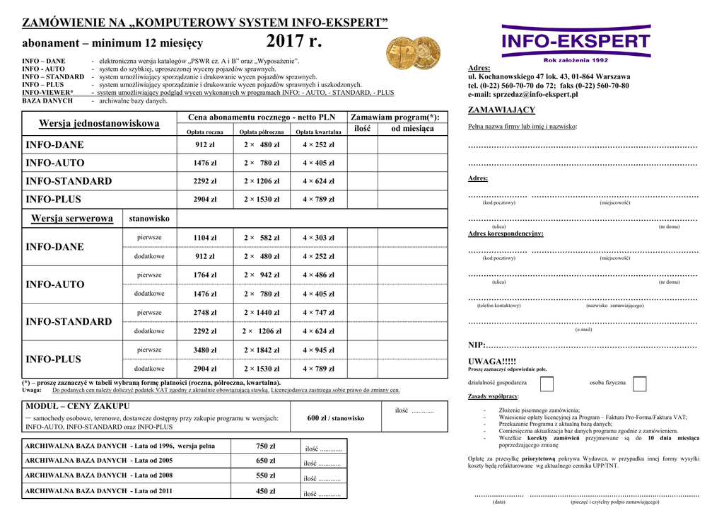 ZAMÓWIENIE NA „KOMPUTEROWY SYSTEM INFO-EKSPERT” abonament – minimum 12 miesięcy INFO – DANE INFO - AUTO INFO – STANDARD INFO – PLUS INFO-VIEWER* BAZA DANYCH - 2017 r. elektroniczna wersja katalogów „PSWR cz. A i B” oraz „Wyposażenie”. system do szybkiej, uproszczonej wyceny pojazdów sprawnych. system umożliwiający sporządzanie i drukowanie wycen pojazdów sprawnych. system umożliwiający sporządzanie i drukowanie wycen pojazdów sprawnych i uszkodzonych. system umożliwiający podgląd wycen wykonanych w programach INFO: - AUTO, - STANDARD, - PLUS archiwalne bazy danych. Wersja jednostanowiskowa Cena abonamentu rocznego - netto PLN Adres: ul. Kochanowskiego 47 lok. 43, 01-864 Warszawa tel. (0-22) 560-70-70 do 72; faks (0-22) 560-70-80 e-mail: [email protected] Zamawiam program(*): ilość od miesiąca ZAMAWIAJĄCY Pełna nazwa firmy lub imię i nazwisko: Opłata roczna Opłata półroczna Opłata kwartalna INFO-DANE 912 zł 2 × 480 zł 4 × 252 zł ......................................................................................... INFO-AUTO 1476 zł 2 × 780 zł 4 × 405 zł ......................................................................................... INFO-STANDARD 2292 zł 2 × 1206 zł 4 × 624 zł Adres: INFO-PLUS 2904 zł 2 × 1530 zł 4 × 789 zł Wersja serwerowa ....................... ................................................................. (miejscowość) (kod pocztowy) ......................................................................................... stanowisko (ulica) pierwsze 1104 zł 2 × 582 zł 4 × 303 zł dodatkowe 912 zł 2 × 480 zł 4 × 252 zł pierwsze 1764 zł 2 × 942 zł 4 × 486 zł INFO-DANE ....................... ................................................................. (miejscowość) (kod pocztowy) ......................................................................................... (ulica) INFO-AUTO dodatkowe 1476 zł 2 × 780 zł 4 × 405 zł pierwsze 2748 zł 2 × 1440 zł 4 × 747 zł dodatkowe 2292 zł 2 × 1206 zł 4 × 624 zł pierwsze 3480 zł 2 × 1842 zł 4 × 945 zł dodatkowe 2904 zł 2 × 1530 zł 4 × 789 zł (nr domu) ......................................................................................... (telefon kontaktowy) (nazwisko zamawiającego) ......................................................................................... INFO-STANDARD INFO-PLUS (e-mail) NIP:.................................................................................. UWAGA!!!!! Proszę zaznaczyć odpowiednie pole. (*) – proszę zaznaczyć w tabeli wybraną formę płatności (roczna, półroczna, kwartalna). Uwaga: (nr domu) Adres korespondencyjny: działalność gospodarcza Do podanych cen należy doliczyć podatek VAT zgodny z aktualnie obowiązującą stawką. Licencjodawca zastrzega sobie prawo do zmiany cen. MODUŁ – CENY ZAKUPU – samochody osobowe, terenowe, dostawcze dostępny przy zakupie programu w wersjach: 600 zł / stanowisko INFO-AUTO, INFO-STANDARD oraz INFO-PLUS ARCHIWALNA BAZA DANYCH - Lata od 1996, wersja pełna 750 zł ilość ............. ARCHIWALNA BAZA DANYCH - Lata od 2005 650 zł ilość ............. ARCHIWALNA BAZA DANYCH - Lata od 2008 550 zł ilość ............. ARCHIWALNA BAZA DANYCH - Lata od 2011 450 zł ilość ............. ilość ............. osoba fizyczna Zasady współpracy: - Złożenie pisemnego zamówienia; Wniesienie opłaty licencyjnej za Program – Faktura Pro-Forma/Faktura VAT; Przekazanie Programu z aktualną bazą danych; Comiesięczna aktualizacja baz danych programu zgodnie z zamówieniem. Wszelkie korekty zamówień przyjmowane są do 10 dnia miesiąca poprzedzającego zmianę Opłatę za przesyłkę priorytetową pokrywa Wydawca, w przypadku innej formy wysyłki koszty będą refakturowane wg aktualnego cennika UPP/TNT. ....................... ............................................................................... (data) (pieczęć i czytelny podpis zamawiającego)