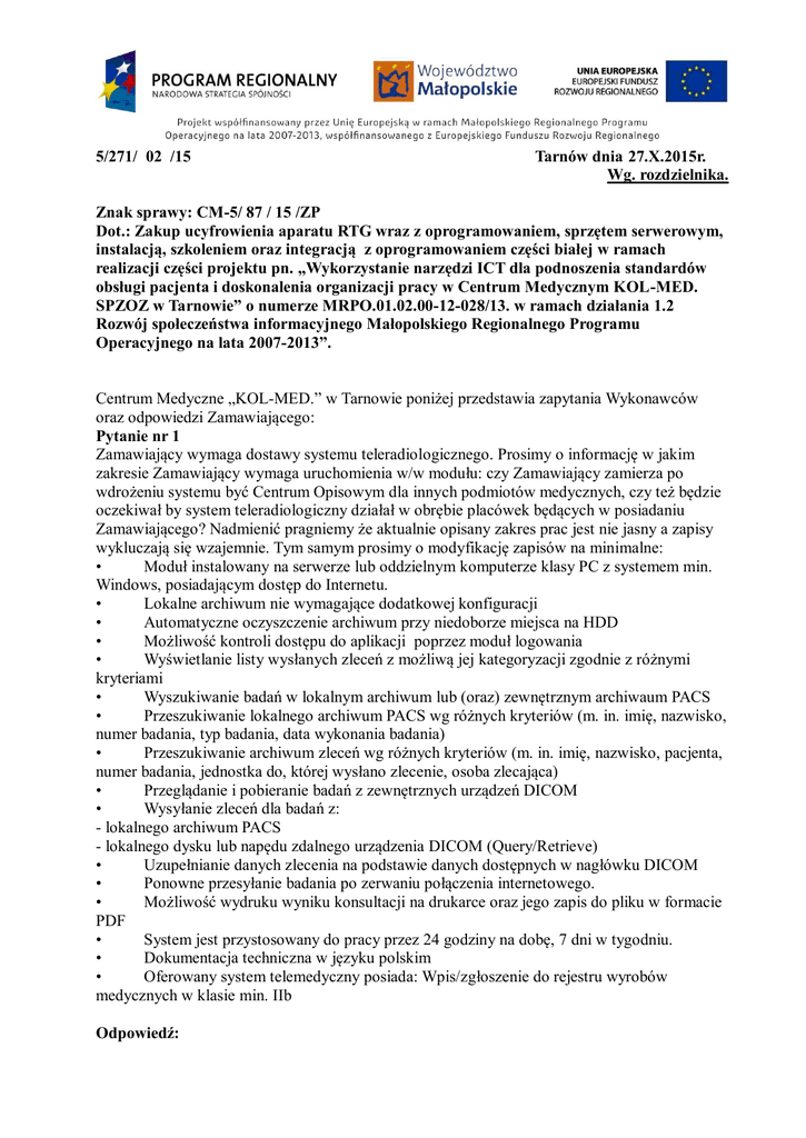 5/271/ 02 /15 Tarnów dnia 27.X.2015r. Wg. rozdzielnika. Znak sprawy: CM-5/ 87 / 15 /ZP Dot.: Zakup ucyfrowienia aparatu RTG wraz z oprogramowaniem, sprzętem serwerowym, instalacją, szkoleniem oraz integracją z oprogramowaniem części białej w ramach realizacji części projektu pn. „Wykorzystanie narzędzi ICT dla podnoszenia standardów obsługi pacjenta i doskonalenia organizacji pracy w Centrum Medycznym KOL-MED. SPZOZ w Tarnowie” o numerze MRPO.01.02.00-12-028/13. w ramach działania 1.2 Rozwój społeczeństwa informacyjnego Małopolskiego Regionalnego Programu Operacyjnego na lata 2007-2013”. Centrum Medyczne „KOL-MED.” w Tarnowie poniżej przedstawia zapytania Wykonawców oraz odpowiedzi Zamawiającego: Pytanie nr 1 Zamawiający wymaga dostawy systemu teleradiologicznego. Prosimy o informację w jakim zakresie Zamawiający wymaga uruchomienia w/w modułu: czy Zamawiający zamierza po wdrożeniu systemu być Centrum Opisowym dla innych podmiotów medycznych, czy też będzie oczekiwał by system teleradiologiczny działał w obrębie placówek będących w posiadaniu Zamawiającego? Nadmienić pragniemy że aktualnie opisany zakres prac jest nie jasny a zapisy wykluczają się wzajemnie. Tym samym prosimy o modyfikację zapisów na minimalne: • Moduł instalowany na serwerze lub oddzielnym komputerze klasy PC z systemem min. Windows, posiadającym dostęp do Internetu. • Lokalne archiwum nie wymagające dodatkowej konfiguracji • Automatyczne oczyszczenie archiwum przy niedoborze miejsca na HDD • Możliwość kontroli dostępu do aplikacji poprzez moduł logowania • Wyświetlanie listy wysłanych zleceń z możliwą jej kategoryzacji zgodnie z różnymi kryteriami • Wyszukiwanie badań w lokalnym archiwum lub (oraz) zewnętrznym archiwaum PACS • Przeszukiwanie lokalnego archiwum PACS wg różnych kryteriów (m. in. imię, nazwisko, numer badania, typ badania, data wykonania badania) • Przeszukiwanie archiwum zleceń wg różnych kryteriów (m. in. imię, nazwisko, pacjenta, numer badania, jednostka do, której wysłano zlecenie, osoba zlecająca) • Przeglądanie i pobieranie badań z zewnętrznych urządzeń DICOM • Wysyłanie zleceń dla badań z: - lokalnego archiwum PACS - lokalnego dysku lub napędu zdalnego urządzenia DICOM (Query/Retrieve) • Uzupełnianie danych zlecenia na podstawie danych dostępnych w nagłówku DICOM • Ponowne przesyłanie badania po zerwaniu połączenia internetowego. • Możliwość wydruku wyniku konsultacji na drukarce oraz jego zapis do pliku w formacie PDF • System jest przystosowany do pracy przez 24 godziny na dobę, 7 dni w tygodniu. • Dokumentacja techniczna w języku polskim • Oferowany system telemedyczny posiada: Wpis/zgłoszenie do rejestru wyrobów medycznych w klasie min. IIb Odpowiedź: Zapisy SIWZ pozostają bez zmian. Zamawiający zamierza po wdrożeniu systemu mieć możliwość opisywania badań również dla innych podmiotów medycznych. Pytanie nr 2 pkt. 108 Czy Zamawiający dopuści rozwiązanie bez opcji nadzoru nad postępem prac związanych z opisem badania. W/w funkcjonalność jest bezzasadna. Opis wykonywany przez lekarza radiologa w systemie teleradiologiczym jest natychmiastowy i nie wymaga nadzoru. Odpowiedź: Zapisy SIWZ pozostają bez zmian. Zamawiający wymaga, aby lekarz radiolog miał możliwość przerwania wykonywania opisu badania w sytuacji awaryjnej. Pytanie nr 3 pkt. 113 Czy Zamawiający zrezygnuje z opcji dodawania odebranego opisu w formie obrazu opisanego badania? Odpowiedź: Zapisy SIWZ pozostają bez zmian. Zamawiający wymaga, aby opis badania zapisany był w systemie jako obraz celem dodatkowej archiwizacji. Daje to również możliwość podejrzenia opisu badania na stacjach przeglądowych systemu PACS. Pytanie nr 4 pkt. 136 Czy Zamawiający dopuści rozwiązanie bez opcji centralnego przechowywania ustawień wyglądu dla poszczególnych profili? Odpowiedź: Zapisy SIWZ pozostają bez zmian. Opcja centralnego przechowywania ustawień wyglądu dla poszczególnych profili jest wygodnym narzędziem zarządczym dla administratora systemu szczególnie w sytuacji, kiedy stacja diagnostyczna i stacje przeglądowe są licencjonowane na zasadach licencji pływających (ilość jednocześnie pracujących stanowisk). Pytanie nr 5 Czy Zamawiający będzie wymagał by oprogramowanie systemu archiwizacji i dystrybucji obrazów diagnostycznych posiadały wpis/zgłoszenie do wyrobów medycznych w klasie min. IIb oraz posiadały wpis do certyfikacji IHE z potwierdzeniem na stronie internetowej? Uzasadnienie: W/w certyfikacja zapewnia iż oferowany system PACS/WEB jest produktem medycznym spełnia najwyższe normy stawiane przed w/w modułami oraz jest w pełni kompatybilny z certyfikacją produktów w zakresie ucyfrowienia CR dla aparatów diagnostycznych. Odpowiedź: Zapisy SIWZ pozostają bez zmian. Pragniemy zauważyć, że Zamawiający w punkcie 141 SIWZ wymaga, aby system archiwizacji i dystrybucji obrazów był zarejestrowany jako produkt medyczny w klasie IIb. Co więcej Zamawiający w punkcie 142 SIWZ opcjonalnie punktuje system archiwizacji i dystrybucji obrazów o komunikatywności potwierdzonej certyfikatem IHE. Pytanie nr 6 pkt. 236 Czy Zamawiający dopuści rozwiązanie bez opcji narzędzia do pomiarów miednicy oraz pomiarów skoliozy metodą czteropunktową (VCM)? Uzasadnienie: Wymagane funkcjonalności wydają się nadmiarowe i stanowią ograniczenie konkurencyjności rozwiązań w zakresie oprogramowania diagnostycznego. Odpowiedź: Zapisy SIWZ pozostają bez zmian. Powyższe funkcjonalności są dla Zamawiającego istotne i nie stanowią ograniczenia konkurencyjności, ponieważ są dostępne w wielu rozwiązaniach dostępnych na rynku. Pytanie nr 7 pkt. 237 Czy Zamawiający zrezygnuje z wymogu dostarczenia oprogramowania z funkcją wywoływania zewnętrznej aplikacji z przekazaniem danych pacjenta i obrazów? Uzasadnienie: Wymagane funkcjonalności wydaj