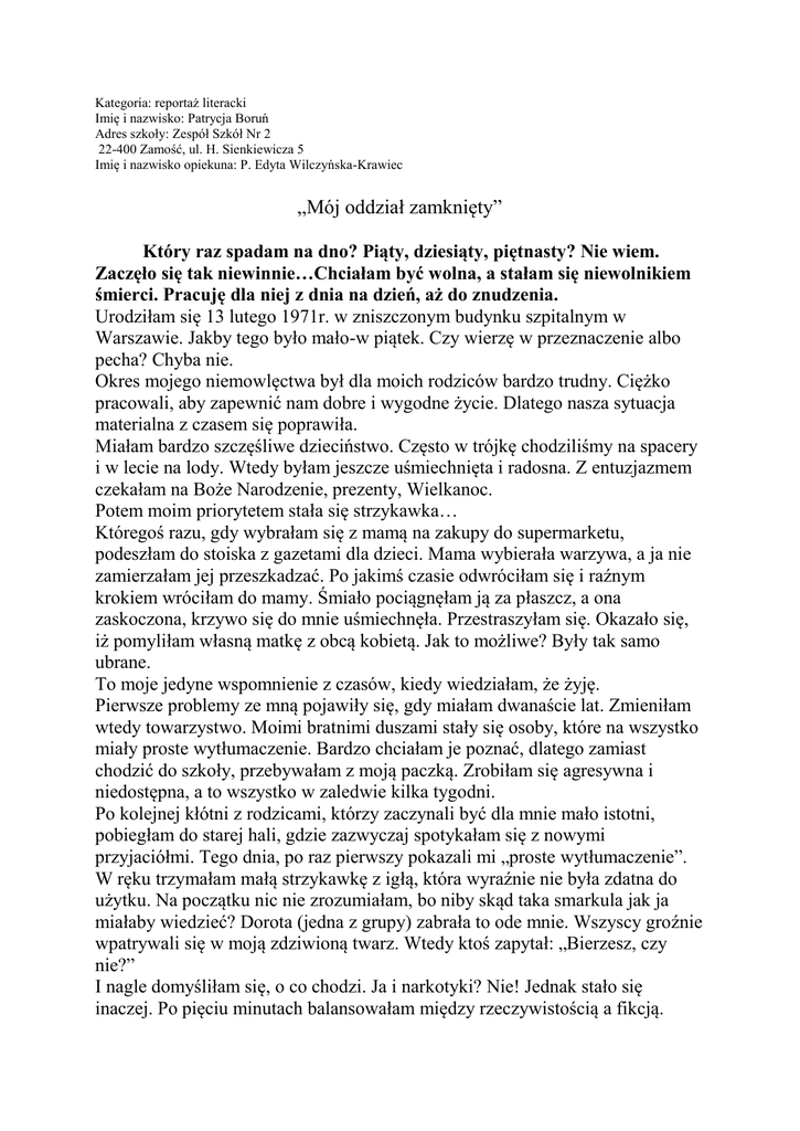 Kategoria: reportaż literacki Imię i nazwisko: Patrycja Boruń Adres szkoły: Zespół Szkół Nr 2 22-400 Zamość, ul. H. Sienkiewicza 5 Imię i nazwisko opiekuna: P. Edyta Wilczyńska-Krawiec „Mój oddział zamknięty” Który raz spadam na dno? Piąty, dziesiąty, piętnasty? Nie wiem. Zaczęło się tak niewinnie…Chciałam być wolna, a stałam się niewolnikiem śmierci. Pracuję dla niej z dnia na dzień, aż do znudzenia. Urodziłam się 13 lutego 1971r. w zniszczonym budynku szpitalnym w Warszawie. Jakby tego było mało-w piątek. Czy wierzę w przeznaczenie albo pecha? Chyba nie. Okres mojego niemowlęctwa był dla moich rodziców bardzo trudny. Ciężko pracowali, aby zapewnić nam dobre i wygodne życie. Dlatego nasza sytuacja materialna z czasem się poprawiła. Miałam bardzo szczęśliwe dzieciństwo. Często w trójkę chodziliśmy na spacery i w lecie na lody. Wtedy byłam jeszcze uśmiechnięta i radosna. Z entuzjazmem czekałam na Boże Narodzenie, prezenty, Wielkanoc. Potem moim priorytetem stała się strzykawka… Któregoś razu, gdy wybrałam się z mamą na zakupy do supermarketu, podeszłam do stoiska z gazetami dla dzieci. Mama wybierała warzywa, a ja nie zamierzałam jej przeszkadzać. Po jakimś czasie odwróciłam się i raźnym krokiem wróciłam do mamy. Śmiało pociągnęłam ją za płaszcz, a ona zaskoczona, krzywo się do mnie uśmiechnęła. Przestraszyłam się. Okazało się, iż pomyliłam własną matkę z obcą kobietą. Jak to możliwe? Były tak samo ubrane. To moje jedyne wspomnienie z czasów, kiedy wiedziałam, że żyję. Pierwsze problemy ze mną pojawiły się, gdy miałam dwanaście lat. Zmieniłam wtedy towarzystwo. Moimi bratnimi duszami stały się osoby, które na wszystko miały proste wytłumaczenie. Bardzo chciałam je poznać, dlatego zamiast chodzić do szkoły, przebywałam z moją paczką. Zrobiłam się agresywna i niedostępna, a to wszystko w zaledwie kilka tygodni. Po kolejnej kłótni z rodzicami, którzy zaczynali być dla mnie mało istotni, pobiegłam do starej hali, gdzie zazwyczaj spotykałam się z nowymi przyjaciółmi. Tego dnia, po raz pierwszy pokazali mi „proste wytłumaczenie”. W ręku trzymałam małą strzykawkę z igłą, która wyraźnie nie była zdatna do użytku. Na początku nic nie zrozumiałam, bo niby skąd taka smarkula jak ja miałaby wiedzieć? Dorota (jedna z grupy) zabrała to ode mnie. Wszyscy groźnie wpatrywali się w moją zdziwioną twarz. Wtedy ktoś zapytał: „Bierzesz, czy nie?” I nagle domyśliłam się, o co chodzi. Ja i narkotyki? Nie! Jednak stało się inaczej. Po pięciu minutach balansowałam między rzeczywistością a fikcją. Oczy przysłaniała mi delikatna mgła, która potęgowała ten efekt. Ręce miałam zadziwiająco lekkie, a umysł…wolny. Morfina. Nie pamiętałam jak wróciłam do domu. Nie obchodziło mnie to. W szkole szło mi coraz gorzej, ale co tam. Kto by się przejmował szkołą? Teraz prawie codziennie chodziłam do hali, która w moim mniemaniu stała się domem dla zagubionych dusz. Dla mnie. Wzywało mnie to miejsce. Mówiło: „Chodź, zażyj swoje lekarstwo”, a ja posłusznie to robiłam. Trwało to kilka miesięcy. Pewnego dnia, idąc ulicą, na chwilę zatrzymałam się na chodniku i zamknęłam oczy. W mojej głowie od razu pojawiły się niepokojące myśli. Nie wiedziałam przez moment, kim jestem i co się ze mną dzieje. Wariuję? Ależ skąd! To lekarstwo przestało działać. Straciłam kilka kilogramów i musiałam dorabiać dziurki w paskach od spodni. Wyraźnie odcinały mi się żebra i obojczyk na tle jasnej skóry. Znacznie spadła moja kondycja. Po wejściu na trzecie piętro w bloku mojej ciotki, łapałam zadyszkę. Były momenty, kiedy mdlałam, a moją głowę coś ciągnęło w dół jakby wypełniała ją tona ołowiu. Poza tym moje długie i lśniące włosy straciły dotychczasowy wigor. Byłam taka szara. Wszystko to za chwilę przyjemności… Kiedy morfina przestawała działać, nie byłam w stanie jeść, spać, myśleć, chodzić. Zastrzyku nikt nie robił mi za darmo. Szczególnie, gdy moje dawki niemal się potroiły. Byłam zmuszana podkradać rodzicom pieniądze albo kraść w sklepach, a następnie to sprzedawać. Co dziwniejsze ani mama, ani tato nie wydawali się sprawiać wrażenia osób, które cokolwiek podejrzewają. Chyba tłumaczyli sobie moje zachowanie „buntem nastolatków”. Tylko, czy gdyby mieli pojęcie, że biorę, pomogliby mi? Pewnie tak. W moim życiu jest bardzo dużo wątpliwości. Zdaje się, że wszystko to fikcja, ja również… W dniu czternastych urodzin, wybrałam się do księgarni. Kochałam czytać. Poświęcałam temu mnóstwo czasu. Cieszyłam się z tego. Książki były mną. Oddychały, miały duszę. Poza tym pięknie pachniały. Zastrzyk zrobiłam sobie przed wyjściem, więc dopisywał mi dobry humor. Po zakupie kilku opasłych tomów o dziewczynie z mocami nie z tego świata, udałam się do wyjścia. Otwierając drzwi poczułam na twarzy delikatne, niewinne płatki śniegu. Przez moment żałowałam, tego w jaki sposób kieruję własnym życiem. Wezbrała we mnie mała iskierka nadziei, która przy odpowiedniej motywacji, mogłaby zamienić się w wielki, przyjazny memu sercu ogień. Ale tak się nie stało. Jeszcze nie… Postanowiłam zrobić sobie prywatny odwyk. Wierzyłam, że mi się uda. Zaczęłam od następnego dnia, czyli soboty. Wstałam, wzięłam prysznic i zjadłam skromne śniadanie. Później chciałam poczytać. Nawet nieźle mi szło, kiedy w mojej głowie rozbrzmiał głos: „Chodź i zażyj swoje lekarstwo”. Na chwilę świat zawirował, a ja poczułam nie odpartą chęć ulżenia sobie. Zrobiłam to. Znowu. Spadałam na dno. Wzięłam za dużo i straciłam przytomność. Z tego, co opowiedzieli mi rodzice dowiedziałam się, że znaleźli mnie w pokoju na łóżku. Leżałam bezwładnie ze zwisającą strzykawką w zgięciu łokci