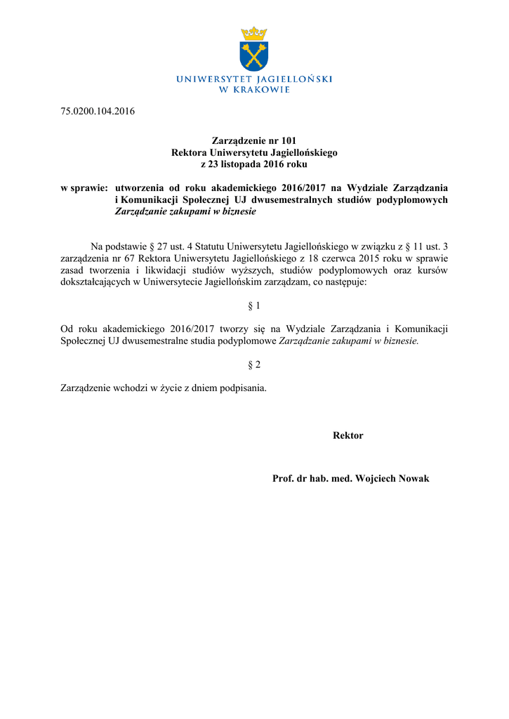 75.0200.104.2016 Zarządzenie nr 101 Rektora Uniwersytetu Jagiellońskiego z 23 listopada 2016 roku w sprawie: utworzenia od roku akademickiego 2016/2017 na Wydziale Zarządzania i Komunikacji Społecznej UJ dwusemestralnych studiów podyplomowych Zarządzanie zakupami w biznesie Na podstawie § 27 ust. 4 Statutu Uniwersytetu Jagiellońskiego w związku z § 11 ust. 3 zarządzenia nr 67 Rektora Uniwersytetu Jagiellońskiego z 18 czerwca 2015 roku w sprawie zasad tworzenia i likwidacji studiów wyższych, studiów podyplomowych oraz kursów dokształcających w Uniwersytecie Jagiellońskim zarządzam, co następuje: §1 Od roku akademickiego 2016/2017 tworzy się na Wydziale Zarządzania i Komunikacji Społecznej UJ dwusemestralne studia podyplomowe Zarządzanie zakupami w biznesie. §2 Zarządzenie wchodzi w życie z dniem podpisania. Rektor Prof. dr hab. med. Wojciech Nowak