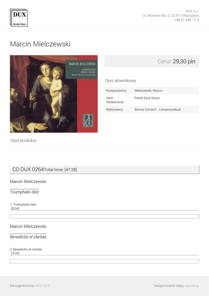 DUX S.J. Ul. Morskie Oko 2, 02-511 Warszawa +48 22 849 11 3 Marcin Mielczewski Cena: 29,30 pln Opis słownikowy Kompozytorzy Mielczewski, Marcin ∎ Serie Wydawnicze Polish Early Music Wykonawcy Bornus Consort ∎, Linnamuusikud ∎ Opis produktu CD DUX 0264Total time: [47:28] Marcin Mielczewski Triumphalis dies 1. Triumphalis dies [5:04] Marcin Mielczewski Benedictio et claritas 2. Benedictio et claritas [3:24] Plik wygenerowano: 08-03-2017 Oprogramowanie sklepu: AptusShop DUX S.J. Ul. Morskie Oko 2, 02-511 Warszawa +48 22 849 11 3 Marcin Mielczewski Deus in nomine tuo 3. Deus in nomine tuo [4:54] Marcin Mielczewski Veni Domine 4. Veni Domine [4:04] Marcin Mielczewski Canzona terza a 3 5. Canzona terza a 3 [3:07] Marcin Mielczewski Vesperae dominicales 6. Antyfona – Dixit Dominus Psalm 110 – Dixit Dominus [4:11] 7. Antyfona – Magna opera Domini Psalm 111 – Confitebor [6:21] 8. Antyfona – Qui timet Dominum Psalm 113 – Beatus vir [4:56] 9. Antyfona – Sit nomen DominiPsalm 114 – Laudate pueri [5:19] 10. Antyfona – Regali ex progenie Maria Magnificat [5:35] Plik wygenerowano: 08-03-2017 Oprogramowanie sklepu: AptusShop DUX S.J. Ul. Morskie Oko 2, 02-511 Warszawa +48 22 849 11 3 Wykonawcy: Bornus Consort Linnamuusikud Plik wygenerowano: 08-03-2017 Powered by TCPDF (www.tcpdf.org) Oprogramowanie sklepu: AptusShop