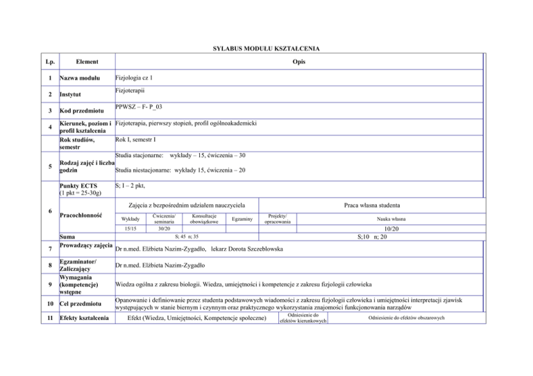 SYLABUS MODUŁU KSZTAŁCENIA Lp. Element 1 Nazwa modułu 2 Instytut 3 Kod przedmiotu 4 5 Opis Fizjologia cz 1 Fizjoterapii PPWSZ – F- P_03 Kierunek, poziom i Fizjoterapia, pierwszy stopień, profil ogólnoakademicki profil kształcenia Rok I, semestr I Rok studiów, semestr Studia stacjonarne: wykłady – 15, ćwiczenia – 30 Rodzaj zajęć i liczba Studia niestacjonarne: wykłady 15, ćwiczenia – 20 godzin Punkty ECTS (1 pkt = 25-30g) S; I – 2 pkt, Zajęcia z bezpośrednim udziałem nauczyciela 6 Pracochłonność Wykłady 15/15 7 8 9 Suma Prowadzący zajęcia Egzaminator/ Zaliczający Wymagania (kompetencje) wstępne 10 Cel przedmiotu 11 Efekty kształcenia Ćwiczenia/ seminaria 30/20 Konsultacje obowiązkowe Egzaminy Praca własna studenta Projekty/ opracowania Nauka własna 10/20 S;10 n; 20 S; 45 n; 35 Dr n.med. Elżbieta Nazim-Zygadło, lekarz Dorota Szczeblowska Dr n.med. Elżbieta Nazim-Zygadło Wiedza ogólna z zakresu biologii. Wiedza, umiejętności i kompetencje z zakresu fizjologii człowieka Opanowanie i definiowanie przez studenta podstawowych wiadomości z zakresu fizjologii człowieka i umiejętności interpretacji zjawisk występujących w stanie biernym i czynnym oraz praktycznego wykorzystania znajomości funkcjonowania narządów Efekt (Wiedza, Umiejętności, Kompetencje społeczne) Odniesienie do efektów kierunkowych Odniesienie do efektów obszarowych W dziedzinie wiedzy Posiada wiedzę z zakresu fizjologii człowieka K_W01 Ma wiedzę z zakresu budowy ciała ludzkiego, zna i rozumie K_W02 jego funkcjonowanie w warunkach zdrowia Ma wiedzę w zakresie umacniania zdrowia jednostki i rozumie konieczność kształtowania pozytywnych postaw zdrowotnych Zna zakres reakcji adaptujących do zmian w środowisku zewnętrznym Ma wiedzę pozwalającą ocenić reakcje fizjologiczne w stanie czynnym M1_W01 M1_W02 M1_W03 M1 W05 W dziedzinie umiejętności Potrafi zróżnicować topografię narządów i układów oraz ocenić ich współzależności Potrafi praktycznie wykorzystać znajomość funkcjonowania narządów i układów Posiada wiedzę pozwalającą odróżnić reakcje fizjologiczne od zaburzeń chorobowych Potrafi objaśnić funkcjonowanie aparatu ruchu w warunkach zdrowia Zna podstawowe testy czynnościowe niezbędne dla oceny funkcjonowania narządów i układów M1 U08 W dziedzinie kompetencji społecznych Potrafi brać odpowiedzialność za pracę własną Rozumie potrzebę kształcenia permanentnego M1 K07 M1 U08 M1 K01 Jest odpowiedzialny za swoje postępowanie widząc związek między stylem życia a zdrowiem Forma i warunki 12 potwierdzenia efektu kształcenia Efekt kształcenia M1 K08 Sposób potwierdzenia (weryfikacji) wiedza Sprawdzian pisemny, sprawdzian ustny, test pisemny-jednokrotnego wyboru lub pytaniami otwartymi umiejętności Sprawdzian praktyczny poznanych badań czynnościowych kompetencje społeczne Obserwacja postawy studenta na zajęciach, samoocena studenta Wykłady 1. Chemiczne i fizykochemiczne prawa występujące podczas funkcjonowania ustroju. Zasadnicze cechy żywych organizmów. Homeostaza. 2. Budowa i funkcjonowanie komórki. Śmierć komórki 3. Transport przezbłonowy. Bilans energetyczny komórki. Oddychanie wewnętrzne. 4. Podział czynności ciała ludzkiego. Rola układu szkieletowego dla całego ustroju. 5. Fizjologia mięśni. Sposoby badania wydolności mięśni. 6. Zadania układu krążenia. Znaczenie oddychania dla całego ustroju. 7. Fizjologia trawienia pokarmów. Przemiana materii, regulacja ciepłoty ciała. 8. Prawidłowe współdziałanie układu wewnętrznego wydzielania. Treści merytoryczne 9. Funkcjonowanie układu wydalniczego 13 przedmiotu Ćwiczenia 1. Organizacja układu nerwowego, funkcjonowanie nerwu, synapsa nerwowa, łuk odruchowy, odruchy. 2. Autonomiczny układ nerwowy. Podstawy doznań zmysłowy -narząd równowagi, narządy zmysłów. 3. Wyższe czynności nerwowe. 4. Układ mięśniowy- komórka mięśniowa, fizjologia skurczu mięśni, jednostki ruchowe ich cechy i czynność, przystosowanie mięśni do różnych aktywności, elektromiogram. 5. Wpływ wysiłku fizycznego na mięśnie szkieletowe, zmiany adaptacyjne w mięśniach w trakcie treningu siłowego i wytrzymałościowego. 6. Właściwości fizyczne krwi-skład i funkcje krwi, cechy osocza, krzepnięcie krwi i fibrynoliza 7. Fizjologia serca- struktura i czynność mięśnia sercowego, układ przewodzący, cykl pracy serca, regulacja czynności, 14 Wykaz literatury podstawowej Wykaz literatury 15 uzupełniającej (pomocniczej) elektrokardiogram. 8. Układ krążenia- dystrybucja krwi w układzie sercowo-naczyniowym, humoralna i nerwowa regulacja krążenia, specyfika krążenia wieńcowego, mózgowego i nerkowego, wpływ wysiłku fizycznego na czynność układu krążenia. 9. Fizjologia układu oddechowego- mechanika oddychania, proces wymiany gazowej, regulacja nerwowa i chemiczna oddychania, metody badania czynności układu oddechowego, znaczenie oddychania dla fizjologii wysiłku fizycznego. 10. Fizjologia trawienie pokarmów- motoryka przewodu pokarmowego, czynności gruczołów trawiennych, proces wchłaniania, regulacja trawienia. Metabolizm i przemiana materii. 11. Funkcjonowanie układu moczowego- budowa nefronu, czynność nerek i powstawanie moczu, regulacja czynności nerek. Gospodarka wodno-elektrolitowa. 12. Układ wydzielania wewnętrznego- hormony układu dokrewnego, regulacja hormonalna organizmu, współzależność gruczołów wewnętrznego wydzielania. Układ rozrodczy. 13. Klasyfikacja wysiłków fizycznych- wydolność fizyczna a wiek i płeć, zaopatrzenie ustroju w tlen w trakcie wysiłków, deficyt i dług tlenowy, równowaga czynnościowa układu krążenia 14. Trening fizyczny jako proces doskonalenia wydolności fizycznej- fizjologiczna adaptacja organizmu do wysiłku fizycznego, skutki treningu wysokogórskiego, objawy przetrenowania, znaczenia systematycznej aktywności fizycznej w zapobieganiu zaburzeniom