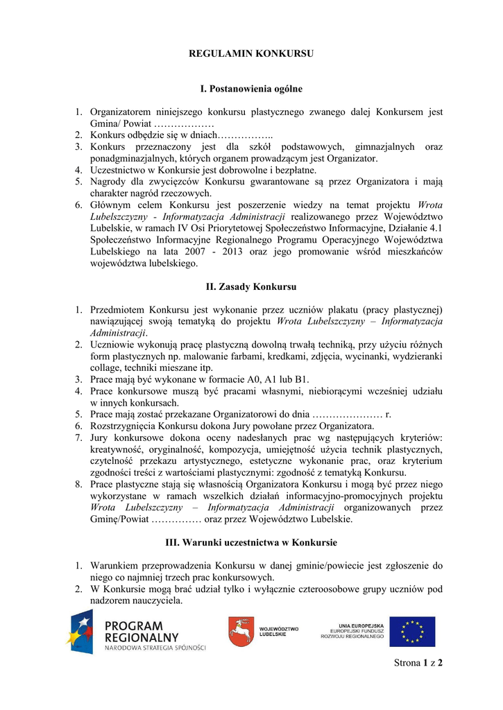 REGULAMIN KONKURSU I. Postanowienia ogólne 1. Organizatorem niniejszego konkursu plastycznego zwanego dalej Konkursem jest Gmina/ Powiat ……………… 2. Konkurs odbędzie się w dniach…………….. 3. Konkurs przeznaczony jest dla szkół podstawowych, gimnazjalnych oraz ponadgminazjalnych, których organem prowadzącym jest Organizator. 4. Uczestnictwo w Konkursie jest dobrowolne i bezpłatne. 5. Nagrody dla zwycięzców Konkursu gwarantowane są przez Organizatora i mają charakter nagród rzeczowych. 6. Głównym celem Konkursu jest poszerzenie wiedzy na temat projektu Wrota Lubelszczyzny - Informatyzacja Administracji realizowanego przez Województwo Lubelskie, w ramach IV Osi Priorytetowej Społeczeństwo Informacyjne, Działanie 4.1 Społeczeństwo Informacyjne Regionalnego Programu Operacyjnego Województwa Lubelskiego na lata 2007 - 2013 oraz jego promowanie wśród mieszkańców województwa lubelskiego. II. Zasady Konkursu 1. Przedmiotem Konkursu jest wykonanie przez uczniów plakatu (pracy plastycznej) nawiązującej swoją tematyką do projektu Wrota Lubelszczyzny – Informatyzacja Administracji. 2. Uczniowie wykonują pracę plastyczną dowolną trwałą techniką, przy użyciu różnych form plastycznych np. malowanie farbami, kredkami, zdjęcia, wycinanki, wydzieranki collage, techniki mieszane itp. 3. Prace mają być wykonane w formacie A0, A1 lub B1. 4. Prace konkursowe muszą być pracami własnymi, niebiorącymi wcześniej udziału w innych konkursach. 5. Prace mają zostać przekazane Organizatorowi do dnia ………………… r. 6. Rozstrzygnięcia Konkursu dokona Jury powołane przez Organizatora. 7. Jury konkursowe dokona oceny nadesłanych prac wg następujących kryteriów: kreatywność, oryginalność, kompozycja, umiejętność użycia technik plastycznych, czytelność przekazu artystycznego, estetyczne wykonanie prac, oraz kryterium zgodności treści z wartościami plastycznymi: zgodność z tematyką Konkursu. 8. Prace plastyczne stają się własnością Organizatora Konkursu i mogą być przez niego wykorzystane w ramach wszelkich działań informacyjno-promocyjnych projektu Wrota Lubelszczyzny – Informatyzacja Administracji organizowanych przez Gminę/Powiat …………… oraz przez Województwo Lubelskie. III. Warunki uczestnictwa w Konkursie 1. Warunkiem przeprowadzenia Konkursu w danej gminie/powiecie jest zgłoszenie do niego co najmniej trzech prac konkursowych. 2. W Konkursie mogą brać udział tylko i wyłącznie czteroosobowe grupy uczniów pod nadzorem nauczyciela. Strona 1 z 2 3. Warunkiem uczestnictwa w Konkursie jest: 1) dokonanie zgłoszenia udziału w Konkursie poprzez prawidłowe wypełnienie formularza zgłoszeniowego, znajdującego się na stronie internetowej www.wrotalubelszczyzny.eu i wysłanie go na adres e-mail. ……………………… do dnia ………………… r. Zgłoszenia niekompletne nie będą rozpatrywane, 2) pisemna zgoda pełnoprawnych opiekunów autorów prac plastycznych na przetwarzanie danych osobowych i przeniesienie autorskich praw majątkowych do prac zgodnie z pkt II.8, 3) zapoznanie się z treścią niniejszego Regulaminu. 4. Prace konkursowe mogą być zgłaszane przez szkoły w imieniu autorów, ze wskazaniem nauczyciela nadzorującego pracę oraz autorów pracy. 5. Prace konkursowe nie mogą być wykonywane przez osoby dorosłe i nauczycieli. IV. Nagrody 1. Nagrodami w Konkursie są: 1) cyfrowa ramka 10” – dla szkoły, która zgłosiła zwycięską pracę, 2) skórzana aktówka – dla nauczyciela nadzorującego, 3) pamięć zewnętrzna 16GB, długopis metalowy oraz podkładka pod mysz – dla każdego autora zwycięskiej pracy. 2. Nagrody są współfinansowane ze środków Unii Europejskiej w ramach projektu Wrota Lubelszczyzny – Informatyzacja Administracji realizowanego z Regionalnego Programu Operacyjnego Województwa Lubelskiego na lata 2007 – 2013, Oś Priorytetowa IV, Działanie 4.1 Społeczeństwo Informacyjne. 3. Zgodnie z art. 30 ust. 1, pkt 2, w związku z art. 21 ust. 1 pkt 68 ustawy z dnia 26 lipca 1991 r. o podatku dochodowym od osób fizycznych (Dz. U. z 2010 r. Nr 51, poz. 307, z późn. zm.) w przypadku dochodu z tytułu wygranej w Konkursie z dziedziny kultury i sztuki, w których jednorazowa wartość nie przekracza kwoty 760 złotych, zwycięzca zwolniony jest z obowiązku opłacenia podatku dochodowego w wysokości 10% wartości wygranej nagrody. 4. Organizator zobowiązany jest do poinformowania zwycięzcy o fakcie przekroczenia wartości, o której mowa w ust. 3. 5. Organizator przekaże do Biura Projektu Wrota Lubelszczyzny – Informatyzacja Administracji listę zwycięzców wraz z nagrodami im przyznanymi oraz dokumentację fotograficzną z przekazania nagród. V. Postanowienia końcowe 1. Aktualna treść oraz wszystkie ewentualne zmiany w regulaminie będą ogłaszane na stronie internetowej www.wrotalubelszczyzny.eu. 2. Przystąpienie do udziału w Konkursie jest równoznaczne z przyjęciem warunków niniejszego regulaminu. 3. W sprawach nieuregulowanych niniejszym regulaminem zastosowanie mają odpowiednie przepisy Kodeksu Cywilnego. Strona 2 z 2