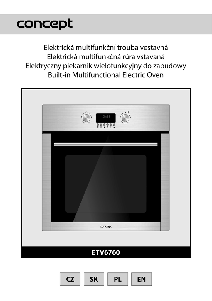Elektrická multifunkční trouba vestavná Elektrická multifunkčná rúra vstavaná Elektryczny piekarnik wielofunkcyjny do zabudowy Built-in Multifunctional Electric Oven ETV6760 CZ SK PL EN CZ PODĚKOVÁNÍ Děkujeme Vám, že jste si zakoupili výrobek značky Concept a přejeme Vám, abyste byli s naším výrobkem spokojeni po celou dobu jeho používání. Před prvním použitím prostudujte pozorně celý návod k obsluze a potom si jej uschovejte. Zajistěte, aby i ostatní osoby, které budou s výrobkem manipulovat, byly seznámeny s tímto návodem. OBSAH Technické parametry Důležitá upozornění Popis výrobku Teleskopické výsuvy Popis ovládacího panelu Návod k obsluze Základní funkce spotřebiče Jednotlivé funkce pečení Orientační teploty, zásuvné výšky a časy pečení Tipy k pečení Pokročilé funkce spotřebiče Čištění a údržba Instalace spotřebiče Servis Ochrana životního prostředí 1 2 3 4 5 5 5 6 7 7 9 10 10 12 12 Technické parametry Napětí 230 V ~ 50 Hz Max. příkon 3350 W Příkon horního topného tělesa 1300 W Příkon dolního topného tělesa 1300 W Přikon kruhového tělesa 2000 W Příkon grilovacího tělesa 3200 W Rozsah nastavení teploty Rozměry pro instalaci (š x h x v) 0 – 250 °C 560 x 560 x 590 mm Vnější rozměry (š x h x v) 595 x 585 x 590 mm Vnitřní rozměry (š x h x v) 450 x 345 x 420 mm Vnitřní objem 66 l Hmotnost 45 kg Hlučnost < 63 dB(A) ETV6760 1 CZ DŮLEŽITÁ UPOZORNĚNÍ: Při dodání elektrické trouby • Ihned po dodání zkontrolujte obal a spotřebič, zda nevznikly škody při přepravě. • POZOR! Některé rohy a hrany spotřebiče, které budou po instalaci skryté, mohou být ostré! Dbejte opatrnosti, abyste zabránili poranění! • Pokud je spotřebič poškozen, nezprovozňujte ho. Co nejdříve se spojte s dodavatelem. • Před prvním použitím odstraňte ze spotřebiče všechny obaly a marketingové materiály. • Obalový materiál řádně zlikvidujte. Při instalaci • Nepoužívejte spotřebič jinak, než je popsáno v tomto návodu. • Spotřebič užívejte jen v domácnosti a pouze k pečení pokrmů. • Nepoužívejte spotřebič, jste-li bosí. • Do vnitřního prostoru spotřebiče nevkládejte nadměrně velké potraviny nebo kovové předměty. Mohly byzpůsobit požár. • Nesedejte si a nestoupejte na otevřená dvířka spotřebiče. • Osoby se sníženou pohybovou schopností, se sníženým smyslovým vnímáním, s nedostatečnou duševní způsobilostí nebo osoby neseznámené s obsluhou musí používat spotřebič jen pod dozorem zodpovědné seznámené osoby. • POZOR! Při otevírání dvířek se může uvolnit velké množství páry nebo může vystříknout omastek. Dbejte opatrnosti. Nebezpečí opaření! • Nedotýkejte se horkých povrchů a topných těles během použití nebo krátce po použití spotřebiče. • Ve vnitřním prostoru spotřebiče nic neskladujte. • Nesahejte na spotřebič vlhkýma nebo mokrýma rukama. • V případě poruchy vypněte spotřebič a vytáhněte zástrčku ze zásuvky elektrického napětí. • Při vypojování spotřebiče ze zásuvky elektrického napětí nikdy netahejte za přívodní kabel, ale uchopte zástrčku a tahem ji vypojte. • Pravidelně kontrolujte spotřebič i přívodní kabel z důvodu poškození. Nezapínejte poškozený spotřebič. • Nepoužívejte spotřebič, pokud jsou dvířka nebo těsnění dvířek poškozené. Nechte je opravit v autorizovaném servisu. • Neponořujte přívodní kabel nebo zástrčku do vody ani do jiné kapaliny. • Není-li spotřebič v provozu, dbejte na to, aby byly všechny jeho ovládací prvky ve vypnuté poloze. • Je-li spotřebič v provozu, nenechávejte dvířka skříněk nad ním otevřená, mohou se poškodit uvolněnou párou a teplem, např. při otevření dvířek. • Nepoužívejte příslušenství, které má poškozenou povrchovou úpravu, je opotřebované, případně má jiné defekty. Jsou-li v domácnosti děti • Nedovolte dětem a nesvéprávným osobám se spotřebičem manipulovat, používejte ho mimo jejich dosahu. • Osoby se sníženou pohybovou schopností, se sníženým smyslovým vnímáním, s nedostatečnou duševní způsobilostí nebo osoby neseznámené s obsluhou musí používat spotřebič jen pod dozorem zodpovědné seznámené osoby. • Dbejte zvýšené opatrnosti, pokud je spotřebič používán v blízkosti dětí. • Nedovolte, aby byl spotřebič používán jako hračka. • Nepoužívejte jiné příslušenství, než je doporučeno výrobcem POZOR! Spotřebič otevírejte jen krátkodobě k vložení nebo vyjmutí pokrmů, aby nedošlo ke zranění např. klopýtnutím. Děti by se mohly do spotřebiče zavřít (nebezpečí udušení) nebo být vystaveny jinému nebezpečí. 2 ETV6760 CZ Případné závady • Spotřebič může opravovat a zásahy v něm provádět jen kvalifikovaný odborník. • Spotřebič může opravovat a zásahy v něm provádět jen kvalifikovaný odborník.Při opravách a zásazích musí být spotřebič odpojen od elektrické sítě. Vypněte jistič nebo vytáhněte zástrčku přívodního kabelu. • Při vypojování spotřebiče ze zásuvky elektrického napětí nikdy netahejte za přívodní kabel, ale uchopte zástrčku a tahem ji vypojte. Nedodržíte-li pokyny výrobce, nemůže být případná oprava uznána jako záruční. POPIS VÝROBKU 1 1. 2. 3. 4. Ovládací panel Držadlo dvířek Dvířka Okno dvířek s trojitým sklem 2 3 4 Příslušenství A Rošt velký B Pečicí plech mělký C Pečicí plech hluboký D Teleskopické výsuvy 1 ks 1 ks 1ks 2 páry C B A ETV6760 D 3 CZ Teleskopické výsuvy Spotřebič je vybaven 2 páry teleskopických výsuvů, které umožňují vysunutí pečicích plechů, a tím usnadňují přístup při vkládání a vyjímání pečicích plechů nebo při kontrole pokrmů