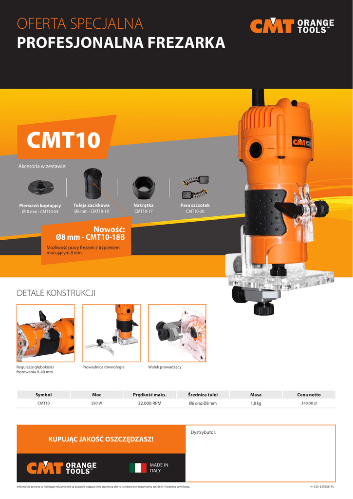 OFERTA SPECJALNA PROFESJONALNA FREZARKA CMT10 Akcesoria w zestawie: Pierścień kopiujący Ø10 mm - CMT10-54 Tuleja zaciskowa Ø6 mm - CMT10-18 Nakrętka CMT10-17 Para szczotek CMT10-30 Nowość: Ø8 mm - CMT10-18B Możliwość pracy frezami z trzpieniem mocującym 8 mm. DETALE KONSTRUKCJI Regulacja głębokości frezowania 0-40 mm Prowadnica równoległa Wałek prowadzący Symbol Moc Prędkość maks. Średnica tulei Masa Cena netto CMT10 550 W 32.000 RPM Ø6 oraz Ø8 mm 1,8 kg 349,00 zł KUPUJĄC JAKOŚĆ OSZCZĘDZASZ! Dystrybutor: MADE IN ITALY Informacje zawarte w niniejszej reklamie nie są prawnie wiążące i nie stanowią oferty handlowej w rozumieniu art. 66 § 1 Kodeksu cywilnego. H-010-150928-PL