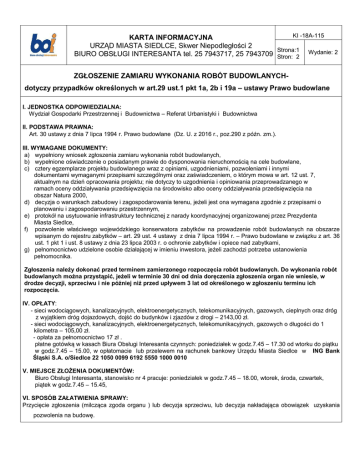 KI -18A-115 KARTA INFORMACYJNA URZĄD MIASTA SIEDLCE, Skwer Niepodległości 2 Strona:1 BIURO OBSŁUGI INTERESANTA tel. 25 7943717, 25 7943709 Stron: 2 Wydanie: 2 ZGŁOSZENIE ZAMIARU WYKONANIA ROBÓT BUDOWLANYCHdotyczy przypadków określonych w art.29 ust.1 pkt 1a, 2b i 19a – ustawy Prawo budowlane I. JEDNOSTKA ODPOWIEDZIALNA: Wydział Gospodarki Przestrzennej i Budownictwa – Referat Urbanistyki i Budownictwa II. PODSTAWA PRAWNA: Art. 30 ustawy z dnia 7 lipca 1994 r. Prawo budowlane (Dz. U. z 2016 r., poz.290 z późn. zm.). III. WYMAGANE DOKUMENTY: a) wypełniony wniosek zgłoszenia zamiaru wykonania robót budowlanych, b) wypełnione oświadczenie o posiadanym prawie do dysponowania nieruchomością na cele budowlane, c) cztery egzemplarze projektu budowlanego wraz z opiniami, uzgodnieniami, pozwoleniami i innymi dokumentami wymaganymi przepisami szczególnymi oraz zaświadczeniem, o którym mowa w art. 12 ust. 7, aktualnym na dzień opracowania projektu; nie dotyczy to uzgodnienia i opiniowania przeprowadzanego w ramach oceny oddziaływania przedsięwzięcia na środowisko albo oceny oddziaływania przedsięwzięcia na obszar Natura 2000, d) decyzja o warunkach zabudowy i zagospodarowania terenu, jeżeli jest ona wymagana zgodnie z przepisami o planowaniu i zagospodarowaniu przestrzennym, e) protokół na usytuowanie infrastruktury technicznej z narady koordynacyjnej organizowanej przez Prezydenta Miasta Siedlce, f) pozwolenie właściwego wojewódzkiego konserwatora zabytków na prowadzenie robót budowlanych na obszarze wpisanym do rejestru zabytków – art. 29 ust. 4 ustawy z dnia 7 lipca 1994 r. – Prawo budowlane w związku z art. 36 ust. 1 pkt 1 i ust. 8 ustawy z dnia 23 lipca 2003 r. o ochronie zabytków i opiece nad zabytkami, g) pełnomocnictwo udzielone osobie działającej w imieniu inwestora, jeżeli zachodzi potrzeba ustanowienia pełnomocnika. Zgłoszenia należy dokonać przed terminem zamierzonego rozpoczęcia robót budowlanych. Do wykonania robót budowlanych można przystąpić, jeżeli w terminie 30 dni od dnia doręczenia zgłoszenia organ nie wniesie, w drodze decyzji, sprzeciwu i nie później niż przed upływem 3 lat od określonego w zgłoszeniu terminu ich rozpoczęcia. IV. OPŁATY: - sieci wodociągowych, kanalizacyjnych, elektroenergetycznych, telekomunikacyjnych, gazowych, cieplnych oraz dróg z wyjątkiem dróg dojazdowych, dojść do budynków i zjazdów z drogi – 2143,00 zł. - sieci wodociągowych, kanalizacyjnych, elektroenergetycznych, telekomunikacyjnych, gazowych o długości do 1 kilometra – 105,00 zł. - opłata za pełnomocnictwo 17 zł . płatne gotówką w kasach Biura Obsługi Interesanta czynnych: poniedziałek w godz.7.45 – 17.30 od wtorku do piątku w godz.7.45 – 15.00, w opłatomacie lub przelewem na rachunek bankowy Urzędu Miasta Siedlce w ING Bank Śląski S.A. o/Siedlce 22 1050 0099 6192 5550 1000 0010 V. MIEJSCE ZŁOŻENIA DOKUMENTÓW: Biuro Obsługi Interesanta, stanowisko nr 4 pracuje: poniedziałek w godz.7.45 – 18.00, wtorek, środa, czwartek, piątek w godz.7.45 – 15.45, VI. SPOSÓB ZAŁATWIENIA SPRAWY: Przycięcie zgłoszenia (milcząca zgoda organu ) lub decyzja sprzeciwu, lub decyzja nakładająca obowiązek uzyskania pozwolenia na budowę. KI -18A-115 KARTA INFORMACYJNA URZĄD MIASTA SIEDLCE, Skwer Niepodległości 2 Strona:2 BIURO OBSŁUGI INTERESANTA tel. 25 7943717, 25 7943709 Stron: 2 Wydanie: 2 ZGŁOSZENIE ZAMIARU WYKONANIA ROBÓT BUDOWLANYCH dotyczy przypadków określonych w art.29 ust.1 pkt 1a, 2b i 19a – ustawy Prawo budowlane VII. TERMIN ZAŁATWIENIA: 30 dni VIII. TRYB ODWOŁAWCZY: Odwołanie od decyzji wnosi się do Wojewody Mazowieckiego za pośrednictwem organu, który wydał decyzję na podstawie art. 30 ust.5, 6 i 7, w terminie 14 dni od dnia doręczenia decyzji stronie. Odwołanie można składać w Biurze Obsługi Interesanta, stanowisko nr 4. UWAGI: Przez prawo do dysponowania nieruchomością na cele budowlane należy rozumieć tytuł prawny wynikający z prawa własności, użytkowania wieczystego, zarządu, ograniczonego prawa rzeczowego albo stosunku zobowiązanego, przewidującego uprawnienia do wykonywania robót budowlanych. W przypadku gdy prawem do nieruchomości dysponuje więcej niż jedna osoba fizyczna lub prawna wymagana jest zgoda wszystkich tych osób. Właściwy organ może nałożyć, w drodze decyzji, obowiązek uzyskania pozwolenia na wykonanie określonego obiektu lub robót budowlanych, objętych obowiązkiem zgłoszenia, jeśli ich realizacja może naruszyć ustalenia miejscowego planu zagospodarowania przestrzennego lub spowodować: a. zagrożenia bezpieczeństwa ludzi lub mienia, b. pogorszenia stanu środowiska lub stanu zachowania zabytków, c. pogorszenie warunków zdrowotno-sanitarnych, d. wprowadzenie, utrwalenie bądź zwiększenie ograniczeń lub uciążliwości dla terenów sąsiednich Zgłoszenia właściwemu organowi wymaga: - budowa, o której mowa w art. 29 ust. 1 pkt 1a dotyczy wolno stojących budynków mieszkalnych jednorodzinnych, których obszar oddziaływania mieści się w całości na działce lub działkach, na których zostały zaprojektowane, - budowa, o której mowa w art. 29 ust. 1 pkt 2b dotyczy wolno stojących parterowych budynków stacji transformatorowych i kontenerowych stacji transformatorowych o powierzchni zabudowy do 35 m2, - budowa, o której mowa w art. 29 ust. 1 pkt 19a dotyczy budowy sieci: elektroenergetycznych obejmujących napięcie znamionowe nie wyższe niż 1kV, wodociągowych, kanalizacyjnych, cieplnych i telekomunikacyjnych. Inwestor zamiast dokonania zgłoszenia dotyczącego w/w robót budowlanych, może wystąpić z wnioskiem o wydanie decyzji o pozwoleniu na budowę.