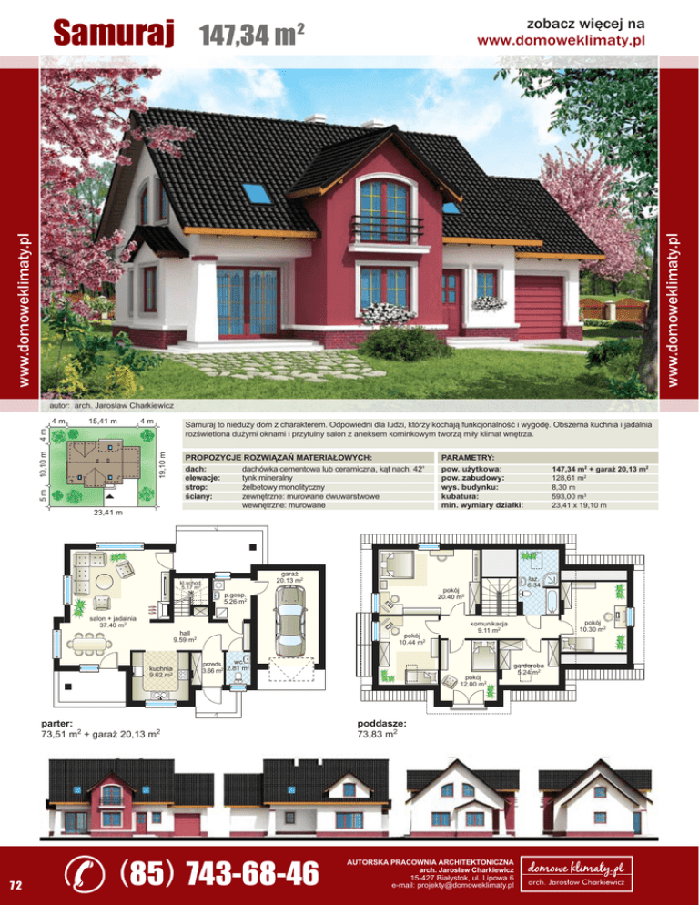 Samuraj www.domoweklimaty.pl www.domoweklimaty.pl 147,34 m zobacz więcej na www.domoweklimaty.pl 2 autor: arch. Jarosław Charkiewicz 15,41 m 4m Samuraj to nieduży dom z charakterem. Odpowiedni dla ludzi, którzy kochają funkcjonalność i wygodę. Obszerna kuchnia i jadalnia rozświetlona dużymi oknami i przytulny salon z aneksem kominkowym tworzą miły klimat wnętrza. 5m 19,10 m 10,10 m 4m 4m PROPOZYCJE ROZWIĄZAŃ MATERIAŁOWYCH: PARAMETRY: dach: elewacje: strop: ściany: pow. użytkowa: pow. zabudowy: wys. budynku: kubatura: min. wymiary działki: 23,41 m kl.schod. 5.17 m2 salon + jadalnia 37.40 m2 dachówka cementowa lub ceramiczna, kąt nach. 42° tynk mineralny żelbetowy monolityczny zewnętrzne: murowane dwuwarstwowe wewnętrzne: murowane garaż 20.13 m2 hall 9.59 m2 kuchnia 9.62 m2 pokój 10.44 m2 wc przeds. 2 3.66 m2 2.81 m parter: 73,51 m2 + garaż 20,13 m2 72 (85) 743-68-46 łaz. 6.34 pokój 20.40 m2 p.gosp. 5.26 m2 147,34 m2 + garaż 20,13 m2 128,61 m2 8,30 m 593,00 m3 23,41 x 19,10 m pokój 10.30 m2 komunikacja 9.11 m2 pokój 12.00 m2 garderoba 5.24 m2 poddasze: 73,83 m2 AUTORSKA PRACOWNIA ARCHITEKTONICZNA arch. Jarosław Charkiewicz 15-427 Białystok, ul. Lipowa 6 e-mail: [email protected]