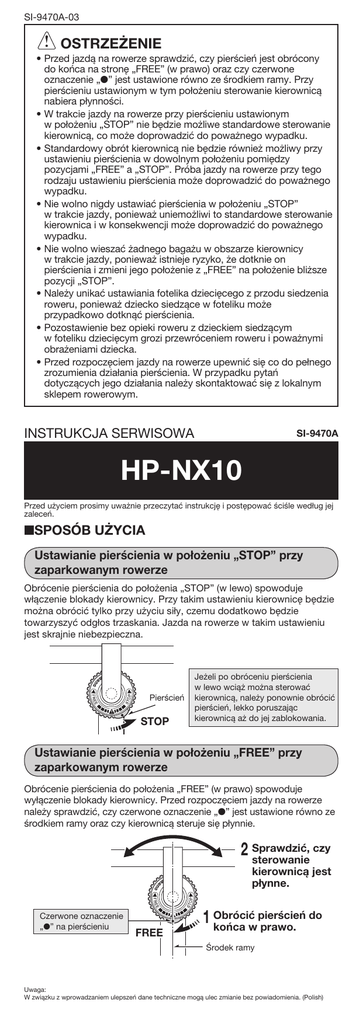 SI-9470A-03 OSTRZEŻENIE • Przed jazdą na rowerze sprawdzić, czy pierścień jest obrócony do końca na stronę „FREE” (w prawo) oraz czy czerwone oznaczenie „●” jest ustawione równo ze środkiem ramy. Przy pierścieniu ustawionym w tym położeniu sterowanie kierownicą nabiera płynności. • W trakcie jazdy na rowerze przy pierścieniu ustawionym w położeniu „STOP” nie będzie możliwe standardowe sterowanie kierownicą, co może doprowadzić do poważnego wypadku. • Standardowy obrót kierownicą nie będzie również możliwy przy ustawieniu pierścienia w dowolnym położeniu pomiędzy pozycjami „FREE” a „STOP”. Próba jazdy na rowerze przy tego rodzaju ustawieniu pierścienia może doprowadzić do poważnego wypadku. • Nie wolno nigdy ustawiać pierścienia w położeniu „STOP” w trakcie jazdy, ponieważ uniemożliwi to standardowe sterowanie kierownica i w konsekwencji może doprowadzić do poważnego wypadku. • Nie wolno wieszać żadnego bagażu w obszarze kierownicy w trakcie jazdy, ponieważ istnieje ryzyko, że dotknie on pierścienia i zmieni jego położenie z „FREE” na położenie bliższe pozycji „STOP”. • Należy unikać ustawiania fotelika dziecięcego z przodu siedzenia roweru, ponieważ dziecko siedzące w foteliku może przypadkowo dotknąć pierścienia. • Pozostawienie bez opieki roweru z dzieckiem siedzącym w foteliku dziecięcym grozi przewróceniem roweru i poważnymi obrażeniami dziecka. • Przed rozpoczęciem jazdy na rowerze upewnić się co do pełnego zrozumienia działania pierścienia. W przypadku pytań dotyczących jego działania należy skontaktować się z lokalnym sklepem rowerowym. INSTRUKCJA SERWISOWA SI-9470A HP-NX10 Przed użyciem prosimy uważnie przeczytać instrukcję i postępować ściśle według jej zaleceń. ■SPOSÓB UŻYCIA Ustawianie pierścienia w położeniu „STOP” przy zaparkowanym rowerze Obrócenie pierścienia do położenia „STOP” (w lewo) spowoduje włączenie blokady kierownicy. Przy takim ustawieniu kierownicę będzie można obrócić tylko przy użyciu siły, czemu dodatkowo będzie towarzyszyć odgłos trzaskania. Jazda na rowerze w takim ustawieniu jest skrajnie niebezpieczna. Pierścień STOP Jeżeli po obróceniu pierścienia w lewo wciąż można sterować kierownicą, należy ponownie obrócić pierścień, lekko poruszając kierownicą aż do jej zablokowania. Ustawianie pierścienia w położeniu „FREE” przy zaparkowanym rowerze Obrócenie pierścienia do położenia „FREE” (w prawo) spowoduje wyłączenie blokady kierownicy. Przed rozpoczęciem jazdy na rowerze należy sprawdzić, czy czerwone oznaczenie „●” jest ustawione równo ze środkiem ramy oraz czy kierownicą steruje się płynnie. czy 2 Sprawdzić, sterowanie kierownicą jest płynne. Czerwone oznaczenie „●” na pierścieniu FREE pierścień do 1 Obrócić końca w prawo. Środek ramy Uwaga: W związku z wprowadzaniem ulepszeń dane techniczne mogą ulec zmianie bez powiadomienia. (Polish)