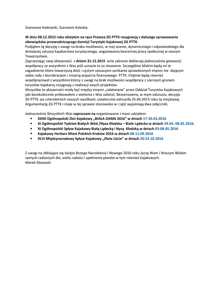 Szanowne Koleżanki, Szanowni Koledzy. W dniu 08.12.2015 roku złożyłem na ręce Prezesa ZG PTTK rezygnację z dalszego sprawowania obowiązków przewodniczącego Komisji Turystyki Kajakowej ZG PTTK. Podjąłem tę decyzję z uwagi na braku możliwości, w mej ocenie, dynamicznego i odpowiedniego dla dzisiejszej sytuacji kajakarstwa turystycznego, angażowania bezcennej pracy społecznej w naszym Towarzystwie. Zaprzestając swej aktywności z dniem 31.12.2015 w/w zakresie deklaruję jednocześnie gotowość współpracy ze wszystkimi z Was jeśli uznacie to za stosowne. Szczególnie bliskim będą mi te zagadnienie które towarzyszą dość częstym sytuacjom zanikania sprawdzonych imprez nie dającym sobie rady z biurokracjom i mizerią wsparcia finansowego PTTK. Chętnie będę również współpracował z wszystkimi którzy z uwagi na brak możliwości współpracy z szerszym gronem turystów kajakarzy rezygnują z realizacji swych projektów. Wszystkie te aktywności miały być między innymi „załatwiane” przez Oddział Turystów Kajakowych jaki bezskutecznie próbowałem z wieloma z Was założyć. Bezsensowna, w mym odczuciu, decyzja ZG PTTK, po czteroletnich naszych wysiłkach, ostatecznie odrzuciła 25.04.2015 roku tę inicjatywę. Argumentację ZG PTTK i moje w tej sprawie stanowisko w część wyjaśniają dwa załączniki. Jednocześnie Wszystkich Was zapraszam na organizowane z mym udziałem: • XXXII Ogólnopolski Zlot Kajakowy „BIAŁA DAMA 2016” w dniach 17-20.03.2016 • XI Ogólnopolski Tydzień Białych Wód /Nysa Kłodzka – Biała Lądecka w dniach 29.04.-08.05.2016. • XI Ogólnopolski Spływ Kajakowy Białą Lądecką i Nysą Kłodzką w dniach 03-08.05.2016 • Kajakowy Herbarz Miast Polskich Kraków 2016 w dniach 08-11.09.2016 • XLVI Międzynarodowy Spływ Kajakowy „Złote Liście” w dniach 20-23.10.2016 Z uwagi na zbliżające się święta Bożego Narodzenia i Nowego 2016 roku życzę Wam i Waszym Bliskim samych radosnych dni, wielu radości i spełnienia planów w tym również kajakowych. Marek Głowacki