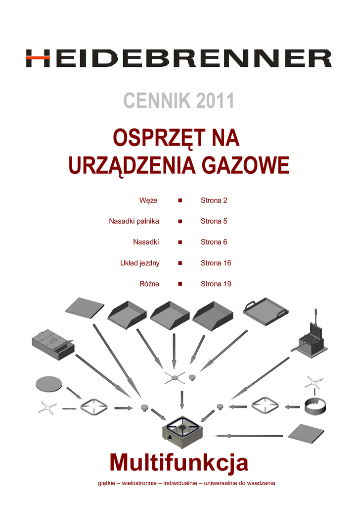 CENNIK 2011 OSPRZĘT NA URZĄDZENIA GAZOWE Węże ■ Strona 2 Nasadki palnika ■ Strona 5 Nasadki ■ Strona 6 Układ jezdny ■ Strona 16 Różne ■ Strona 19 Multifunkcja giętkie – wielostronnie – indiwidualnie – uniwersalnie do wsadzania Cennik 2011 Ważny od 01.03.2011 WĘŻE Długość (mm) PRZYŁĄCZA WĘŻA GAZU PŁYNNEGO 300 Art. - Nr. 0,5 Składa się z: Regulator ciśnienia (na zewnątrz) Przyłącza prosta Ø 8 mm Wąż 300 mm Do kuchni jezdnej PRZYŁĄCZA WĘŻA GAZU PŁYNNEGO 300 0,7 Składa się z: Regulator ciśn. (na we/zewnątrz) Przyłącza prosta Ø 8 mm Wąż 300 mm Do kuchni jezdnej PRZYŁĄCZA WĘŻA GAZU PŁYNNEGO 1500 0,7 Składa się z: Regulator ciśnienia (na zewnątrz) Przyłącza prosta Ø 8 mm Wąż 1500 mm Zabezpieczenie antizałamianowe PRZYŁĄCZA WĘŻA GAZU PŁYNNEGO 1500 0,7 Składa się z: Regulator ciśn. (na we/zewnątrz) Przyłącza prosta Ø 8 mm Wąż 1500 mm Zabezpieczenie antizałamianowe 8821 53 € 98836 8859 94027 98822 97 € 98837 8859 94027 98805 85 € 98836 8859 98826 94028 98807 131 € 98837 8859 98826 94028 2 Proponowana cena · wszystkie ceny w EURO plus VAT · z zastrzeżeniem zmian technicznych · Waga i wymiary ą wskaźniki Liesenhörnw eg 7-11 D-24222 Schw entinental Tel.:+49 431 780 93 0 Fax: + 49 431 780 93 2 w w w .heidebrenner.de [email protected] Cennik 2011 Ważny od 01.03.2011 WĘŻE Długość (mm) PRZYŁĄCZA WĘŻA GAZU PŁYNNEGO 1500 Art. - Nr. 0,7 Składa się z: Regulator ciśnienia (na zewnątrz) Przyłącza prosta Ø 8 mm Wąż 1500 mm Zabezpieczenie antizałamianowe PRZYŁĄCZA WĘŻA GAZU PŁYNNEGO 1500 0,9 Składa się z: Regulator ciśn. (na we/zewnątrz) Przyłącza prosta Ø 8 mm Wąż 1500 mm Zabezpieczenie antizałamianowe PRZYŁĄCZA WĘŻA GAZU PŁYNNEGO 1500 0,9 98806 85 € 98836 8822 98826 94028 98808 131 € 98837 8822 98826 94028 98824 111 € Składa się z: 98836 Regulator ciśnienia (na zewnątrz) Przyłącza prosta Ø 12 mm 8856 8820 Wąż 1500 mm Zabezpieczenie antizałamianowe 94028 Polecamy od ok. 11,6 kW do ok. 18,6 kW PRZYŁĄCZA WĘŻA GAZU PŁYNNEGO 1500 1,1 98832 156 € Składa się z: Regulator ciśn. (na we/zewnątrz) 98837 Przyłącza prosta Ø 12 mm 8856 Wąż 1500 mm 8820 Zabezpieczenie antizałamianowe 94028 Polecamy od ok. 11,6 kW do ok. 18,6 kW 3 Proponowana cena · wszystkie ceny w EURO plus VAT · z zastrzeżeniem zmian technicznych · Waga i wymiary ą wskaźniki Liesenhörnw eg 7-11 D-24222 Schw entinental Tel.:+49 431 780 93 0 Fax: + 49 431 780 93 2 w w w .heidebrenner.de [email protected] Cennik 2011 Ważny od 01.03.2011 WĘŻE Długość (mm) Art. - Nr. WĄŻ GAZOWY Z ZABEZPIECZENIEM Z płaszczem ze stali nierdzewnej Jednostronna wtyczka znormalizowana dla gniazdka Jednostronnie R 1/2“ wewnątrz Na gaz ziemny 20 mbar / gas płynny 50 mbar 800 mm 1000 mm 1500 mm 2000 mm 0,5 0,6 0,7 0,8 98820 98812 98819 98818 138 € 184 € 216 € 354 € 4 Proponowana cena · wszystkie ceny w EURO plus VAT · z zastrzeżeniem zmian technicznych · Waga i wymiary ą wskaźniki Liesenhörnw eg 7-11 D-24222 Schw entinental Tel.:+49 431 780 93 0 Fax: + 49 431 780 93 2 w w w .heidebrenner.de [email protected] Cennik 2011 Ważny od 01.03.2011 NASADKI PALNIKA Typ Ø (mm) Art. - Nr. Nadaje się do STANDARDOWA NASADKA PALNIKA Do patelni i garnków o płaskim dnie Mosiądz Żeliwo Żeliwo Żeliwo HB 30 HB 50 HB 80 HB 120 60 90 115 155 3,5 kW 5,8 kW 9,3 kW 12,8 kW 0,1 0,3 0,5 1,2 98642 8634 8637 8640 44 € 64 € 96 € 127 € SZCZELINOWA NASADKA PALNIKA Do kotłów Ø 320 – 380 mm 90 Żeliwo HB 51 Żeliwo HB 81 115 5,8 kW 9,3 kW 0,3 0,6 8635 8638 85 € 120 € Do kotłów Ø 400 – 500 mm Żeliwo HB 121 155 12,8 kW 1,1 8641 152 € 9,3 kW 0,5 8653 157 € 1 8658 185 € WIROWA NASADKA PALNIKA Na woki Ø 400 mm Żeliwo HB 82 115 Na olbrzymie woki Ø 600 – 700 mm Żeliwo HB 122 155 12,8 kW KRZYŻOWA NASADKA PALNIKA 90 5,8 kW 0,4 8643 206 € Do równoczesnego ogrzewania płyt do smażenia i grillowych jak i smażalni Gr. I jak i Gr. II (przy Gr. II są 2 sztuki potrzebne) 5 Proponowana cena · wszystkie ceny w EURO plus VAT · z zastrzeżeniem zmian technicznych · Waga i wymiary ą wskaźniki Liesenhörnw eg 7-11 D-24222 Schw entinental Tel.:+49 431 780 93 0 Fax: + 49 431 780 93 2 w w w .heidebrenner.de [email protected] Cennik 2011 Ważny od 01.03.2011 NASADKI Wymiary (mm) MAŁY RUSZT Art. - Nr. 250x250 0,2 98801 24 € 415x415x15 0,9 8341 209 € 365x365x45 2,3 8319 124 € 8324 239 € Stal nierdzewna RUSZT DLA MAŁYCH GARNKÓW Stal nierdzewna PIERŚCIEŃ GARNKA Żeliwo PIERŚCIEŃ GARNKA Dla nasadki palnika HB 30 i HB 50 365x365x15 3 Stal Dla nasadki palnika HB 80 nierdzewna 6 Proponowana cena · wszystkie ceny w EURO plus VAT · z zastrzeżeniem zmian technicznych · Waga i wymiary ą wskaźniki Liesenhörnw eg 7-11 D-24222 Schw entinental Tel.:+49 431 780 93 0 Fax: + 49 431 780 93 2 w w w .heidebrenner.de [email protected] Cennik 2011 Ważny od 01.03.2011 NASADKI Wymiary (mm) PIERŚCIEŃ NASADOWY-KONDI Ø 270 Żeliwo PIERŚCIEŃ NASADOWY-KONDI PIERŚCIEŃ NASADOWY-KONDI PIERŚCIEŃ NASADOWY-KONDI 146 € 2,7 8805 148 € 2,9 8804 179 € 8806 211 € Ochrona przed promieniowaniem do kotłów Ø 300 mm do palnika 5,8 kW Ø 260 Stal 8360 Ochrona przed promieniowaniem do kotłów Ø 260 mm do palnika 3,5 kW lub 5,8 kW Ø 230 Stal 3,3 Ochrona przed promieniowaniem do kotłów Ø 320-380 mm i woków do Ø 400 mm do palnika 5,8 kW Ø 210 Stal Art. - Nr. 3,3 Ochrona przed promieniowaniem do kotłów Ø 300 mm do palnika 5,8 kW 7 Proponowana cena · wszystkie ceny w EURO plus VAT · z zastrzeżeniem zmian technicznych · Waga i wymiary ą wskaźniki Liesenhörnw eg 7-11 D-24222 Schw entinental Tel.:+49 431 780 93 0 Fax: + 49 431 780 93 2 w w w .heidebrenner.de inf [email protected] Cennik 2011 Ważny od 01.03.2011 NASADKI Wymiary (mm) PIERŚCIEŃ NASADOWY-WOK Ø 270 Żeliwo PIERŚCIEŃ NASADOWY-WOK Art. - Nr. 3,8 70560 170 € 4 70577 170 € wysokość nad płytą 60 mm na woki