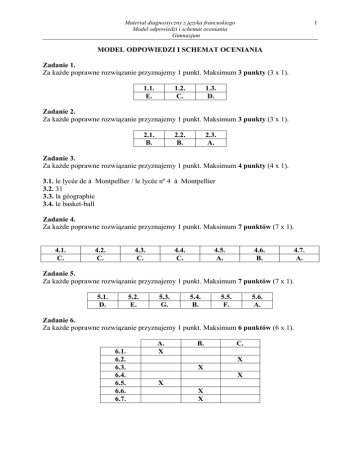 Materiał diagnostyczny z języka francuskiego Model odpowiedzi i schemat oceniania Gimnazjum 1 MODEL ODPOWIEDZI I SCHEMAT OCENIANIA Zadanie 1. Za kaŜde poprawne rozwiązanie przyznajemy 1 punkt. Maksimum 3 punkty (3 x 1). 1.1. E. 1.2. C. 1.3. D. Zadanie 2. Za kaŜde poprawne rozwiązanie przyznajemy 1 punkt. Maksimum 3 punkty (3 x 1). 2.1. B. 2.2. B. 2.3. A. Zadanie 3. Za kaŜde poprawne rozwiązanie przyznajemy 1 punkt. Maksimum 4 punkty (4 x 1). 3.1. le lycée de à Montpellier / le lycée nº 4 à Montpellier 3.2. 31 3.3. la géographie 3.4. le basket-ball Zadanie 4. Za kaŜde poprawne rozwiązanie przyznajemy 1 punkt. Maksimum 7 punktów (7 x 1). 4.1. C. 4.2. C. 4.3. C. 4.4. C. 4.5. A. 4.6. B. 4.7. A. Zadanie 5. Za kaŜde poprawne rozwiązanie przyznajemy 1 punkt. Maksimum 7 punktów (7 x 1). 5.1. D. 5.2. E. 5.3. G. 5.4. B. 5.5. F. 5.6. A. Zadanie 6. Za kaŜde poprawne rozwiązanie przyznajemy 1 punkt. Maksimum 6 punktów (6 x 1). 6.1. 6.2. 6.3. 6.4. 6.5. 6.6. 6.7. A. X B. C. X X X X X X Materiał diagnostyczny z języka francuskiego Model odpowiedzi i schemat oceniania Gimnazjum 2 Zadanie 7. Za kaŜde poprawne rozwiązanie przyznajemy 1 punkt. Maksimum 5 punktów (5 x 1). 7.1. E. 7.2. B. 7.3. A. 7.4. C. 7.5. F. Zadanie 8. Za kaŜde poprawne rozwiązanie przyznajemy 1 punkt. Maksimum 5 punktów (5 x 1). 8.1. A. 8.2. B. 8.3. C. 8.4. A. 8.5. A. Zadanie 9. Za kaŜde poprawne rozwiązanie przyznajemy 1 punkt. Maksimum 6 punktów (6 x 1). 9.1. donner 9.2. attendez 9.3. désirez 9.4. voudrais 9.5. boire 9.6. merci Zadanie 10. - (4 punkty) Sprawdza przeprowadzający diagnozę zgodnie z kryteriami. JeŜeli zdający udzieli odpowiedzi zgodnej z tematem i jego błędy nie zakłócą komunikacji, otrzymuje 1 punkt w kryterium komunikatywności. Jeśli zdający nie popełni błędów leksykalno-gramatycznych, otrzymuje dodatkowo 1 punkt w kryterium poprawności językowej. Zad. 10.1. 0 1 Komunikatywność □ □ Poprawność językowa □ □ 0 1 □ □ □ □ Zad. 10.2. Komunikatywność Poprawność językowa Przykładowe odpowiedzi: 10.1. Ces personnes se promènent avec leurs chiens. Ils promènent leurs chiens. 10.2. Les gens aiment la compagnie des animaux qui sont amicaux et fidèles. Ce sont les meilleurs amis de l’homme.