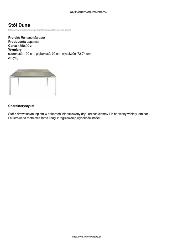 Stół Dune http://www.futurefurniture.pl/pl/offer/meble/stoly/stol-dune.html/ Projekt: Romano Marcato Producent:: Lapalma Cena: 4350.00 zł Wymiary szerokość: 190 cm, głębokość: 90 cm, wysokość: 72-74 cm zapytaj Charakterystyka: Stół z drewnianym top'em w dekorach: blanszowany dąb, orzech ciemny lub barwiony w biały laminat. Lakierowana metalowa rama i nogi z regulowacją wysokości nóżek. http://www.futurefurniture.pl http://www.futurefurniture.pl Zdjęcia produktu: http://www.futurefurniture.pl Powered by TCPDF (www.tcpdf.org)
