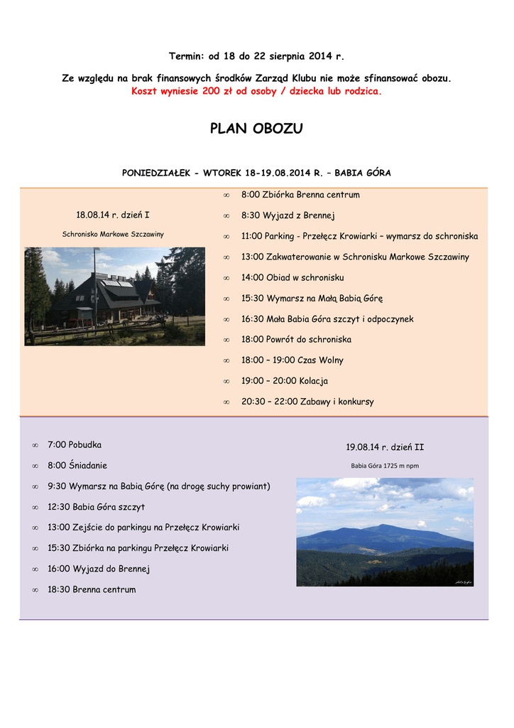 Termin: od 18 do 22 sierpnia 2014 r. Ze względu na brak finansowych środków Zarząd Klubu nie może sfinansować obozu. Koszt wyniesie 200 zł od osoby / dziecka lub rodzica. PLAN OBOZU PONIEDZIAŁEK - WTOREK 18-19.08.2014 R. – BABIA GÓRA • 8:00 Zbiórka Brenna centrum 18.08.14 r. dzień I • 8:30 Wyjazd z Brennej Schronisko Markowe Szczawiny • 11:00 Parking - Przełęcz Krowiarki – wymarsz do schroniska • 13:00 Zakwaterowanie w Schronisku Markowe Szczawiny • 14:00 Obiad w schronisku • 15:30 Wymarsz na Małą Babią Górę • 16:30 Mała Babia Góra szczyt i odpoczynek • 18:00 Powrót do schroniska • 18:00 – 19:00 Czas Wolny • 19:00 – 20:00 Kolacja • 20:30 – 22:00 Zabawy i konkursy • 7:00 Pobudka • 8:00 Śniadanie • 9:30 Wymarsz na Babią Górę (na drogę suchy prowiant) • 12:30 Babia Góra szczyt • 13:00 Zejście do parkingu na Przełęcz Krowiarki • 15:30 Zbiórka na parkingu Przełęcz Krowiarki • 16:00 Wyjazd do Brennej • 18:30 Brenna centrum 19.08.14 r. dzień II Babia Góra 1725 m npm INFIRMACJE - WAŻNE: 1. Schronisko Markowe Szczawiny zostało zarezerwowane, prognoza prawdopodobnie ma być sprzyjająca wędrówką górskim. Jeżeli nastąpi załamanie pogody, a będziemy w schronisku wówczas nie będziemy narażali dzieci ani opiekunów na jakiekolwiek ryzyko. Po prostu odpuścimy zdobycie szczytu. 2. Proszę o wyposażenie dzieci w: a) Śpiwór (najlepiej jak najmniejszy i lekki) lub można wykupić za 8 zł pościel w schronisku b) Obuwie np. adidasy lub trekkingi (koniecznie podeszwa z bieżnikiem, buty wygodne i rozchodzone) + coś zamiennego np. klapki, japonki, sandały + 3 pary skarpet c) Kurtka przeciwdeszczowa z polarem – softshell’em lub peleryna + czapeczka na głowę d) Krótkie spodenki np. typu jeans (odporne) lub odzież termo aktywna z odpinanymi nogawkami e) Plecaki proporcjonalne do gabarytu dziecka f) Do jedzenia: baton energetyczny, czekolada i woda do picia (mała buteleczka) 3. Nie zabieramy rzeczy zbędnych, które są: ciężkie, wielkie i nie potrzebne !!! 4. Śpiwory itp. rzeczy niepotrzebne w wędrówkach górskich zostają w schronisku, 2 osoby odniosą do samochodów, by nie obciążać dzieci. 5. Celem jest mile spędzony czas dzieci i zdobycie najwyższego szczytu Beskidu Żywieckiego ŚRODA 20.08.2014 R. AQUAPARK OLEŠNÁ W FRÝDEK-MÍSTEK • 9:15 wyjazd z Brennej • 10:30 przyjazd do Aquaparku Olešná w Frýdek-Místek • 10:45 – 12:00 rolki • 12:00 – 16:00 kąpiel i plażowanie • 16:15 wyjazd z Aquaparku Olešná w Frýdek-Místek • 17:30 Brenna Centrum • Zabieramy: ręcznik duży kąpielowy, stroje kąpielowe, rolki + ochraniacze + kask • Proszę dzieci wyposażyć w suchy prowiant i coś do picia. • Dzieci, które nie potrafią pływać jadą z rodzicem lub opiekunem. CZWARTEK 21.08.2014 R. BASEN STARS TŘINEC W CZECHACH - 9:00 wyjazd z Brennej – 10:00 przyjazd do Třinec’a - 10:15 – 11:45 rolki i testy sprawnościowe – 12:00 – 16:00 kąpiel i plażowanie – 16:15 wyjazd z Třinec’a - 17:00 Brenna Centrum • Zabieramy: ręcznik duży kąpielowy, stroje kąpielowe, rolki + ochraniacze + kask. • Proszę dzieci wyposażyć w suchy prowiant i coś do picia na czas basenu. • Dzieci, które nie potrafią pływać jadą z rodzicem lub opiekunem. • Tuż przy basenie znajduje się stadion wokół którego jest tor dla rolkarzy, a na stadionie będzie można przeprowadzić testy sprawnościowe dla tej grupy, która była nieobecna 20.06.2014 r. w Skoczowie. Szczegóły ustalimy w trakcie obozu. PIĄTEK 22.08.2014 R. GRY I ZABAWY W BRENNEJ • 9:45 Zbiórka pod Hotelem Kotarz (park linowy) • 10:00 - 11:30 Wspinaczka i zabawa w parku linowym • 12:00 - 13:30 Ognisko z pieczeniem kiełbasek + frytki + napoje w ośrodku Hawana • 14:00 - 17:00 Gry i zabawy z Rafałem i Patrycją • 17:00 Odbiór dzieci ośrodek Hawana INFORMACJE ciąg dalszy: • Plan obozu od środy do piątku może się zmienić - przetasować, gdyż jest uzależniony od pogody i warunków atmosferycznych. Będziemy informować pod wieczór każdego dnia czy coś się zmienia czy nie. • W przypadku ulewnych dreszczów lub obniżenia temperatury będziemy musieli: odwołać i zrezygnować częściowo z programu dnia lub jeżeli będzie taka wola w zamian zorganizujemy np. wyjazd do kina, albo ściankę wspinaczkową w Bielsku.