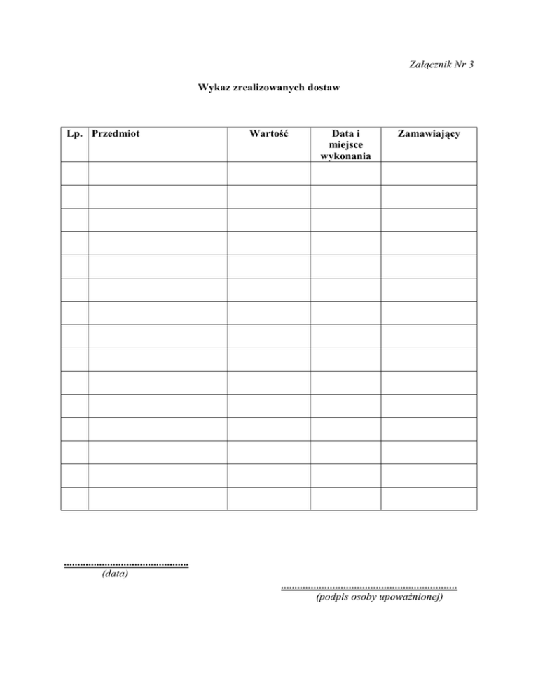 Załącznik Nr 3 Wykaz zrealizowanych dostaw Lp. Przedmiot Wartość Data i miejsce wykonania Zamawiający .............................................. (data) ................................................................. (podpis osoby upowaŜnionej)