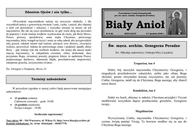Zdaniem Ojców i nie tylko... «Wszystkim męczennikom należą się uroczyste obchody, i dla wszystkich należy z gotowością otwierać i usta, i ucho, i umysł, aby chętniej o nich coś powiedzieć i usłyszeć, i wszystko uważać za niższe od ich męczeństwa. Bo tak się rzecz przedstawia, że gdy wiele dróg nas prowadzi do poprawy i wiele istnieje środków wychowania do cnoty, jak Boże Słowo, Prawo, prorocy, apostołowie, sama męka Chrystusa, pierwszego męczennika, który wstąpił na krzyż i mnie ze sobą zabrał, aby przygwoździć mój grzech, odnieść triumf nad wężem, uświęcić owo drzewo, zwyciężyć rozkosz, przywrócić Adama do pierwotnego stanu i podnieść upadły obraz Boży – gdy istnieje tyle tak wielkich środków, nie mniej dla naszej nauki znaczą męczennicy, te całopalenia rozumne, ofiary doskonałe, dary przyjemne Bogu, zwiastuny prawdy, pręgierze fałszu: to spełnienie Prawa, pojmowanego duchowo, stłumienie błędu, prześladowanie nieprawości, zatopienie grzechu, oczyszczenie świata». Św. Grzegorz z Nazjanzu, Mowa 24 Terminy nabożeństw W przyszłym tygodniu w naszej cerkwi będą sprawowane następujące nabożeństwa: · · 13 grudnia (sobota) Całonocne czuwanie – godz. 18.00. 14 grudnia (niedziela) Święta Liturgia – 10.00. Serdecznie zapraszamy! Nasz adres: 00 – 544 Warszawa, ul. Wilcza 31, http://www.liturgia.cerkiew.pl Kontakt telefoniczny: ks. Artur Aleksiejuk – 603037770. Św. męcz. archim. Grzegorza Peradze Św. Mikołaja cudotwórcy i biskupa Miry Licyjskiej Troparion, ton 4 Dobry bój stoczyłeś męczenniku Chrystusowy Grzegorzu, i niegodnych prześladowców oskarżyłeś, siebie jako ofiarę Bogu złożyłeś, przeto otrzymałeś koronę zwycięstwa, my zaś prosimy Ciebie, Grzegorzu, módl się do Chrystusa, Boga naszego, aby zbawił nasze dusze. Kondakion, ton 4 Siałeś we łzach, zbierasz w radości, Chrystusa przyjąłeś i Twymi modlitwami wszystkim dajesz przebaczenie grzechów, Grzegorzu święty. Megalinarion Wywyższamy Ciebie, męczenniku Chrystusowy Grzegorzu, i czcimy świętą pamięć Twoją, Ty bowiem modlisz się za nas do Chrystusa Boga naszego. Św. męcz. archim. Grzegorz Peradze Z dzieł św. męcz. archim. Grzegorza Św. męczennik archimandryta Grzegorz Peradze urodził się 13 września 1899 roku w Bakurciche (prowincja Kacheti) w Gruzji; kapłan Kościoła Gruzińskiego, żołnierz w okresie obrony niepodległości Gruzji przed bolszewikami w 1921 roku, następnie aż do końca życia na emigracji. Odbył rozległe studia teologiczne w Niemczech, doktor patrologii Uniwersytetu w Bonn, badacz i wydawca tekstów z dziejów Kościoła i żywotów świętych, poliglota. W 1931 roku złożył w greckiej katedrze w Paryżu śluby zakonne i przyjął święcenia kapłańskie. Związał się z gruzińską parafią w Paryżu, gdzie został mianowany jej pierwszym proboszczem. Tamże założył (1931) i redagował rocznik naukowy Dżwari Wazysa. W styczniu 1934 roku Grzegorz Peradze otrzymał w greckiej katedrze św. Sofii w Londynie godność archimandryty. W 1935 roku odbył podróż religijną i jednocześnie naukową do Rumunii, Bułgarii i Grecji (Góra Atos, Tesalonika). W 1936 roku udał się także do Ziemi Świętej i Syrii. W 1933 roku Metropolita Dionizy zaprosił go do Warszawy, proponując mu stanowisko profesora patrologii i kierownika seminarium patrystycznego w Studium Teologii Prawosławnej Uniwersytetu Warszawskiego. Wykład inauguracyjny o. Grzegorz Peradze wygłosił 7 grudnia 1933 roku. Poza pracą wydawniczą i naukową, czynnie uczestniczył w życiu licznej kolonii gruzińskiej w Polsce. W maju 1942 roku w Warszawie został aresztowany przez gestapo. Bezpośrednim powodem aresztowania była prowokacja i donos. Najpierw osadzono go w więzieniu na Pawiaku w Warszawie, a w listopadzie 1942 roku przewieziono do obozu koncentracyjnego w Auschwitz, Tam, poświęcając się za innych uwięzionych, zakończył życie w dniu 6 grudnia 1942 roku. We wrześniu 1995 roku, na soborze Kościoła Gruzińskiego, o. Grzegorz Peradze został kanonizowany jako święty kapłan-męczennik. Święty męczenniku Grzegorzu módl się za nas do Boga, aby zbawił nasze dusze! Uczucia religijne nie znają trudności i człowiek religijny nawet na dnie otchłani widzi Bożą światłość, chociaż otoczony ciemnościami, i wahając się, powoli, niekiedy zawracając i potykając się w drodze, dąży przed siebie i wyciąga ręce do tej światłości (…). Uczucia religijne są wtedy, kiedy człowiek z jednej strony przeżywa straszne minuty samotności i czuje, że słońce nie świeci, pogoda nie jest pogodą, a równocześnie z jego serca wyrywa się hymn przeniknięty bojaźnią Bożą i całkowitym oddaniem się Opatrzności (…). Uczucia religijne to wpatrywanie się we własną duszę, poczucie własnej małości, niemożliwości uczynienia czegokolwiek samemu i odczucie Bożej łaski, która napełnia naszą pustkę, usuwa pustynię będąca w nas, niszczy wroga lub jego możliwości, gdy wróg chce w nas zamieszkać, i daje człowiekowi moc działania, mądrość i rozum, pokorę i stałość, umiłowanie wrogów, zrozumienie i uznanie swego bliźniego, wynosi nas ponad to, co doczesne i ziemskie, pozwala rozróżnić to, co nieśmiertelne i co poddane śmierci, przemijające od nieprzemijającego, sprawy godne walki i ofiary od spraw, o które nie należy walczyć i składać ofiary (…). Wiecznym jest tylko to, co jest zbudowane na skale, na mocnym fundamencie, a tym jest uczciwość i umiłowanie prawdy. Człowiek kłamliwy i obłudnik nie tylko nie odziedziczy królestwa niebieskiego, ale i na ziemi nie stworzy nic wielkiego, nic potężnego, nic trwałego. Bóg nigdy jeszcze w dziejach nie posługiwał się ludźmi obłudnymi, takich ludzi nigdy on nie czynił godnymi swych celów, swej misji i swej prawdy (…). Moim pierwszym obowiązkiem jest i będzie mówienie wam: Prawosła