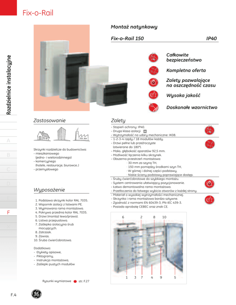 Fix-o-Rail Montaż natynkowy Fix-o-Rail 150 IP40 Rozdzielnice instalacyjne Całkowite bezpieczeństwo Kompletna oferta Zalety pozwalające na oszczędność czasu Wysoka jakość Doskonałe wzornictwo Zastosowanie Zalety A Skrzynki rozdzielcze do budownictwa: - mieszkaniowego (jedno- i wielorodzinnego) - komercyjnego (hotele, restauracje, biurowce..) - przemysłowego B C D Wyposażenie E 1. Podstawa skrzynki kolor RAL 7035. 2. Wspornik izolacji z listwami PE. 3. Wyjmowana rama montażowa. 4. Pokrywa przednia kolor RAL 7035. 5. Drzwi (montaż lewo/prawo). 6. Listwa przepustowa. 7. Zaślepka izolacyjna śrub mocujących. 8. Zatrzask. 9. Zawias. 10. Śruba ćwierćobrotowa. F X - Stopień ochrony: IP40. - Druga klasa izolacji - Wytrzymałość na udary mechaniczne: IK08. - 1-2-3-4 rzędy / 18 modułów każdy. - Drzwi pełne lub przeźroczyste (otwierane do 180°). - Maks. głębokość aparatów 92,5 mm. - Możliwość łączenia kilku skrzynek. - Obszerna przestrzeń montażowa: · 30 mm za szyną TH, · 150 mm pomiędzy środkami szyn TH, · W górnej i dolnej części podstawy, · Niskie ściany podstawy poprawiające dostęp. - Śruby ćwierćobrotowe do szybkiego montażu. - System centrowania ułatwiający pozycjonowanie. - Łatwo demontowalna rama montażowa. - Przetłoczenia do łatwego wybicia otworów z każdej strony. - Materiał o wysokiej wytrzymałości mechanicznej. - Skrzynka i rama montażowa bardzo sztywne. - Zgodność z normami EN 60439-3; PN-IEC 439-3. - Posiada aprobatę CEBEC oraz znak CE. 6 2 8 10 Dodatkowo: - Etykiety opisowe, - Piktogramy, - Instrukcja montażowa, - Zaślepki pustych modułów 1 Rysunki wymiarowe F.4 str. F.27 3 7 4 9 5 Fix-o-Rail Fix-o-Rail 150 Prąd znamionowy Liczba modułów Liczba rzędów Nr kat. Opak. Drzwi przeźroczyste 270 x 355 x 142 450 x 355 x 142 600 x 355 x 142 750 x 355 x 142 PE: 14x16mm2 PE: 14x16mm2 PE: 18x16mm2 PE: 18x16mm2 In 80A In 80A In 100A In 100A 18 36 54 72 1 2 3 4 610275 610285 610295 610303 1 1 1 1 Drzwi pełne 270 x 355 x 142 450 x 355 x 142 600 x 355 x 142 750 x 355 x 142 PE: 14x16mm2 PE: 14x16mm2 PE: 18x16mm2 PE: 18x16mm2 In 80A In 80A In 100A In 100A 18 36 54 72 1 2 3 4 610276 610286 610296 610304 1 1 1 1 Zaciski N zamawiane opcjonalnie: do skrzynki 1 i 2 rzędowej nr kat. 610386, do skrzynki 3 i 4 rzędowej nr kat. 610385. Akcesoria do Fix-o-Rail 150 Uniwersalna płyta przepustowa Listwy zaciskowe 4 biegunowe 610022 610264 12 Fix-o-Rail 150 Listwy zaciskowe Wymiary wys x szer x gr 2 Zwiększa szczelność skrzynki. Z osłabieniami na przewody. Listwy 6,5 x 9 mm do prądu znamionowego 63A. Montaż na szynie TH A Osłona ochronna Listwy zaciskowe 4 biegunowe B 610020 15 Listwy 5 x 12 mm do prądu znamionowego 160A. 610021 1 Dla listw przył. 160A C 20 złączek. Montaż na szynie TH D Uniwersalna płyta przepustowa 610272 1 szerokość: 355 mm Wspornik izolacyjny z listwami 610532 E 4 Przekrój przewodu: 2 (17 x 16 mm2) Łatwa do montaży z góry i u dołu F 610386 X Wspornik izolacyjny z listwami L1-L2-L3-N Wspornik izolacyjny z listwami PE 4 610387 4 Przekrój przewodu: 4 (5 x 16 mm2) przekrój przewodu: 14 x 16 mm2 na wyposażeniu 1 i 2 rzędowych skrzynek 610385 4 przekrój przewodu: 18 x 16 mm2 na wyposażeniu 3 i 4 rzędowych skrzynek F.5 Fix-o-Rail Akcesoria Fix-o-Rail 150 Uchwyt na zrolowane schematy Zamek na kluczyk 610170 1 2 szt. kluczyków 610265 1 Do zamocowania w tylnej części Rozdzielnice instalacyjne maskownicy (u góry/dołu). Zaślepki na 4 moduły 610142 Zestaw do łączenia skrzynek 610327 1 1 Zawiera dławice 2 x PG21. długość: 72 mm. Docinanie na wielokrotność 9 mm. Zapewnia możliwość połączenia bokami kilku skrzynek. Piktogramy 610380 1 Do przejrzystego oznakowania obwodów. Zestaw zawiera 50 szt. A B Drzwi przeźroczyste (zapasowe) C 610277 Nakładka rozdzielająca 610273 1 mają być zamontowane obok siebie. 610287 D 1 Zapewnia możliwość łatwego rozprowadzenia przewodów. do skrzynki 610285 Szerokość 710 mm, kolor RAL 7035, 610297 1 610305 1 do skrzynki 610295 E do skrzynki 610303 F Drzwi pełne (zapasowe) 610281 1 do skrzynki 610276 X 610291 1 do skrzynki 610286 610301 1 610306 1 do skrzynki 610296 do skrzynki 610304 F.6 1 Zalecana gdy dwie skrzynki F-O-R 150 do skrzynki 610275 montaż góra/dół.