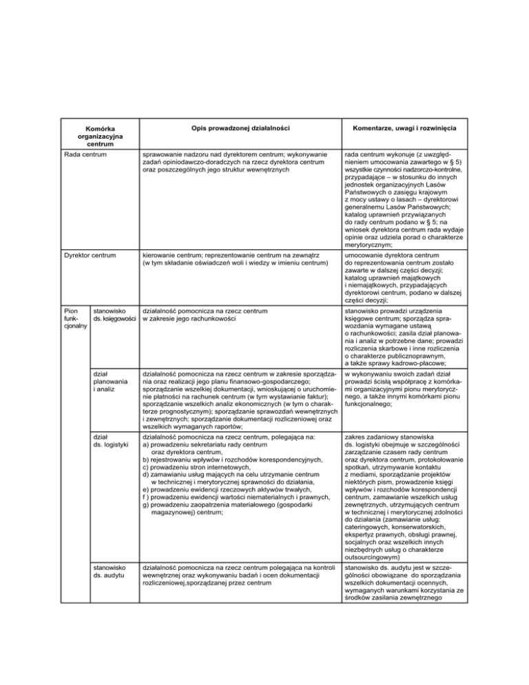 Komórka organizacyjna centrum Opis prowadzonej działalności Komentarze, uwagi i rozwinięcia Rada centrum sprawowanie nadzoru nad dyrektorem centrum; wykonywanie zadań opiniodawczo-doradczych na rzecz dyrektora centrum oraz poszczególnych jego struktur wewnętrznych rada centrum wykonuje (z uwzględnieniem umocowania zawartego w § 5) wszystkie czynności nadzorczo-kontrolne, przypadające – w stosunku do innych jednostek organizacyjnych Lasów Państwowych o zasięgu krajowym z mocy ustawy o lasach – dyrektorowi generalnemu Lasów Państwowych; katalog uprawnień przywiązanych do rady centrum podano w § 5; na wniosek dyrektora centrum rada wydaje opinie oraz udziela porad o charakterze merytorycznym; Dyrektor centrum kierowanie centrum; reprezentowanie centrum na zewnątrz (w tym składanie oświadczeń woli i wiedzy w imieniu centrum) umocowanie dyrektora centrum do reprezentowania centrum zostało zawarte w dalszej części decyzji; katalog uprawnień majątkowych i niemajątkowych, przypadających dyrektorowi centrum, podano w dalszej części decyzji; Pion stanowisko działalność pomocnicza na rzecz centrum funkds. księgowości w zakresie jego rachunkowości cjonalny stanowisko prowadzi urządzenia księgowe centrum; sporządza sprawozdania wymagane ustawą o rachunkowości; zasila dział planowania i analiz w potrzebne dane; prowadzi rozliczenia skarbowe i inne rozliczenia o charakterze publicznoprawnym, a także sprawy kadrowo-płacowe; dział planowania i analiz działalność pomocnicza na rzecz centrum w zakresie sporządzania oraz realizacji jego planu finansowo-gospodarczego; sporządzanie wszelkiej dokumentacji, wnioskującej o uruchomienie płatności na rachunek centrum (w tym wystawianie faktur); sporządzanie wszelkich analiz ekonomicznych (w tym o charakterze prognostycznym); sporządzanie sprawozdań wewnętrznych i zewnętrznych; sporządzanie dokumentacji rozliczeniowej oraz wszelkich wymaganych raportów; w wykonywaniu swoich zadań dział prowadzi ścisłą współpracę z komórkami organizacyjnymi pionu merytorycznego, a także innymi komórkami pionu funkcjonalnego; dział ds. logistyki działalność pomocnicza na rzecz centrum, polegająca na: a) prowadzeniu sekretariatu rady centrum oraz dyrektora centrum, b) rejestrowaniu wpływów i rozchodów korespondencyjnych, c) prowadzeniu stron internetowych, d) zamawianiu usług mających na celu utrzymanie centrum w technicznej i merytorycznej sprawności do działania, e) prowadzeniu ewidencji rzeczowych aktywów trwałych, f ) prowadzeniu ewidencji wartości niematerialnych i prawnych, g) prowadzeniu zaopatrzenia materiałowego (gospodarki magazynowej) centrum; zakres zadaniowy stanowiska ds. logistyki obejmuje w szczególności zarządzanie czasem rady centrum oraz dyrektora centrum, protokołowanie spotkań, utrzymywanie kontaktu z mediami, sporządzanie projektów niektórych pism, prowadzenie księgi wpływów i rozchodów korespondencji centrum, zamawianie wszelkich usług zewnętrznych, utrzymujących centrum w technicznej i merytorycznej zdolności do działania (zamawianie usług: cateringowych, konserwatorskich, ekspertyz prawnych, obsługi prawnej, socjalnych oraz wszelkich innych niezbędnych usług o charakterze outsourcingowym) stanowisko ds. audytu działalność pomocnicza na rzecz centrum polegająca na kontroli wewnętrznej oraz wykonywaniu badań i ocen dokumentacji rozliczeniowej,sporządzanej przez centrum stanowisko ds. audytu jest w szczególności obowiązane do sporządzania wszelkich dokumentacji ocennych, wymaganych warunkami korzystania ze środków zasilania zewnętrznego Pion merytoryczny sekcja zamówień publicznych działalność na rzecz dyrektora generalnego Lasów Państwowych, polegająca na prowadzeniu procesu zamówieniowego w Lasach Państwowych – w każdym przypadku, w którym faktyczne czynności, mające na celu wybór dostawcy, wykonawcy lub usługodawcy, przypadają osobiście dyrektorowi generalnemu Lasów Państwowych szczegółowy sposób wykonywania zadań ustala zarządzenie dyrektora generalnego Lasów Państwowych w sprawie ustalenia sposobu wykonywania w Lasach Państwowych niektórych przepisów „Prawa zamówień publicznych”4 oraz postępowania przy wyborze wykonawców w stanach faktycznych, w których prawa zamówień publicznych się nie stosuje sekcja wdrażania Priorytetu V wykonywanie wszelkich czynności prawnych i faktycznych, zleconych Lasom Państwowym do wykonywania w ramach pomocy udzielanej ministrowi środowiska jako jednostce pośredniczącej w odniesieniu do Sektorowego Programu Operacyjnego Infrastruktura i Środowisko (Priorytet V) enumeratywny katalog zadań oraz szczegółowy sposób realizowania oraz rozliczania zadań, przypadających centrum, jest corocznie utrwalany w porozumieniu (umowie), zawieranej na mocy art. 130 ustawy o finansach publicznych, między ministrem środowiska i dyrektorem generalnym Lasów Państwowych sekcja zarządzania Life+ promowanie programu Life+ przed procesem naboru wniosków; przygotowywanie rocznych projektów krajowych programów prac; prowadzenie naboru wniosków od przyszłych beneficjentów; ocena i wybór wniosków; podpisywanie umów z beneficjentami; monitorowanie realizacji projektów; merytoryczne, formalne i techniczne rozliczanie zakończonych projektów; prowadzenie rozliczeń finansowych z Komisją Europejską; płatności na rzecz beneficjentów; sprawozdawczość wobec Komisji Europejskiej oraz wynikająca z prawa krajowego; prowadzenie baz danych projektów; prowadzenie strony internetowej; pośredniczenie, działanie w imieniu potencjalnych beneficjentów oraz inna pomocniczość w zakresie zapewnienia wkładu środków krajowych; szczegółowy katalog zadań oraz sposób ich realizacji jest ustalany w drodze umowy między dyrektorem centrum i Komisją Europejską; przedmiotem odrębnego uzgodnienia jest umowa o dofinansowanie kosztów osobowych centrum − w części odn