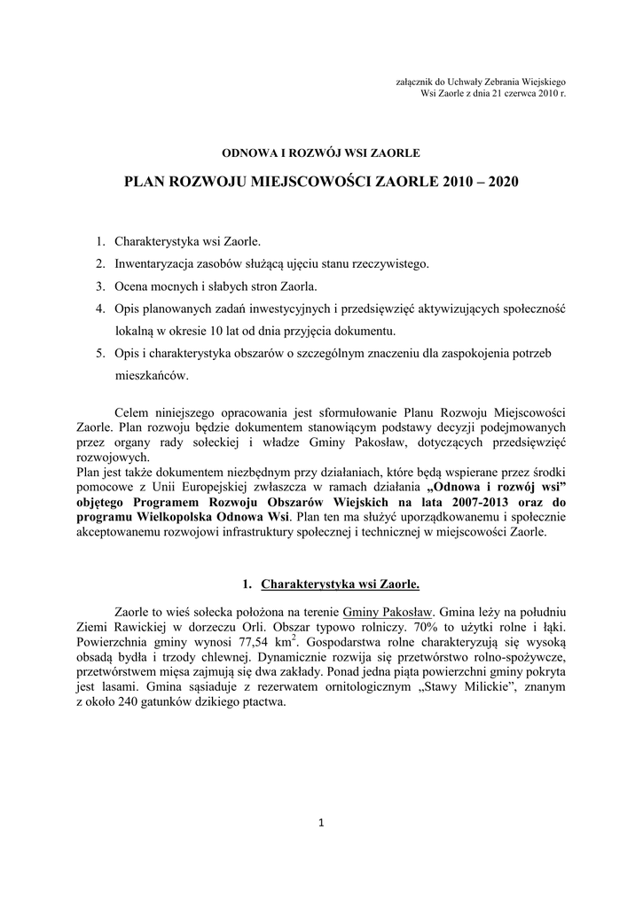 załącznik do Uchwały Zebrania Wiejskiego Wsi Zaorle z dnia 21 czerwca 2010 r. ODNOWA I ROZWÓJ WSI ZAORLE PLAN ROZWOJU MIEJSCOWOŚCI ZAORLE 2010 – 2020 1. Charakterystyka wsi Zaorle. 2. Inwentaryzacja zasobów służącą ujęciu stanu rzeczywistego. 3. Ocena mocnych i słabych stron Zaorla. 4. Opis planowanych zadań inwestycyjnych i przedsięwzięć aktywizujących społeczność lokalną w okresie 10 lat od dnia przyjęcia dokumentu. 5. Opis i charakterystyka obszarów o szczególnym znaczeniu dla zaspokojenia potrzeb mieszkańców. Celem niniejszego opracowania jest sformułowanie Planu Rozwoju Miejscowości Zaorle. Plan rozwoju będzie dokumentem stanowiącym podstawy decyzji podejmowanych przez organy rady sołeckiej i władze Gminy Pakosław, dotyczących przedsięwzięć rozwojowych. Plan jest także dokumentem niezbędnym przy działaniach, które będą wspierane przez środki pomocowe z Unii Europejskiej zwłaszcza w ramach działania „Odnowa i rozwój wsi” objętego Programem Rozwoju Obszarów Wiejskich na lata 2007-2013 oraz do programu Wielkopolska Odnowa Wsi. Plan ten ma służyć uporządkowanemu i społecznie akceptowanemu rozwojowi infrastruktury społecznej i technicznej w miejscowości Zaorle. 1. Charakterystyka wsi Zaorle. Zaorle to wieś sołecka położona na terenie Gminy Pakosław. Gmina leży na południu Ziemi Rawickiej w dorzeczu Orli. Obszar typowo rolniczy. 70% to użytki rolne i łąki. Powierzchnia gminy wynosi 77,54 km2. Gospodarstwa rolne charakteryzują się wysoką obsadą bydła i trzody chlewnej. Dynamicznie rozwija się przetwórstwo rolno-spożywcze, przetwórstwem mięsa zajmują się dwa zakłady. Ponad jedna piąta powierzchni gminy pokryta jest lasami. Gmina sąsiaduje z rezerwatem ornitologicznym „Stawy Milickie”, znanym z około 240 gatunków dzikiego ptactwa. 1 Wieś Zaorle położona jest w odległości 6 km od Pakosławia – stolicy gminy. Zamieszkuje ją 177 osoby. Sołtysem wsi Zaorle jest Stanisław Hańćkowiak. Wspomaga go Rada Sołecka wybrana 15 lutego 2007 roku, która składa się z następujących osób: - Chudzik Jerzy, - Leciejewski Andrzej, - Łęcki Franciszek, - Maciejak Zenon. 2. Inwentaryzacja zasobów służącą ujęciu stanu rzeczywistego. Gmina Pakosław stwarza możliwość rozwoju turystyki wiejskiej w nieskażonym odpadami przemysłowymi środowisku naturalnym. Najbardziej znaną atrakcją turystyczną jest Stadnina Koni „Golejewko” z muzeum powozów uznawanych za drugie po Łańcucie, z salą nagród zdobytych przez golejewskie konie oraz jedyną w Europie aleją zasłużonych koni. Warto odwiedzić też zespoły parkowo – pałacowe w Osieku i Pakosławiu. Szansą rozwoju turystyki aktywnej w gminie jest turystyka konna i rowerowa. Gospodarstwa agroturystyczne i rancza konne mają ofertę wypoczynku weekendowego, z wykorzystaniem szlaku konnego i tras rowerowych: lokalnego „Szlaku Miodowego”, wielkopolskiego szlaku rowerowego pod nazwą „Ziemiański Szlak Rowerowy” oraz Międzynarodowego Szlaku Rowerowego R-9 Euro-Velo. Nad rzeką Orlą powstał zbiornik retencyjny (zalew) ochraniający dolinę rzeki przed powodzią i służący do gromadzenia wody „Pakosław”. Zbiornik retencyjny (zalew) „Pakosław” z przylegającym terenem będzie służył jednocześnie 2 wypoczynkowi i rekreacji. Przewidywane jest od 2009 roku urządzenie kąpieliska, przystani dla jednostek pływających oraz spływów kajakowych na rzece Orli. Miejscowość Pakosław od kilku lat, współdziałając ściśle z Samorządem Gminnym, kieruje swoje działania na wykorzystanie swoich walorów do promowania turystyki wiejskiej oraz aktywnych form spędzania wolnego czasu. W związku z tym podjęto działania zmierzające do powiększenia posiadanej bazy sportowej i uatrakcyjnienia bazy turystycznej. Inwentaryzacja zasobów miejscowości Zaorle, które sprzyjają uprawianiu sportu i turystyce: a) Przez miejscowość Zaorle przebiega Ziemiański Szlak Rowerowy – trasa rowerowa ukazująca wiele ciekawostek krajoznawczych, architektonicznych i przyrodniczych. Szlak powstał pod patronatem m.in. Urzędu Marszałkowskiego Województwa Wielkopolskiego. b) Przez miejscowość Zaorle przebiega Szlak Rajdu Konnego „Wielkopolska Podkowa” – wytyczony został na terenie Międzygminnego Związku Turystycznego „Wielkopolska Gościnna". Przebiega on przez teren siedmiu gmin: Poniec, Krobia, Pępowo (powiat gostyński), Kobylin (powiat krotoszyński), Jutrosin, Pakosław, Miejska Górka (powiat rawicki). c) Międzynarodowy Szlak Rowerowy R9 (w powiecie liczy ok. 26 km) Międzynarodowa trasa R-9 z Chorwacji do Gdańska liczy 1930 kilometrów. Została wyłączona z Europejskiego Systemu Szlaków Rowerowych Euro-Velo. Trasy te obsługują dalekodystansową, międzynarodową turystykę rowerową, ale służą także lokalnym społecznościom i regionom. Ich odcinki przecinające poszczególne miasta mogą i powinny obsługiwać lokalny ruch rekreacyjny, umożliwiając bezpieczne weekendowe wyjazdy poza miasto, a także regionalną turystykę rowerową. d) W 2010 Zaorlu powstała Aleja Dębów Smoleńskich, upamiętniająca ofiary katastrowy prezydenckiego samolotu z 10 kwietnia 2010 roku i Zbrodni Katyńskiej z 1940 roku. Posadzono na niej 96 drzew- tyle ile było ofiar tragedii pod Smoleńskiem. Przy alei stoi tablica pamiątkowa. Na tablicy umieszczono zdjęcia prezydenckiej pary i nazwiska pozostałych osób, które zginęły pod Smoleńskiem. Istniejąca baza turystyczno – sportowa może być solidnym fundamentem pod zachęcenie turystów do częstszego odwiedzania terenów gminy, a mieszkańców do aktywnego wypoczynku. 3. Ocena mocnych i słabych stron Zaorla. Słabe strony 1. Słaba jakość nawierzchni dróg 2. Brak chodników 3. Brak miejsc pracy na miejscu 4. Ucieczka ludzi młodych 5. Brak boiska sportowego 6. Brak zagospodarowanego placu zabaw 7. Estetyka wsi 8. Niepełna kanalizacji wsi Silne strony 1. Aktyw