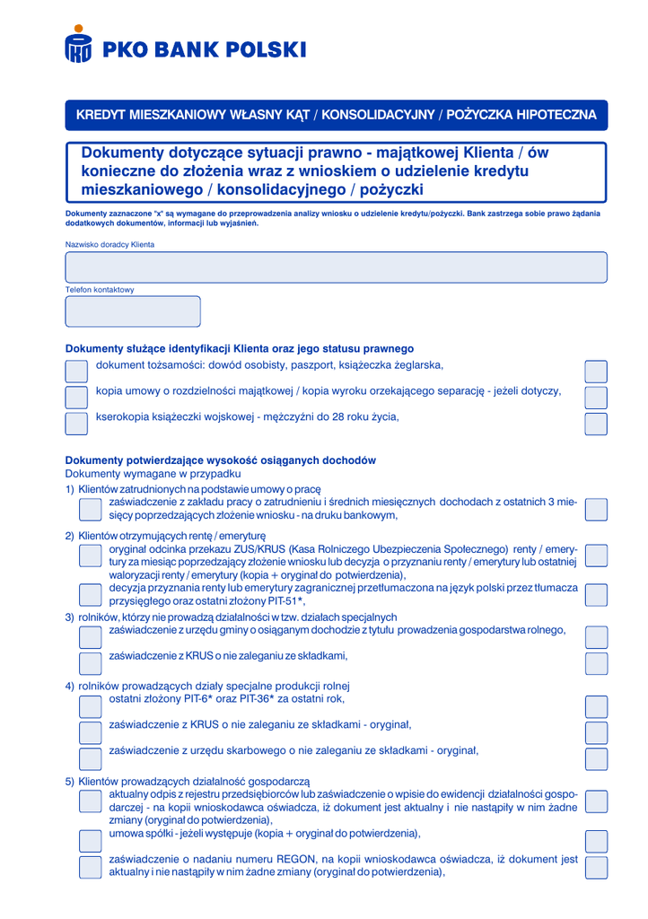 KREDYT MIESZKANIOWY W£ASNY K¥T / KONSOLIDACYJNY / PO¯YCZKA HIPOTECZNA RACHUNEK TYPU PARTNER Dokumenty dotycz¹ce sytuacji prawno - maj¹tkowej Klienta / ów konieczne do z³o¿enia wraz z wnioskiem o udzielenie kredytu mieszkaniowego / konsolidacyjnego / po¿yczki Dokumenty zaznaczone "x" s¹ wymagane do przeprowadzenia analizy wniosku o udzielenie kredytu/po¿yczki. Bank zastrzega sobie prawo ¿¹dania dodatkowych dokumentów, informacji lub wyjaœnieñ. Nazwisko doradcy Klienta Telefon kontaktowy Dokumenty s³u¿¹ce identyfikacji Klienta oraz jego statusu prawnego dokument to¿samoœci: dowód osobisty, paszport, ksi¹¿eczka ¿eglarska, kopia umowy o rozdzielnoœci maj¹tkowej / kopia wyroku orzekaj¹cego separacjê - je¿eli dotyczy, kserokopia ksi¹¿eczki wojskowej - mê¿czyŸni do 28 roku ¿ycia, Dokumenty potwierdzaj¹ce wysokoœæ osi¹ganych dochodów Dokumenty wymagane w przypadku 1) Klientów zatrudnionych na podstawie umowy o pracê zaœwiadczenie z zak³adu pracy o zatrudnieniu i œrednich miesiêcznych dochodach z ostatnich 3 miesiêcy poprzedzaj¹cych z³o¿enie wniosku - na druku bankowym, 2) Klientów otrzymuj¹cych rentê / emeryturê orygina³ odcinka przekazu ZUS/KRUS (Kasa Rolniczego Ubezpieczenia Spo³ecznego) renty / emerytury za miesi¹c poprzedzaj¹cy z³o¿enie wniosku lub decyzja o przyznaniu renty / emerytury lub ostatniej waloryzacji renty / emerytury (kopia + orygina³ do potwierdzenia), decyzja przyznania renty lub emerytury zagranicznej przet³umaczona na jêzyk polski przez t³umacza przysiêg³ego oraz ostatni z³o¿ony PIT-51*, 3) rolników, którzy nie prowadz¹ dzia³alnoœci w tzw. dzia³ach specjalnych zaœwiadczenie z urzêdu gminy o osi¹ganym dochodzie z tytu³u prowadzenia gospodarstwa rolnego, zaœwiadczenie z KRUS o nie zaleganiu ze sk³adkami, 4) rolników prowadz¹cych dzia³y specjalne produkcji rolnej ostatni z³o¿ony PIT-6* oraz PIT-36* za ostatni rok, zaœwiadczenie z KRUS o nie zaleganiu ze sk³adkami - orygina³, zaœwiadczenie z urzêdu skarbowego o nie zaleganiu ze sk³adkami - orygina³, 5) Klientów prowadz¹cych dzia³alnoœæ gospodarcz¹ aktualny odpis z rejestru przedsiêbiorców lub zaœwiadczenie o wpisie do ewidencji dzia³alnoœci gospodarczej - na kopii wnioskodawca oœwiadcza, i¿ dokument jest aktualny i nie nast¹pi³y w nim ¿adne zmiany (orygina³ do potwierdzenia), umowa spó³ki - je¿eli wystêpuje (kopia + orygina³ do potwierdzenia), zaœwiadczenie o nadaniu numeru REGON, na kopii wnioskodawca oœwiadcza, i¿ dokument jest aktualny i nie nast¹pi³y w nim ¿adne zmiany (orygina³ do potwierdzenia), zaœwiadczenie o nadaniu numeru NIP (kopia + orygina³ do potwierdzenia), zaœwiadczenie z urzêdu skarbowego o nie zaleganiu ze zobowi¹zaniami podatkowymi - orygina³ nie starszy ni¿ miesi¹c, zaœwiadczenie z ZUS o nie zaleganiu ze zobowi¹zaniami z tytu³u sk³adek na ubezpieczenie spo³eczne - orygina³ nie starszy ni¿ miesi¹c, Ponadto a) przy karcie podatkowej decyzja urzêdu skarbowego ustalaj¹ca wysokoœæ podatku na dany rok (kopia + orygina³ do potwierdzenia), oœwiadczenie o wysokoœci œrednich miesiêcznych dochodów po opodatkowaniu i op³aceniu sk³adek ubezpieczenia spo³ecznego za okres co najmniej ostatnich 6 miesiêcy - pisemne, b) przy rycza³cie ewidencjonowanym potwierdzona przez urz¹d skarbowy informacja roczna (za rok ubieg³y) o wysokoœci uzyskanego przychodu ub PIT-28*, oœwiadczenie o wysokoœci œrednich miesiêcznych dochodów po opodatkowaniu i op³aceniu sk³adek ubezpieczenia spo³ecznego za okres co najmniej ostatnich 6 miesiêcy - pisemne, ksiêga przychodów - do wgl¹du, c) przy ksiêdze przychodów i rozchodów zaœwiadczenie z urzêdu skarbowego o wysokoœci dochodów do opodatkowania za okres bie¿¹cy lub aktualny PIT-5*, deklaracja podatkowa PIT* za rok ubieg³y (lub PIT-5* z 11 m-cy je¿eli deklaracja roczna nie zosta³a jeszcze z³o¿ona), ksiêga przychodów i rozchodów - do wgl¹du, d) przy pe³nej ksiêgowoœci zaœwiadczenie z urzêdu skarbowego o wysokoœci dochodów i nale¿nych podatków za okres roku bie¿¹cego lub aktualny PIT-5* (lub PIT-5* z 11 m-cy je¿eli deklaracja roczna nie zosta³a jeszcze z³o¿ona), deklaracja podatkowa PIT* za rok ubieg³y, inne dokumenty, które dotycz¹ kredytobiorcy (bilans, rachunek wyników), 6) sta³ych dochodów osi¹ganych z innych Ÿróde³ ni¿ wy¿ej wymienione pisemne oœwiadczenie o wysokoœci œrednich miesiêcznych dochodów po opodatkowaniu za okres ostatnich 12 miesiêcy, deklaracja podatkowa PIT* za okres bie¿¹cy i rok ubieg³y, dokumenty potwierdzaj¹ce wysokoœæ uzyskiwanych dochodów (np. umowy o dzie³o, kontrakty, umowy zlecenia, umowy najmu itp.) - kserokopia + orygina³ do potwierdzenia , zaœwiadczenia z urzêdu skarbowego i ZUS o nie zaleganiu ze zobowi¹zaniami, 7) Klientów osi¹gaj¹cych dochody za granic¹ (dokumenty powinny byæ przet³umaczone na jêzyk polski przez t³umacza przysiêg³ego) zezwolenie na pracê w danym kraju, umowa o pracê, zaœwiadczenie o dochodach wydane przez pracodawcê - zgodnie z wymogami w³aœciwymi dla osób zatrudnionych w Polsce - wystawione na kwotê netto i nie starsze ni¿ miesi¹c, * w przypadku sk³adania deklaracji podatkowej PIT nale¿y z³o¿yæ kserokopiê deklaracji, która posiada oryginaln¹ pieczêæ urzêdu skarbowego „wp³ynê³o dnia ...”, lub zosta³a potwierdzona przez urz¹d skarbowy za zgodnoœæ z orygina³em. zaznacz w³aœciwe Dokumenty dotycz¹ce przedmiotu kredytowania Dokumenty wymagane w przypadku wnioskowania o udzielenie kredytu na 1) budowê domu / lokalu / gara¿u / ma³ej architektury / ogrodzenia, zagospodarowanie dzia³ki rekreacyjnej / budowlanej stan prawny gruntu - wypis z Ksiêgi Wieczystej (w przypadku budowy domu letniskowego na dzia³ce rekreacyjnej - zaœwiadczenie z Urzêdu Gminy / Miasta o warunkach zabudowy dzia³ki rekreacyjnej) - nie starszy ni¿ 3 miesi¹ce, pozwolenie na budowê (dla obiektów nie wymagaj¹