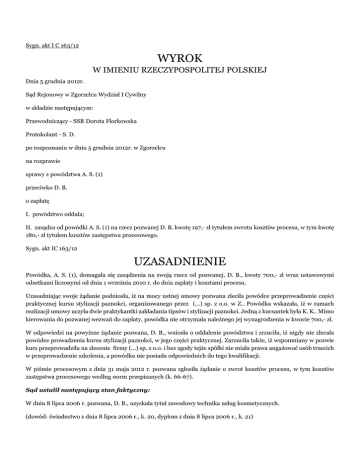 Sygn. akt I C 163/12 WYROK W IMIENIU RZECZYPOSPOLITEJ POLSKIEJ Dnia 5 grudnia 2012r. Sąd Rejonowy w Zgorzelcu Wydział I Cywilny w składzie następującym: Przewodniczący - SSR Dorota Florkowska Protokolant - S. D. po rozpoznaniu w dniu 5 grudnia 2012r. w Zgorzelcu na rozprawie sprawy z powództwa A. S. (1) przeciwko D. B. o zapłatę I. powództwo oddala; II. zasądza od powódki A. S. (1) na rzecz pozwanej D. B. kwotę 197,- zł tytułem zwrotu kosztów procesu, w tym kwotę 180,- zł tytułem kosztów zastępstwa procesowego. Sygn. akt IC 163/12 UZASADNIENIE Powódka, A. S. (1), domagała się zasądzenia na swoją rzecz od pozwanej, D. B., kwoty 700,- zł wraz ustawowymi odsetkami liczonymi od dnia 1 września 2010 r. do dnia zapłaty i kosztami procesu. Uzasadniając swoje żądanie podniosła, iż na mocy ustnej umowy pozwana zleciła powódce przeprowadzenie części praktycznej kursu stylizacji paznokci, organizowanego przez (...) sp. z o.o. w Z.. Powódka wskazała, iż w ramach realizacji umowy uczyła dwie praktykantki zakładania tipsów i stylizacji paznokci. Jedną z kursantek była K. K.. Mimo kierowania do pozwanej wezwań do zapłaty, powódka nie otrzymała należnego jej wynagrodzenia w kwocie 700,- zł. W odpowiedzi na powyższe żądanie pozwana, D. B., wniosła o oddalenie powództwa i zrzuciła, iż nigdy nie zlecała powódce prowadzenia kursu stylizacji paznokci, w jego części praktycznej. Zarzuciła także, iż wspomniany w pozwie kurs przeprowadziła na zlecenie firmy (...) sp. z o.o. i bez zgody tejże spółki nie miała prawa angażować osób trzecich w przeprowadzenie szkolenia, a powódka nie posiada odpowiednich do tego kwalifikacji. W piśmie procesowym z dnia 31 maja 2012 r. pozwana zgłosiła żądanie o zwrot kosztów procesu, w tym kosztów zastępstwa procesowego według norm przepisanych (k. 66-67). Sąd ustalił następujący stan faktyczny: W dniu 8 lipca 2006 r. pozwana, D. B., uzyskała tytuł zawodowy technika usług kosmetycznych. (dowód: świadectwo z dnia 8 lipca 2006 r., k. 20, dyplom z dnia 8 lipca 2006 r., k. 21) Pozwana wynajmowała od N. H. pomieszczenie w lokalu użytkowym przy ul. (...) w Z., w którym świadczyła usługi kosmetyczne. Po rozwiązaniu umowy najmu lokalu przez N. H., w dniu 3 marca 2010 r., pozwana zawiesiła działalność gospodarczą. (dowód: zeznania świadka N. H., k. 71, zeznania pozwanej D. B., k. 121) W dniu 23 sierpnia 2010 r. pozwana, D. B., zawarła z (...) sp. z o.o. w Z. umowę o dzieło, której przedmiotem było przygotowanie skryptów i zestawów do ćwiczeń na cele szkolenia w zakresie stylizacji paznokci i pielęgnacji dłoni oraz przeprowadzenie szkolenia (dla osób skierowanych z MOPS N.) do dnia 17 września 2010 r.. Spółka ta, jako realizator projektu Powiatowego Urzędu Pracy w Z. „Wyższe kwalifikacje szansą na lepsze jutro”, zleciła także pozwanej przeprowadzenie szkolenia w zakresie wizażu, stylizacji paznokci oraz podstaw przedsiębiorczości, który odbył się w okresie od 23 sierpnia 2010 r. do 5 października 2010 r. w salonie przy ul. (...) w Z., przy czym w dniach 30.08.2010 r., 31.08.2010 r., 1.09.2010 r. zajęcia zostały przeprowadzone przez A. S. (2) i I. F.. W kursie tym uczestniczyło 8 kursantek. Kurs dla osób skierowanych z MOPS N., tj. K. K. i M. W., pozwana przeprowadziła w dniach 30.08.2010 r., 31.08.2010 r., 01.09.2010 r., 08.09.2010 r., 09.09.2010 r., 16.09.2010 r., natomiast w dniu 17.09.2010 r. uczestniczki kursu złożyły egzamin i otrzymały zaświadczenia o jego ukończeniu. Zajęcia teoretyczne odbyły się w siedzibie (...) sp. z o.o. w Z. przy ul. (...). Część praktyczną kursu pozwana przeprowadziła w salonie położonym w Z. przy ul. (...). (dowód: umowa z dnia 23 sierpnia 2010 r., k. 36, pismo PUP z dnia 25 października 2012 r., k. 108, harmonogram szkolenia, k. 109-113, zaświadczenie z dnia 17 września 2010 r., k. 8, notatki z terminarza pozwanej, k. 28-33, zeznania świadka K. K., k.71-72, zeznania pozwanej D. B., k. 121-122) W dniu 17 września 2010 r. K. K. otrzymała zaświadczenie o ukończeniu kursu pielęgnacji dłoni i stylizacji paznokci, odbytego w okresie od 30 sierpnia 2010 r. do 16 września 2010 r.. (dowód: zaświadczenie z dnia 17 września 2010 r., k. 8) Sąd zważył, co następuje: Wobec zaprzeczenia przez pozwaną twierdzeniom powódki przytoczonym w uzasadnieniu pozwu – w myśl art. 232 kpc – to na powódce spoczywał ciężar przedstawienia środków dowodowych w celu wykazania ich prawdziwości. Zdaniem Sądu, powódka – jako strona obciążona dowodem (vide: art. 6 kc) – nie wykazała swoich twierdzeń w sposób przekonujący, dlatego też zostały one pominięte w ustaleniach faktycznych. Za wystarczający dowód prawdziwości sformułowanych przez powódkę twierdzeń o łączącej strony umowie nie sposób było przyjąć zeznań świadka, N. H., która swoją ogólnikową wiedzę w tym zakresie opierała wyłącznie na relacjach powódki. Zeznania kolejnego z zawnioskowanych przez powódkę świadków, K. K., pozostawały natomiast w sprzeczności z jej twierdzeniami. K. K. – zeznając w sprawie dwukrotnie – konsekwentnie wskazywała na pozwaną, D. B., jako osobę, która przeprowadziła w całości kurs stylizacji paznokci dla osób skierowanych przez MOPS N.. Treść zeznań świadka korelowała z zeznaniami pozwanej, D. B., a ich wiarygodności nie podważało zarejestrowane przez powódkę bez zgody i wiedzy świadka nagranie prywatnej rozmowy, które należało ocenić jako godzące w konstytucyjną zasadę swobody i ochrony komunikowania się (vide: art. 49 Konstytucji Rzeczypospolitej Polskiej). Ponieważ pozwana sprzeciwiła się przeprowadzeniu podstępnie pozyskanemu przez powódkę dowodowi na okoliczności, z których ta wywodziła skutki prawne, Sąd dopuścił dowód z nagrania (k. 92) wyłącznie w celu weryfikacji wiarygodności zeznań świadka, K. K. (vide: wyrok SA w Pozna